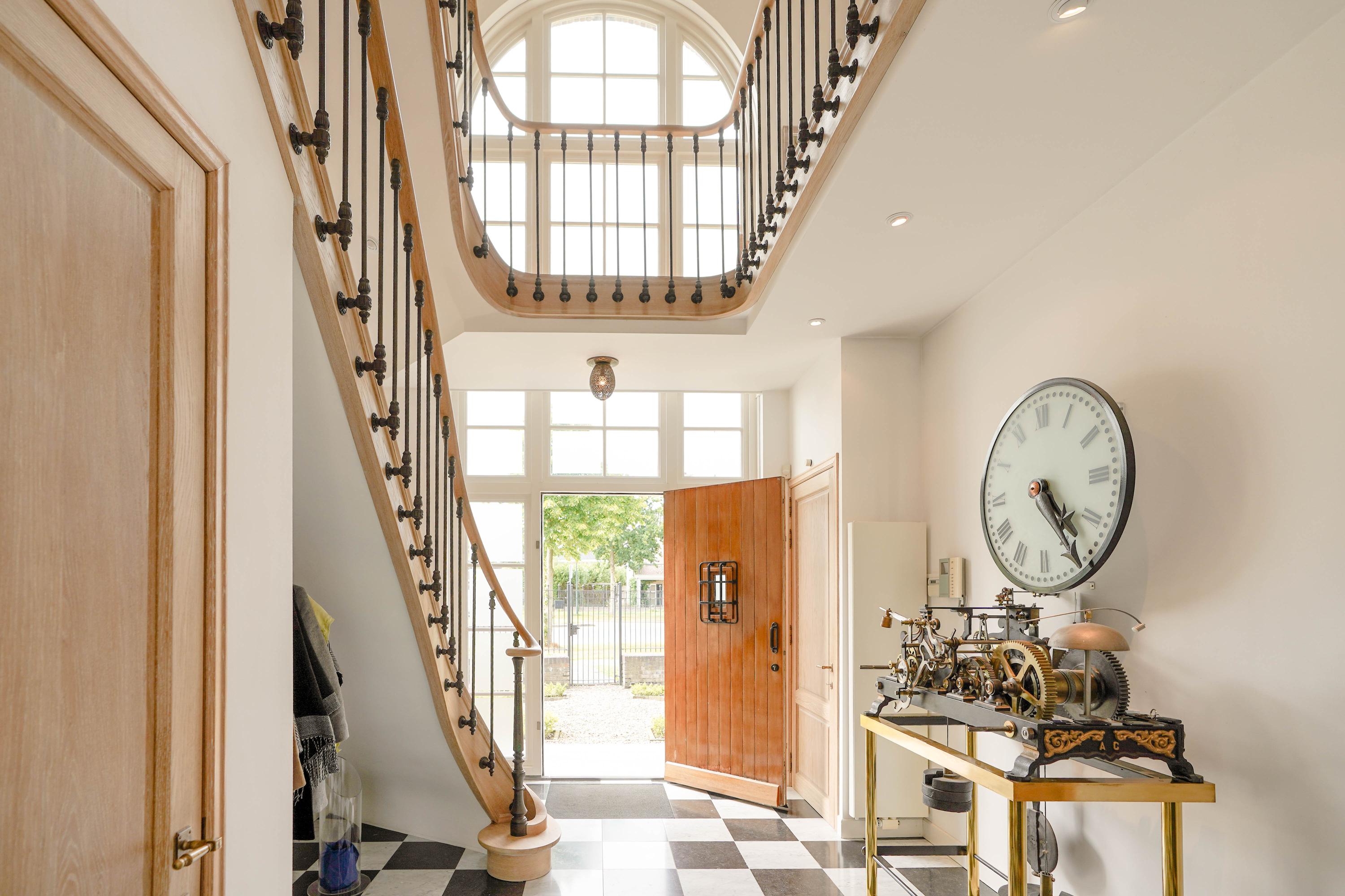 De entreehal maakt direct indruk met een fraai gesculptureerde, eiken trappartij. Vanaf de begane grond loopt een massief eiken leuning in één ononderbroken stuk door tot en met de bovenste etage, gedragen door 87 gepatineerde, gietijzeren zijbalusters. Een meesterwerk van de befaamde Belgische trappenmaker Luc Steels. Hij vervaardigde ook de eiken paneeldeuren en sponningen in het hele huis. In de hal bevinden zich het toilet en de meterkast. Het lichtvenster in het dak boven in de vide zorgt samen met de grote glaspui voor optimaal daglicht op alle etages.