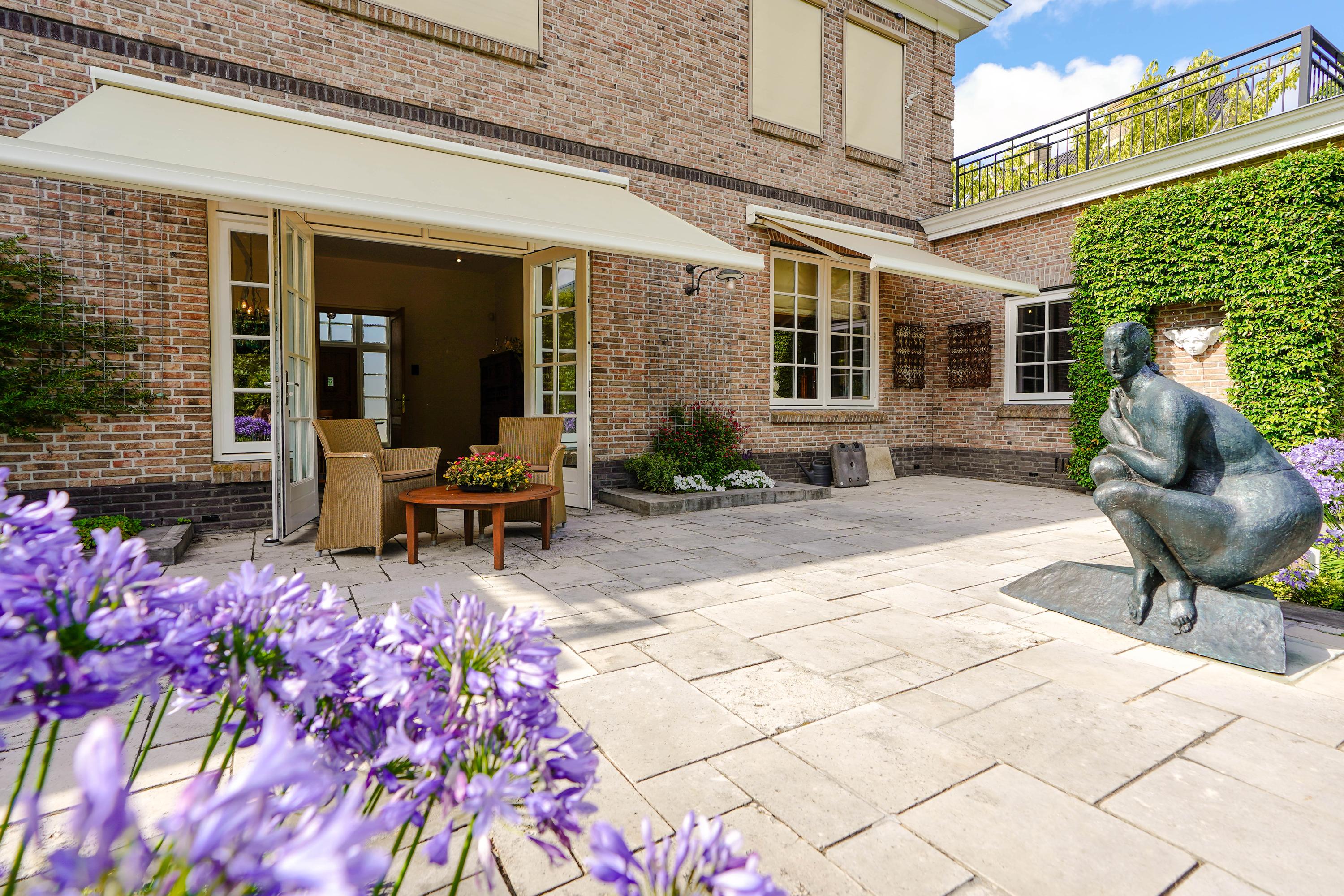 De zeer waardevolle siertuin voegt een bijzondere beleving toe aan het wonen in deze villa. De voortuin, geometrisch aangelegd in klassieke stijl, is een representatieve binnenkomer. De brede zijtuinen langs het huis zijn royaal beplant, met hagen, struiken en bomen. In de achtertuin zorgt een 3,5 meter hoge kraag van 24 wintergroene steeneiken langs de erfafscheiding het hele jaar door voor maximale privacy. Op het terras van 46 m2 is het heerlijk zonnen én feesten. Als het ijzeren prieel 's zomers versierd is met bloemborders, klimrozen en hanging baskets, is het er aangenaam toeven aan de buitentafel. De Franse fontein aan de rechterzijde en het Italiaanse fonteintje aan het terras zijn verfrissende elementen in de zomerse tuin. De bronzen sculpturen zijn apart te koop.
