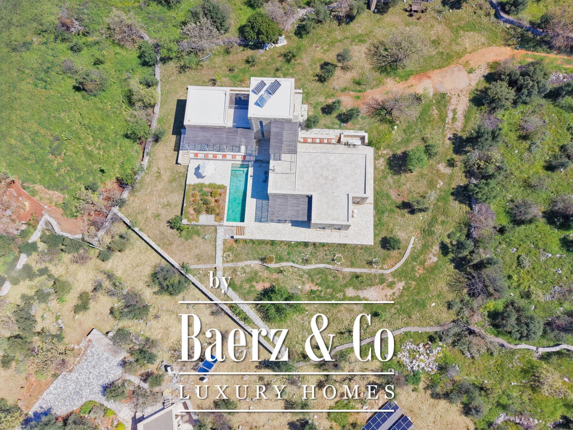 With four bedrooms and five bathrooms in total, the layout is designed for flexible use: spaces for guests, independent living quarters, and a generous main residence. The interiors are bright and sunlit, finished with stone flooring and wooden window frames, and comfort is ensured through underfloor heating, heat pump, per-level climate control, and full air conditioning. The villa is rated energy class B+ and features double glazing for insulation.