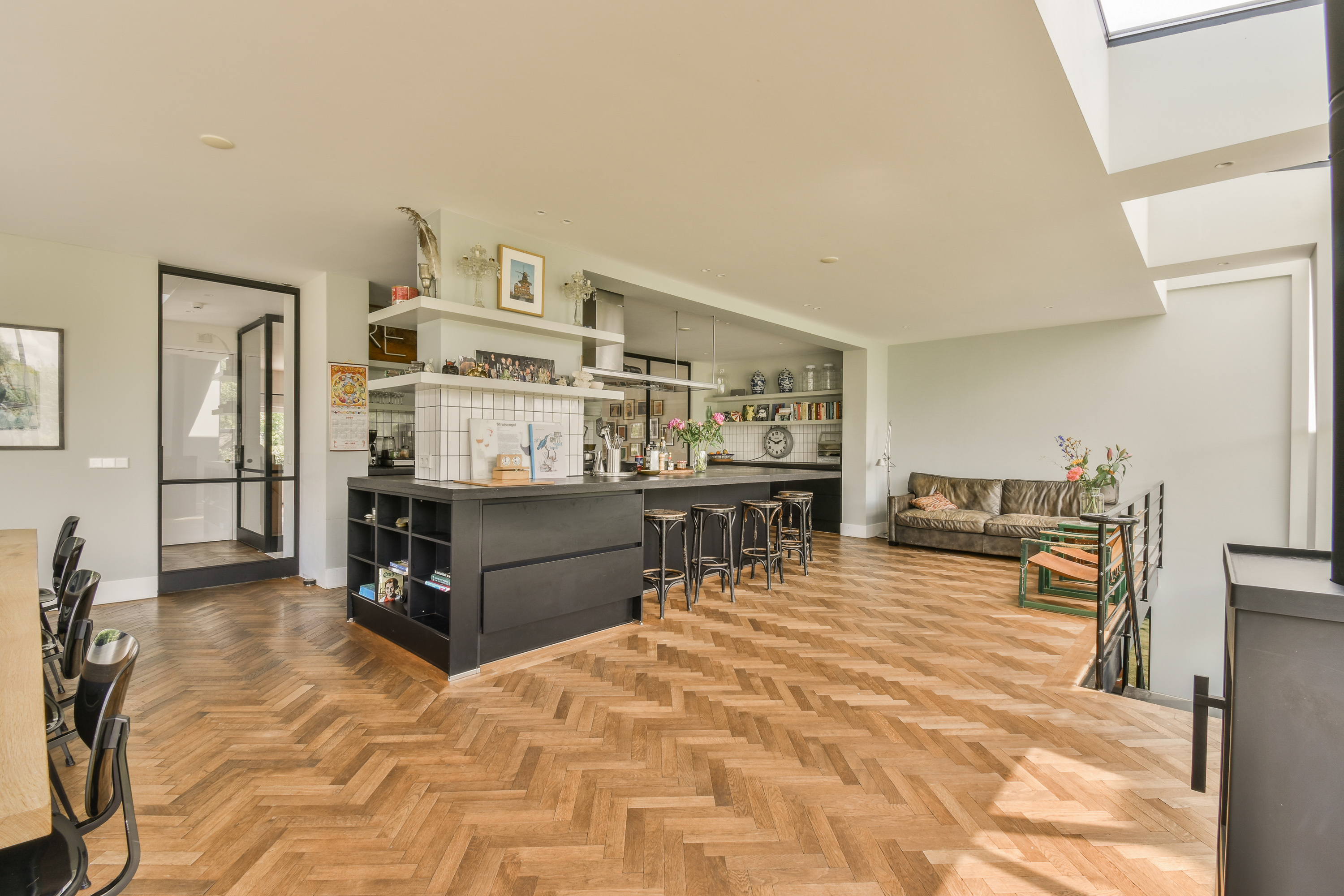 A staircase leads to the first floor, where peace and privacy are key. At the front of the home is the spacious bedroom, offering panoramic views of the Amstel. This room includes a large walk-in closet and a luxurious en-suite bathroom with a freestanding bathtub, double vanity, walk-in shower and toilet. At the rear is a second large bedroom, also with an en-suit bathroom. This bathroom is equipped with a double sink, walk-in shower and toilet. A bright landing connects the rooms and enhances the overall sense of space and refinement.