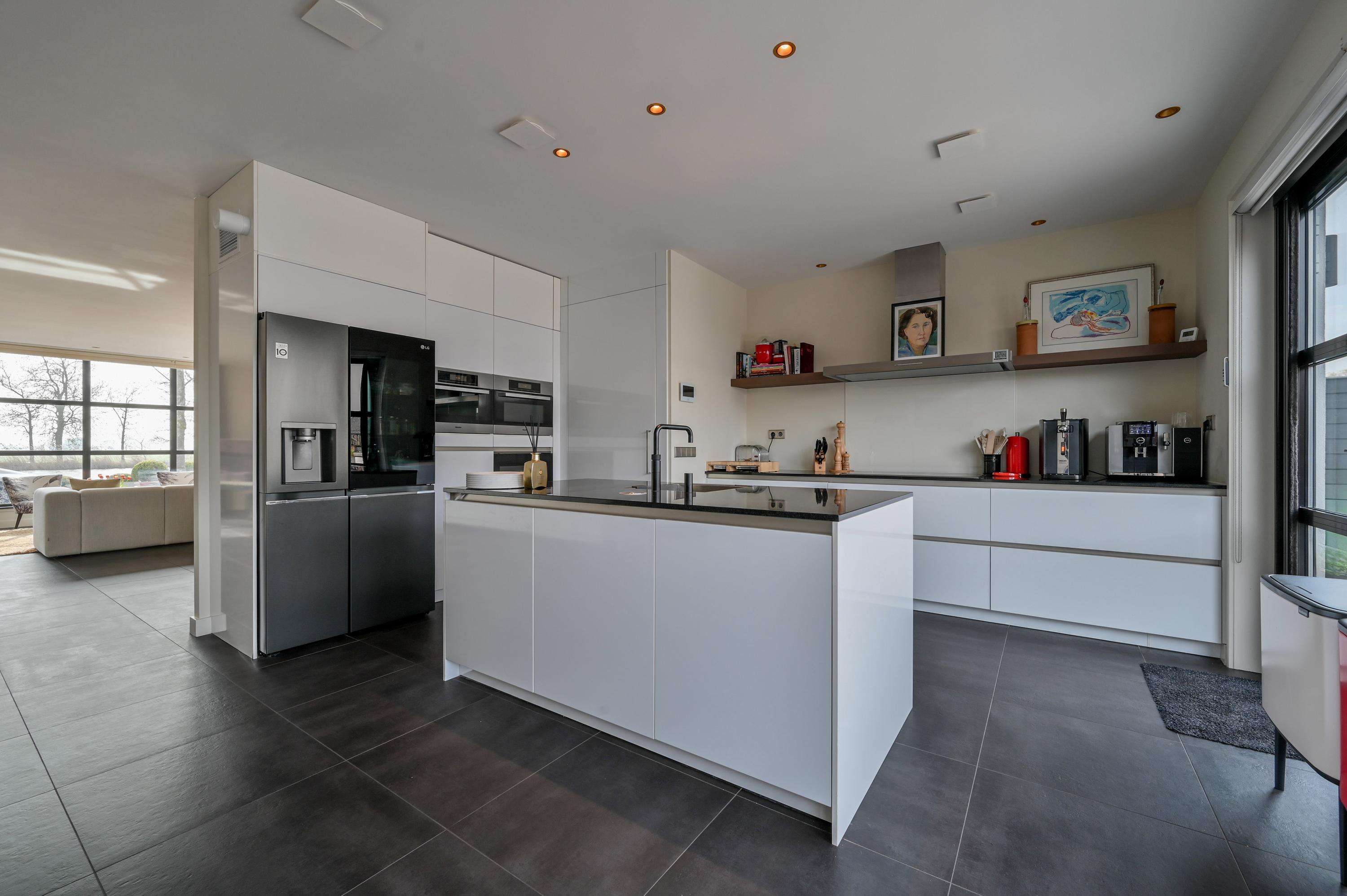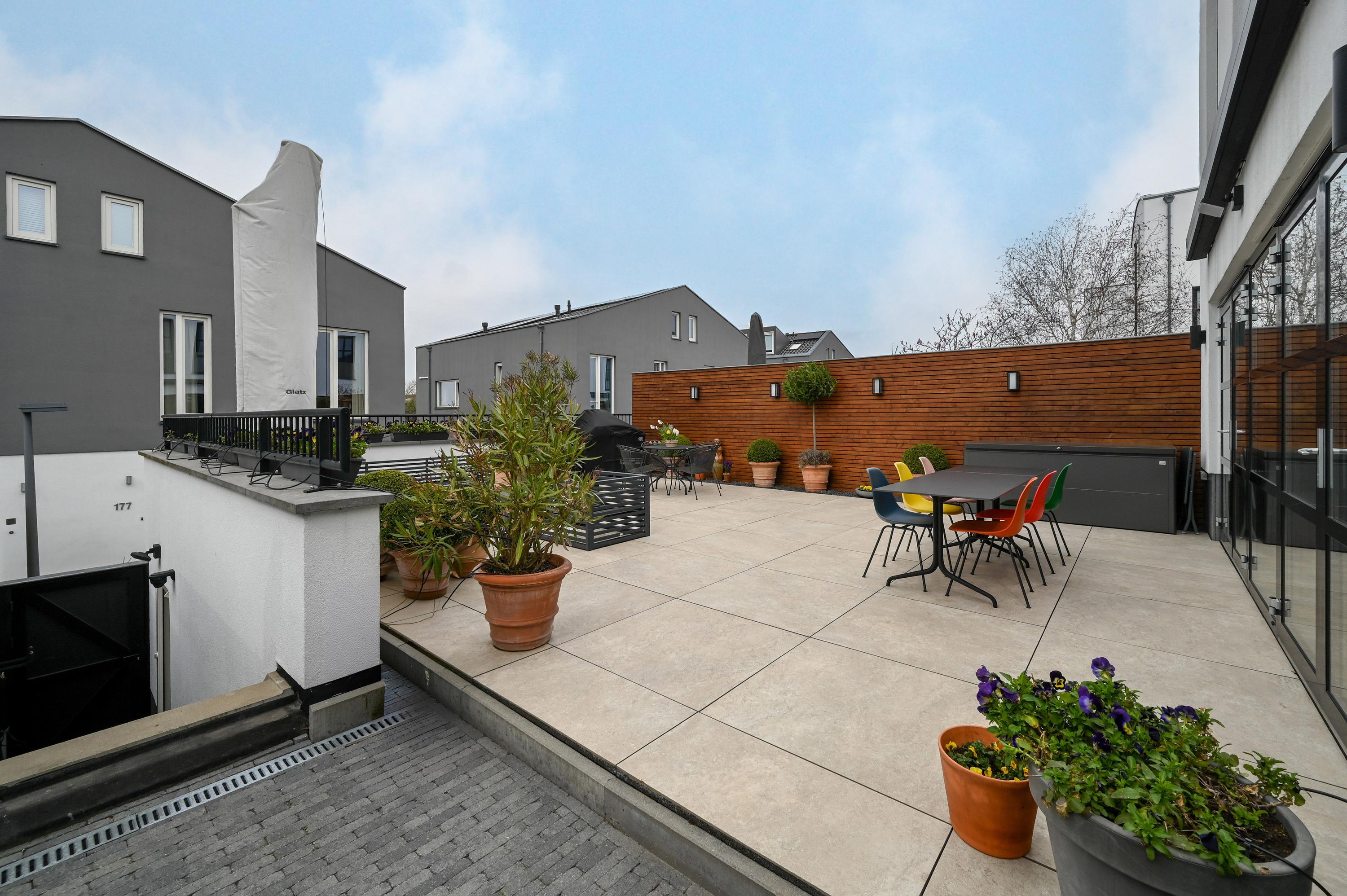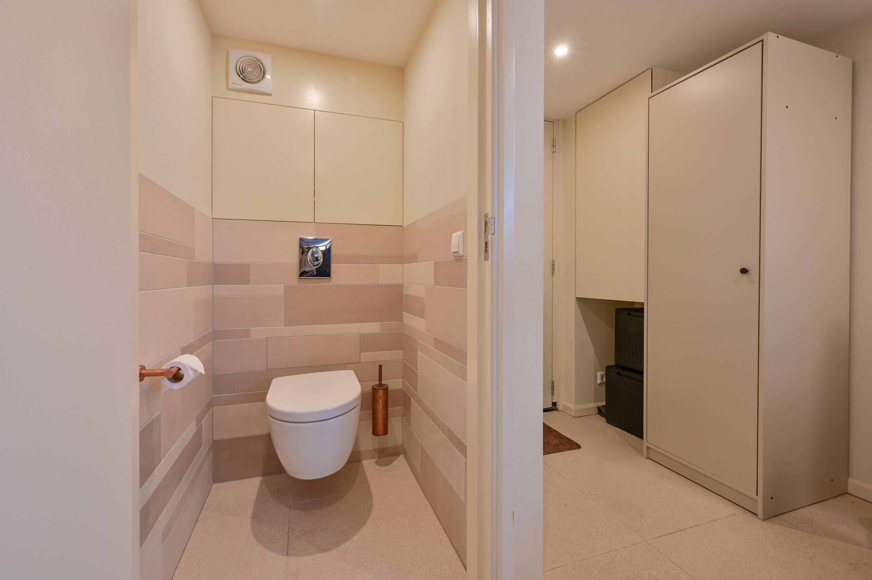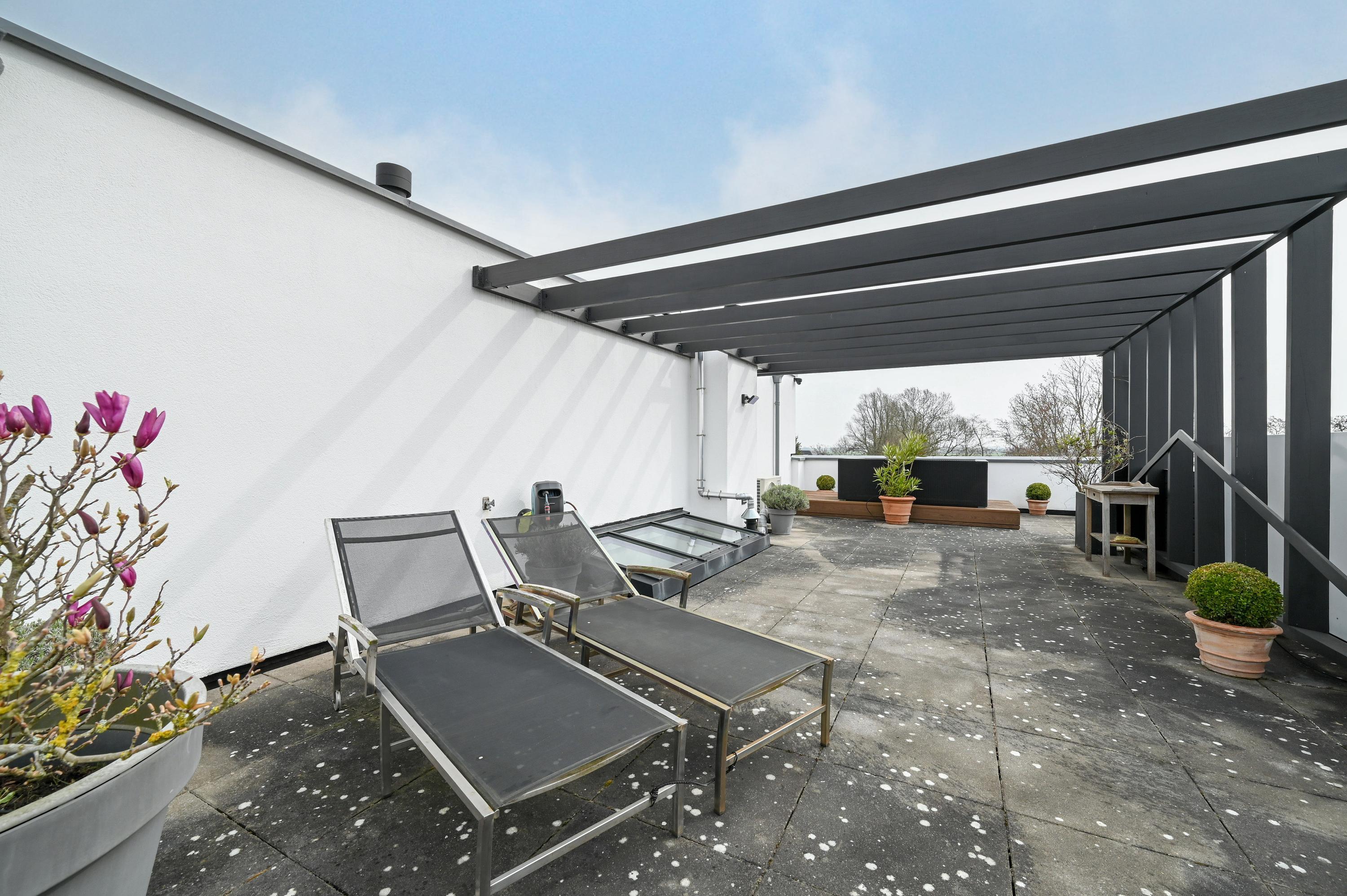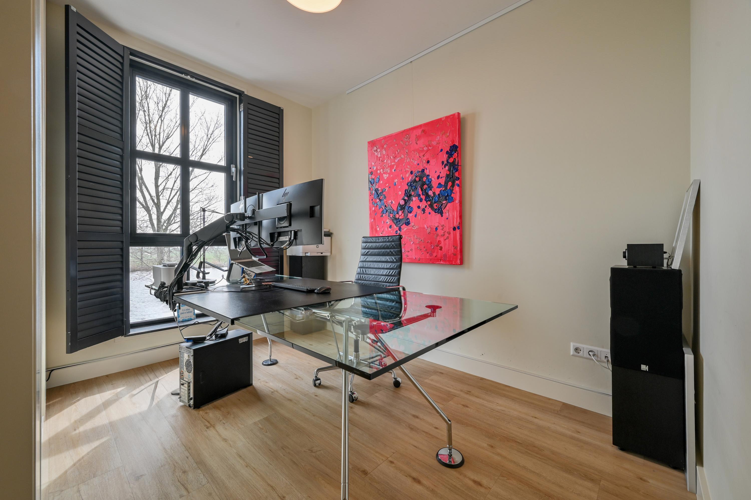The second floor reveals a rooftop terrace with unobstructed views over the Amstel and polder, enriched by a pergola, integrated lighting, and water connection, creating an inviting setting for quiet reflection or hosting guests. Beneath the house, the garage is configured as a versatile studio, complete with kitchen, toilet, underfloor heating, and air conditioning, accessible via both the terrace and an electric entry.