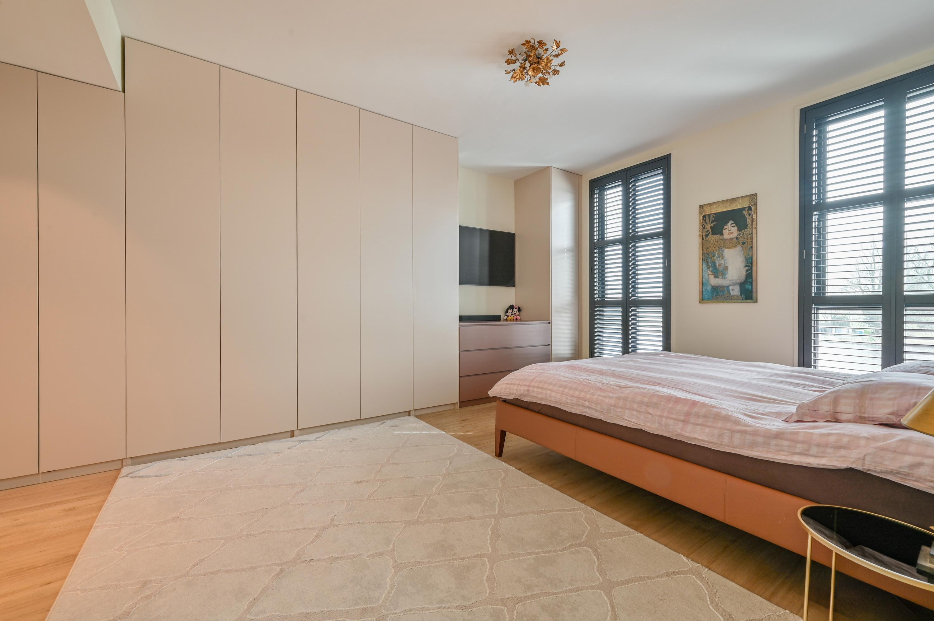 The first floor accommodates four bedrooms and two bathrooms, each equipped for year round comfort with air conditioning and abundant natural light. The ensuite master features a bespoke wardrobe and elegant bathroom, designed with light tiles, double shower, and advanced fixtures. A practical utility room, intelligent storage solutions, and a dedicated study ensure functionality without compromise.
