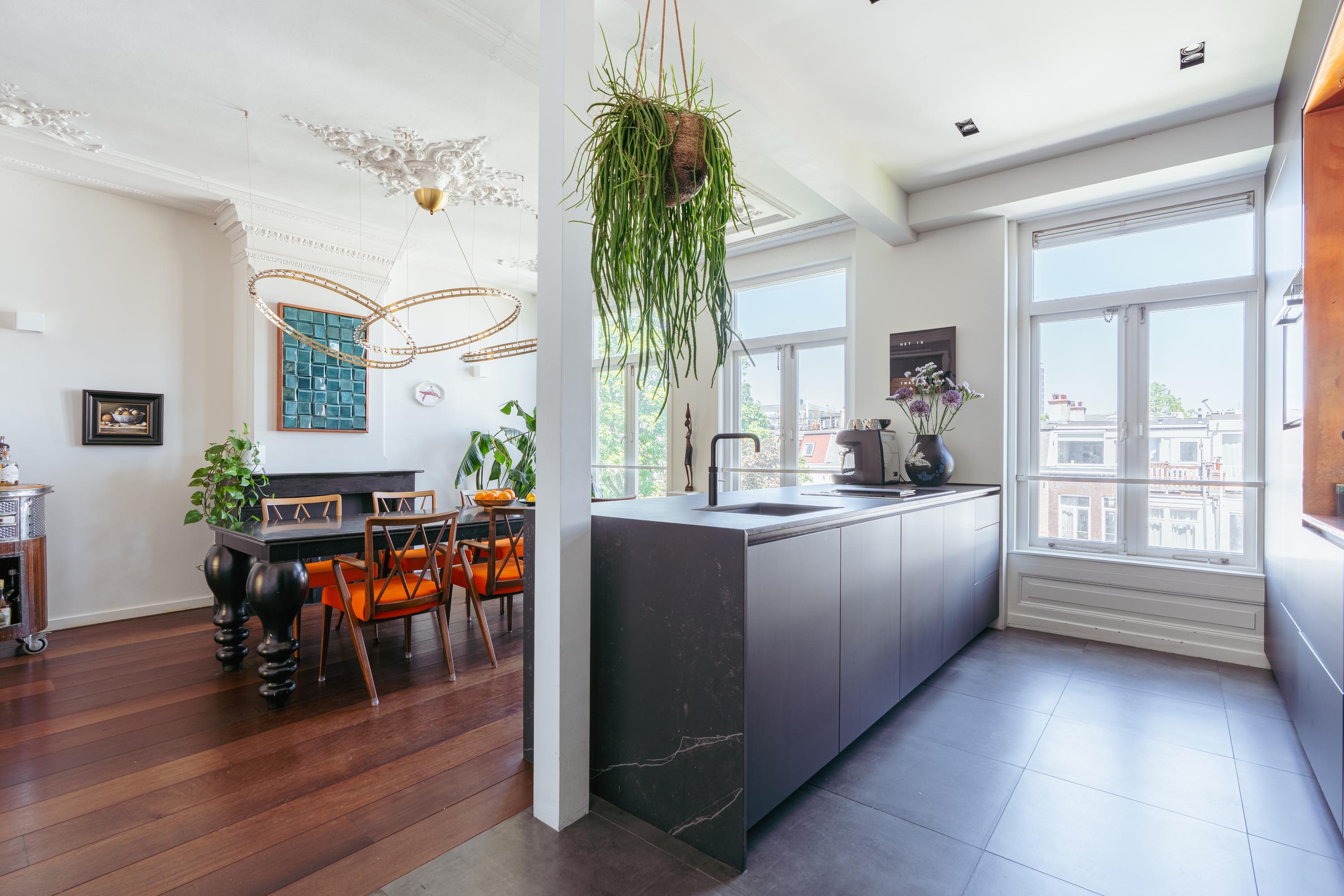 Elegant and very spacious apartment (approx. 241 m²) across the top three floors of a magnificent national monument on the Ceintuurbaan! This exceptionally spacious residence spans the top three floors of a beautifully preserved Rijksmonument and features a generous open-plan living area with wood-burning stove, four bedrooms, two bathrooms, and a wonderfully sunny south-facing balcony. Enjoy stunning views towards the Amstel River and the added benefit of owning freehold property—no leasehold involved.