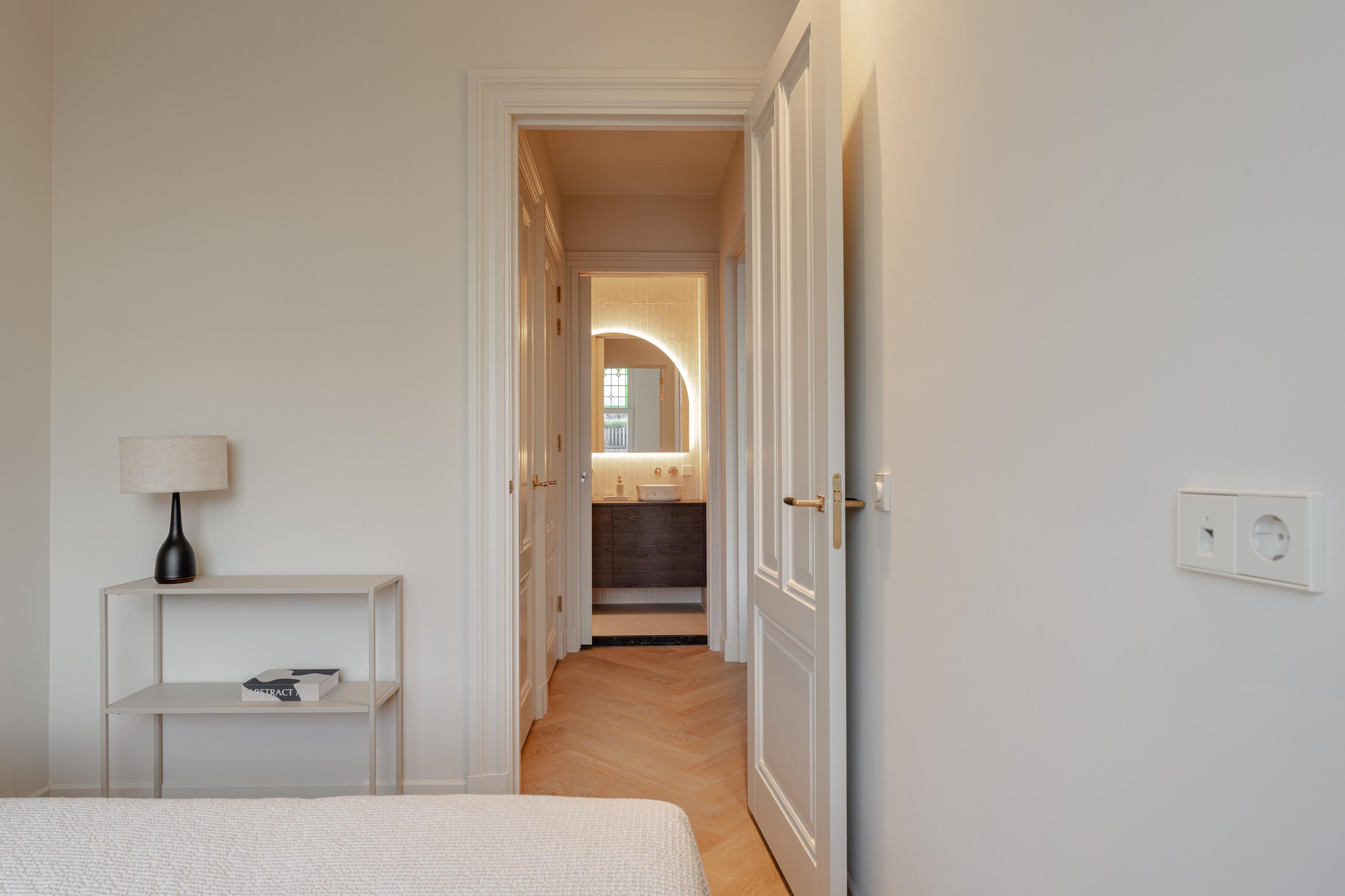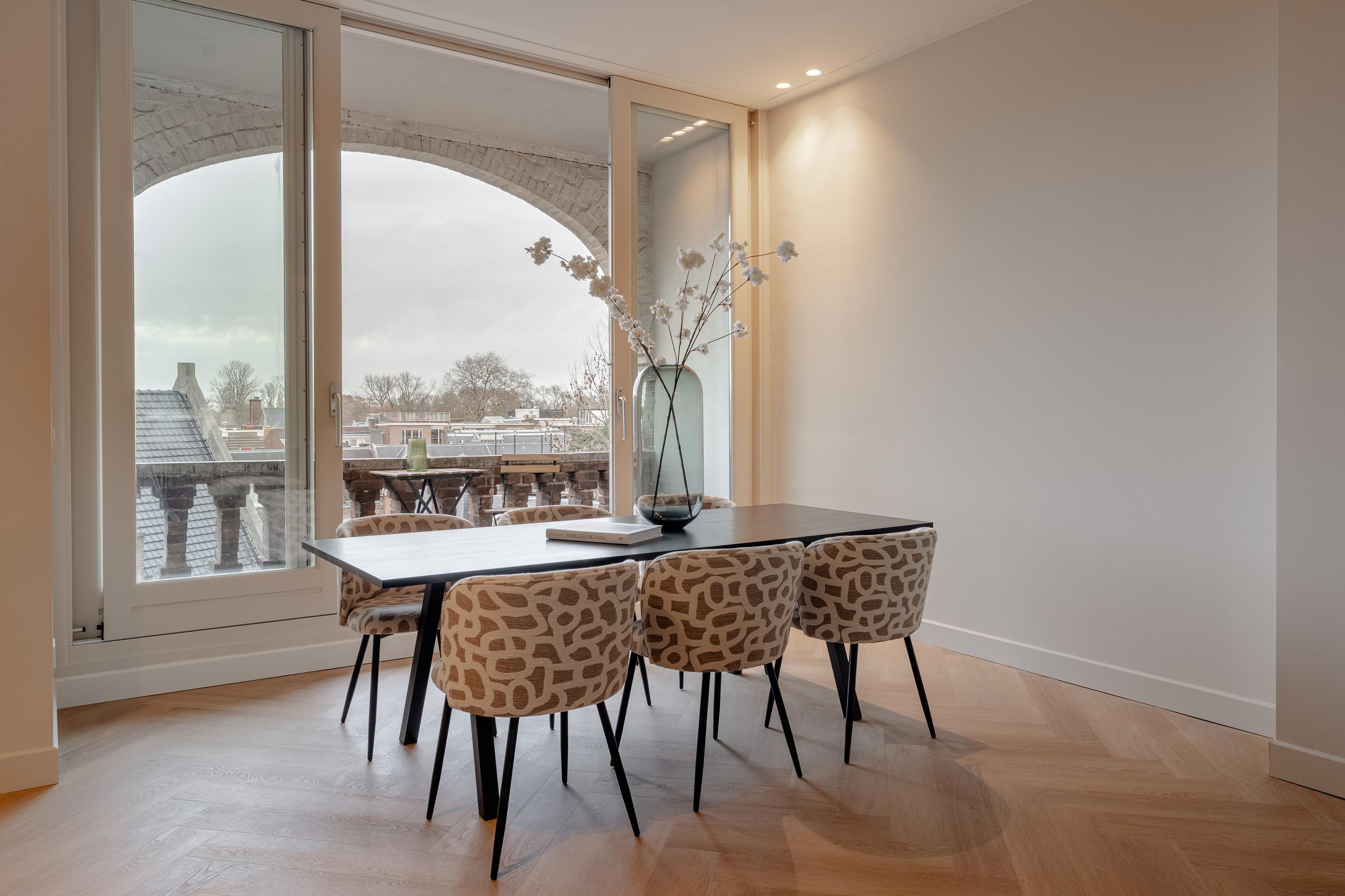 This luxurious apartment is located on the third floor and is characterised by a spacious and open layout, with large windows at both the front and rear providing pleasant natural light throughout the day. The apartment is finished to a high standard and offers a comfortable living environment with a calm and refined atmosphere. The living room is situated at the front of the apartment and features a ceiling height of approximately 3.07 metres. Together with the kitchen and dining area, it forms one generous open-plan living space. The luxurious kitchen is centrally positioned within the apartment and is designed around a spacious cooking and sink island, fitted with an induction hob, sink and Quooker. In addition, the kitchen is equipped with a refrigerator, freezer, combi oven, climate cabinet and ample cupboard space. The island also functions as a comfortable bar area. At the rear of the apartment is the covered balcony, offering attractive views over the green gardens at the back and providing a peaceful outdoor space to relax. At the front of the apartment, the hallway provides access to the first bedroom, the separate toilet, the laundry/storage room and the first bathroom. This bathroom is fitted with a walk-in shower and a double washbasin with vanity unit. The second bedroom is located at the rear of the apartment and features fixed wardrobe space and an en-suite bathroom, equipped with a walk-in shower and a washbasin with vanity unit.