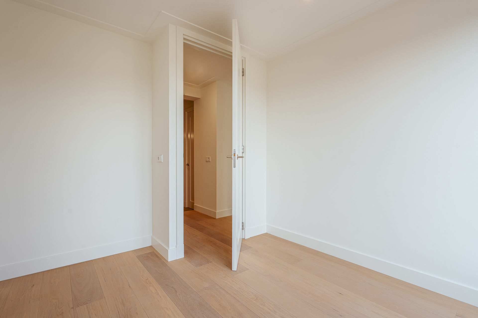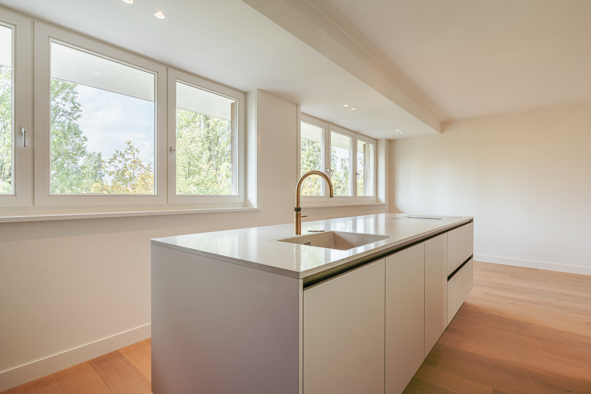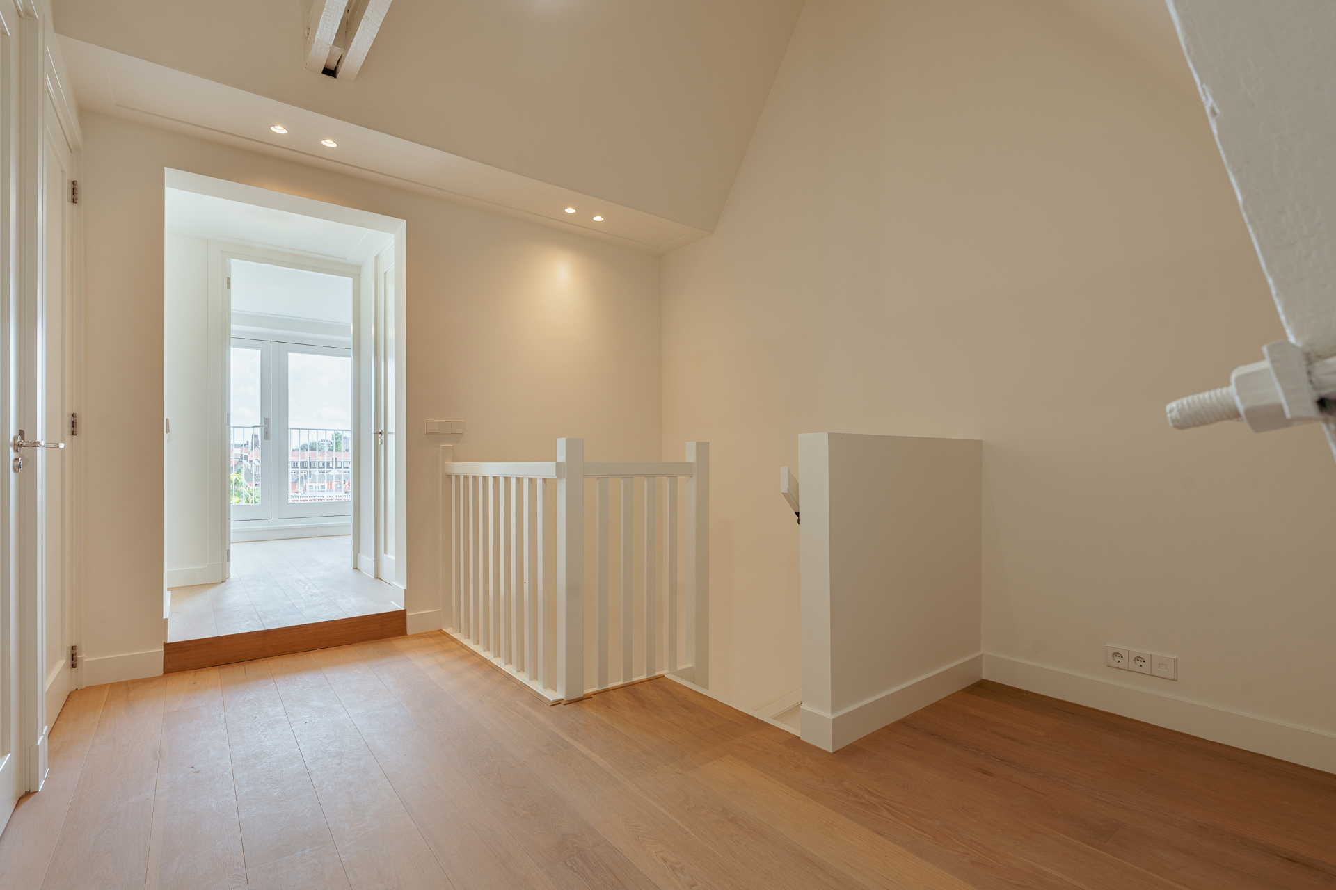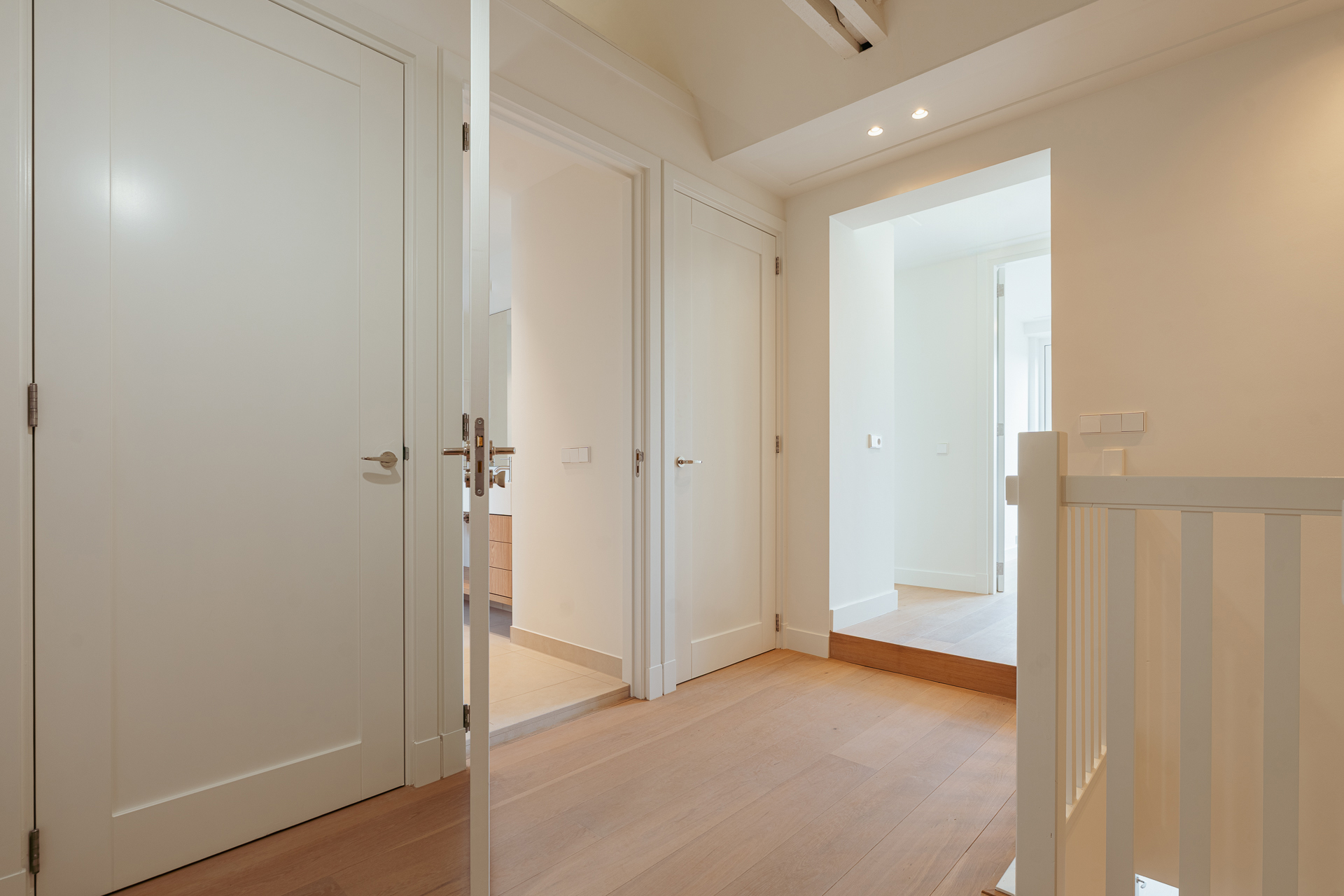 The open-plan kitchen is a true eye-catcher, fitted with high-quality built-in appliances: an induction hob with integrated extractor, dishwasher, combi-oven and Quooker tap. The combination of sleek handleless cabinetry and warm wooden accents gives this floor a modern yet inviting feel. From the living room you have access to a sunny southeast-facing balcony, perfect for a morning coffee or an afternoon drink in the sun.