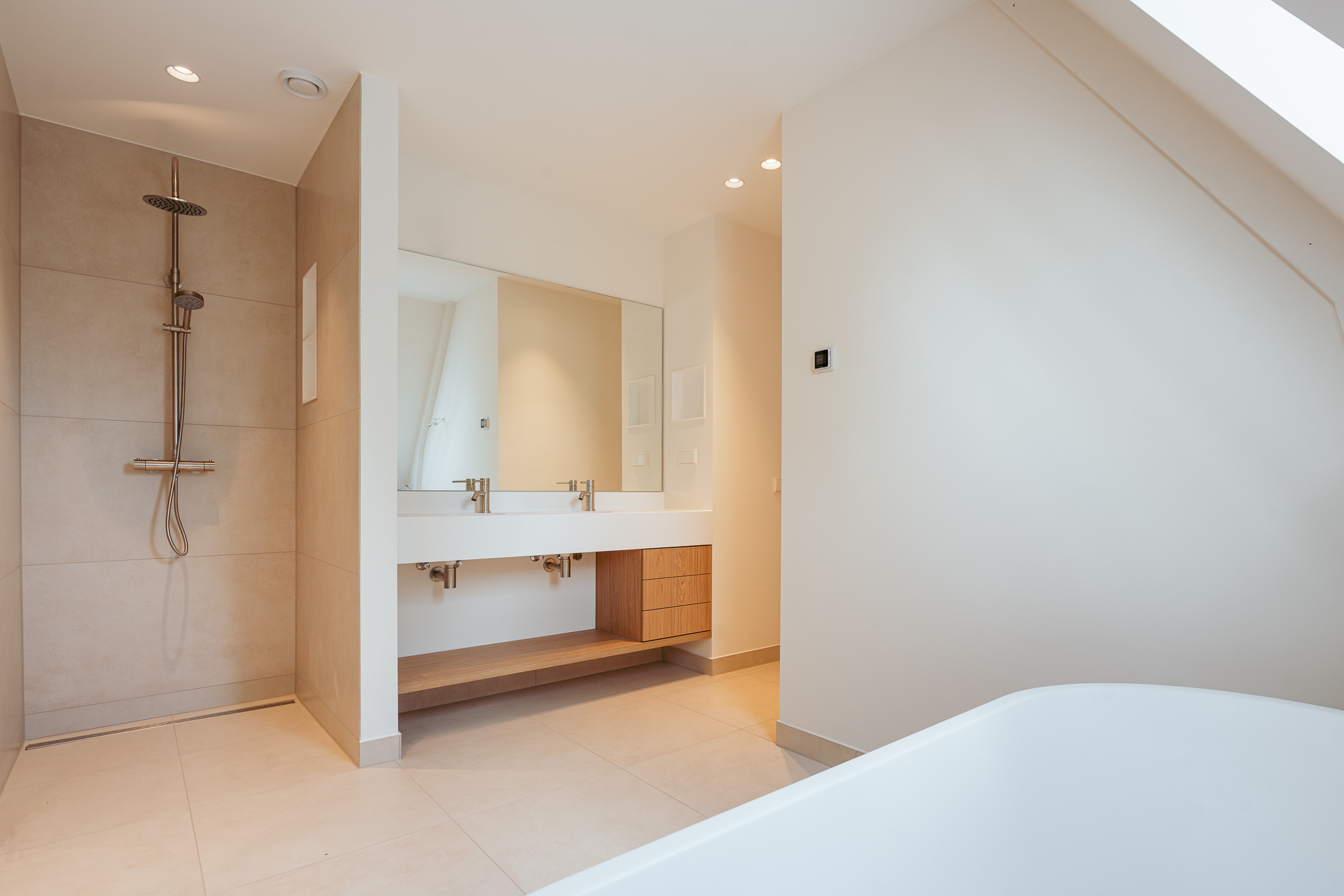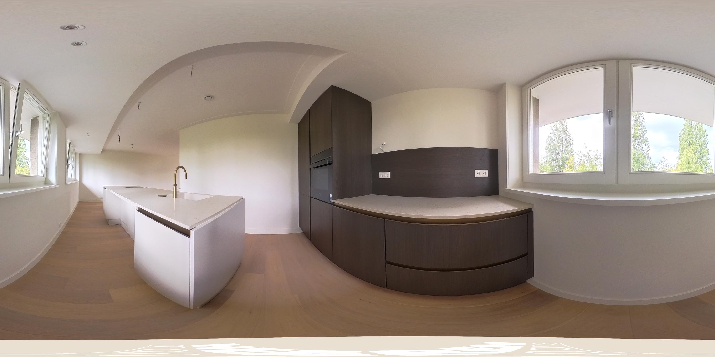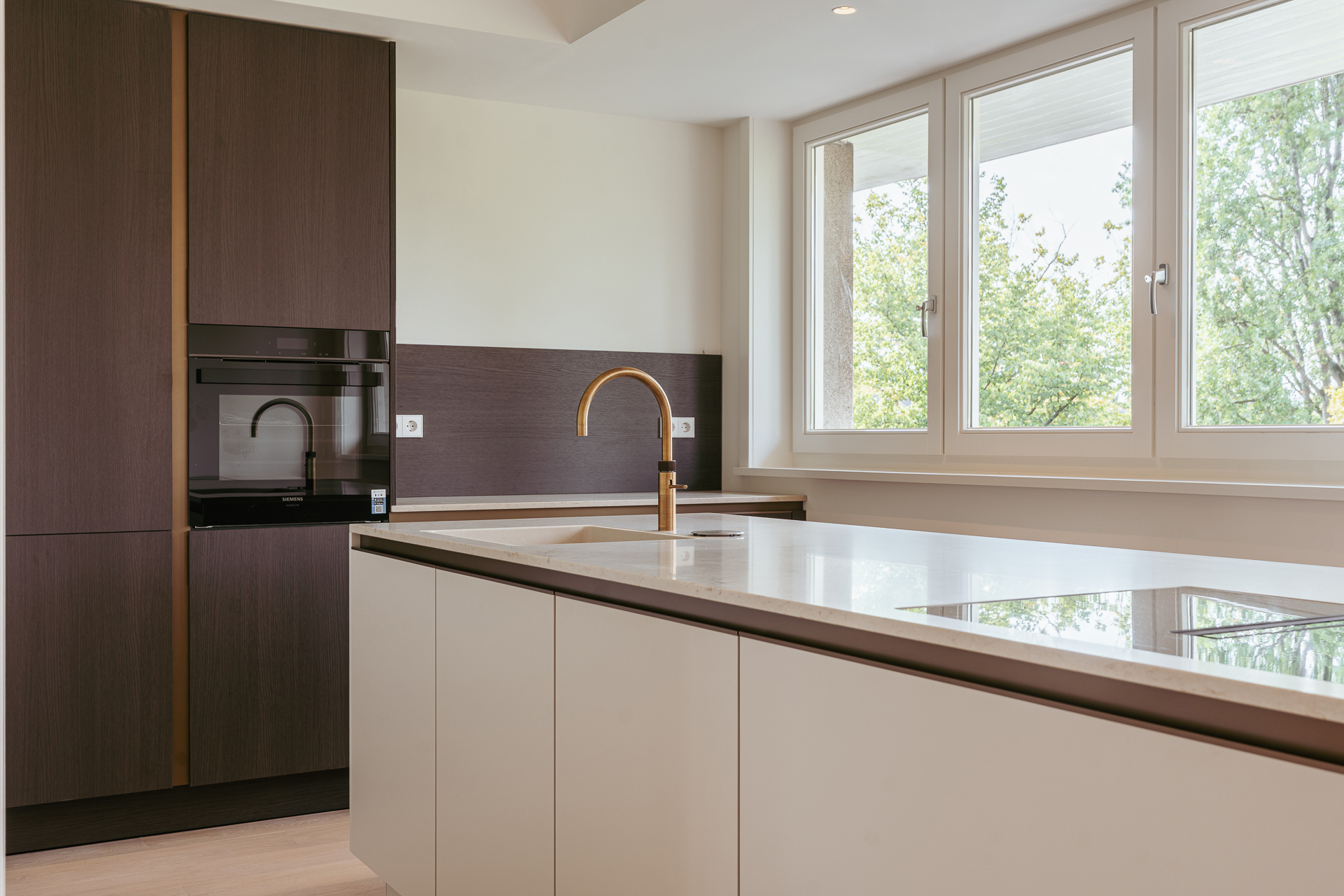 The open-plan kitchen is a true eye-catcher, fitted with high-quality built-in appliances: an induction hob with integrated extractor, dishwasher, combi-oven and Quooker tap. The combination of sleek handleless cabinetry and warm wooden accents gives this floor a modern yet inviting feel. From the living room you have access to a sunny southeast-facing balcony, perfect for a morning coffee or an afternoon drink in the sun.