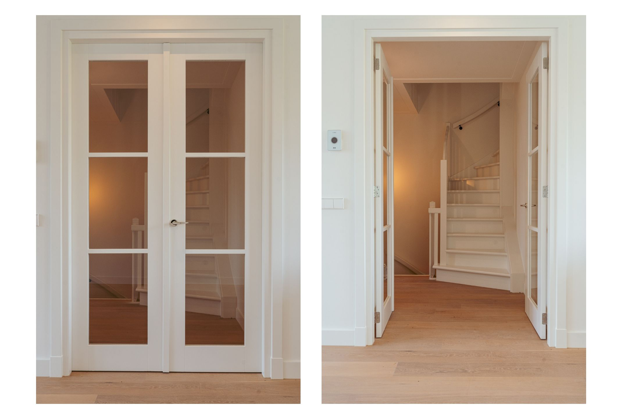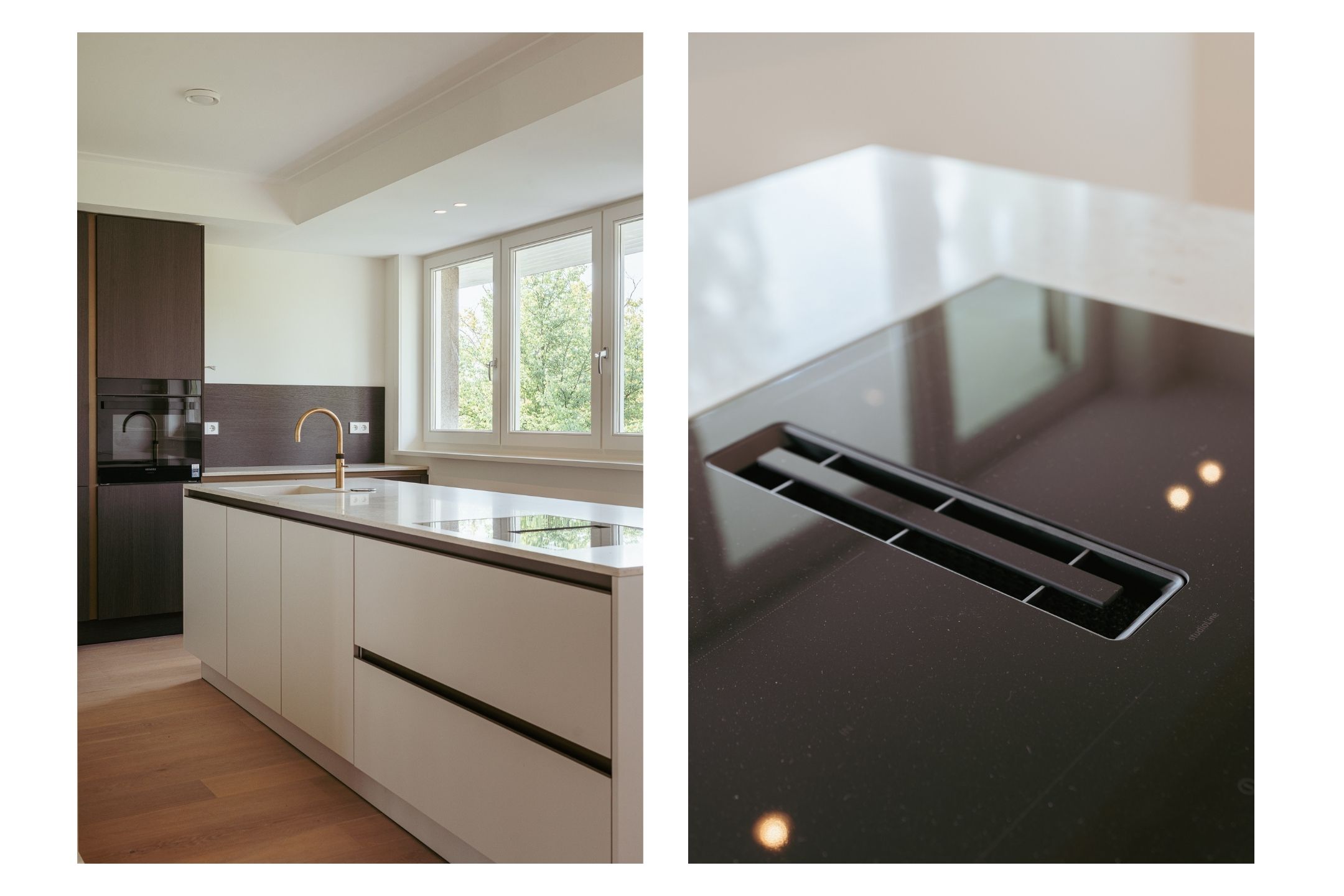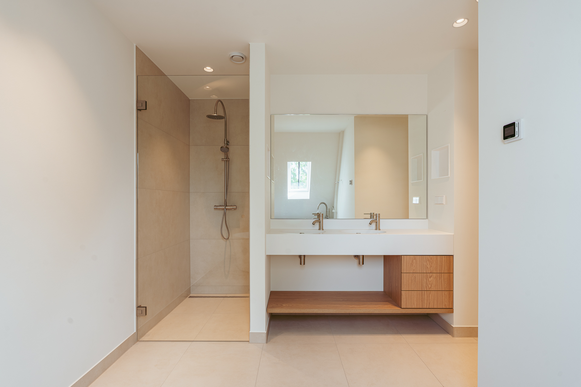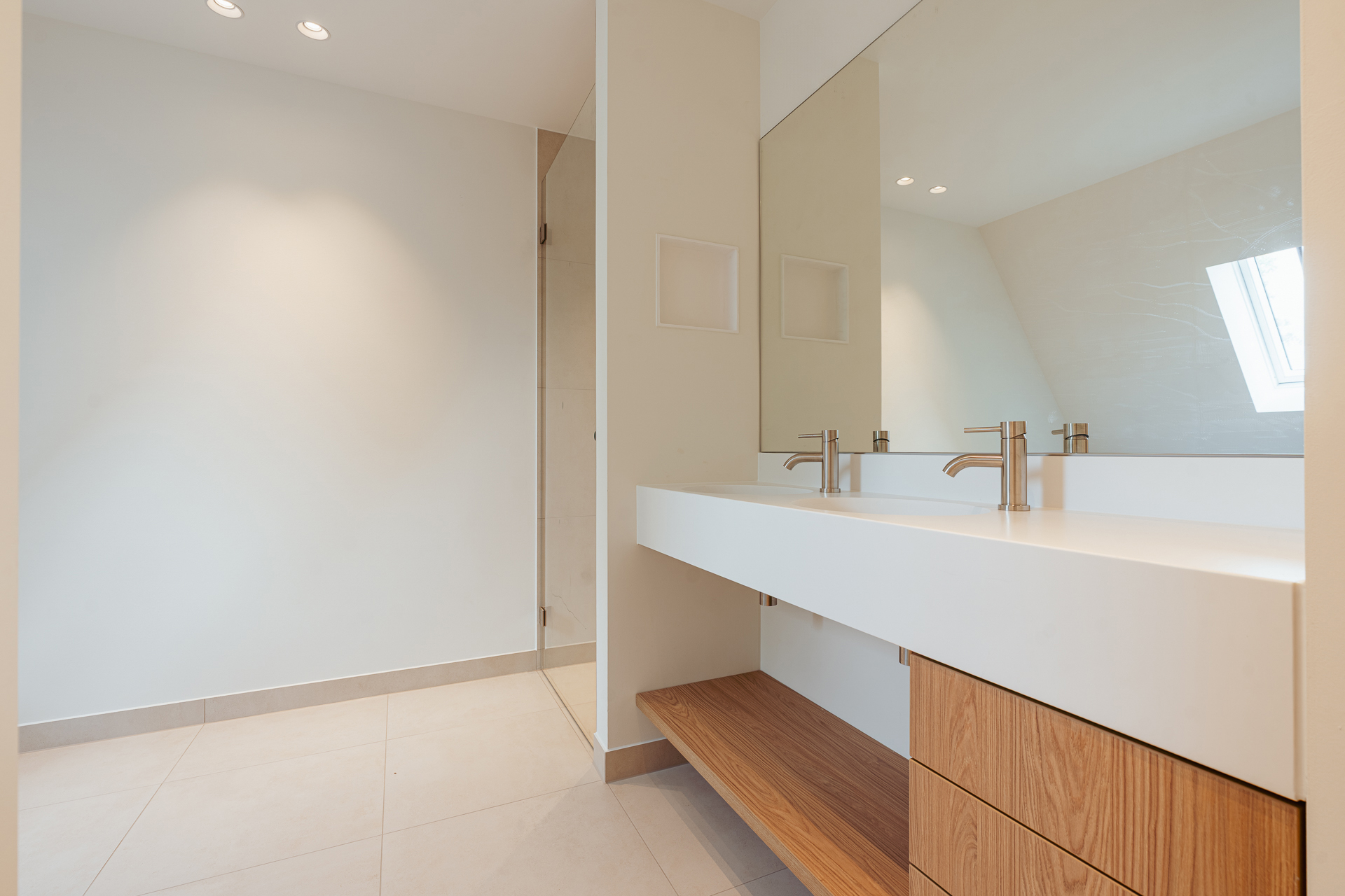 The open-plan kitchen is a true eye-catcher, fitted with high-quality built-in appliances: an induction hob with integrated extractor, dishwasher, combi-oven and Quooker tap. The combination of sleek handleless cabinetry and warm wooden accents gives this floor a modern yet inviting feel. From the living room you have access to a sunny southeast-facing balcony, perfect for a morning coffee or an afternoon drink in the sun.