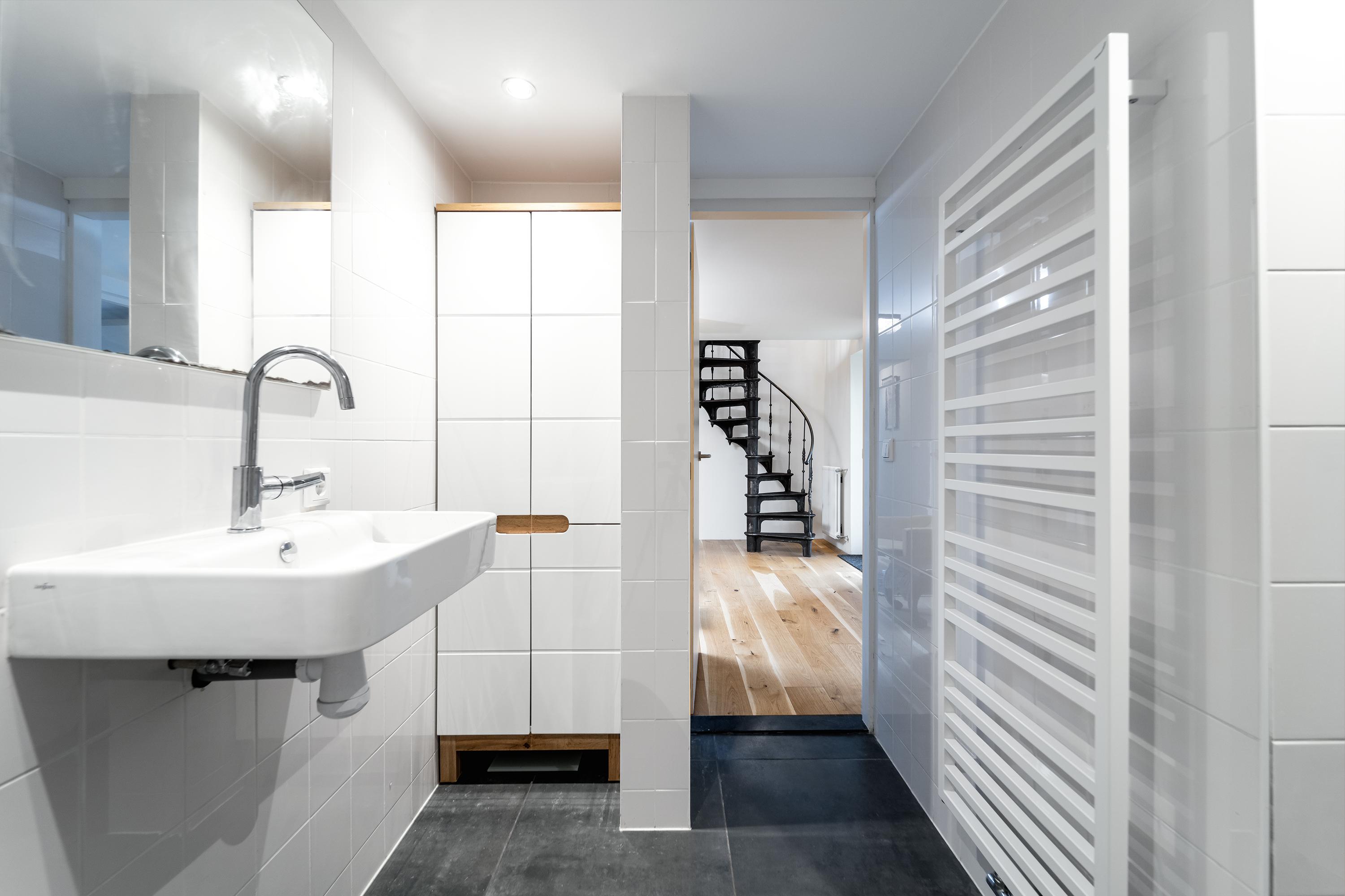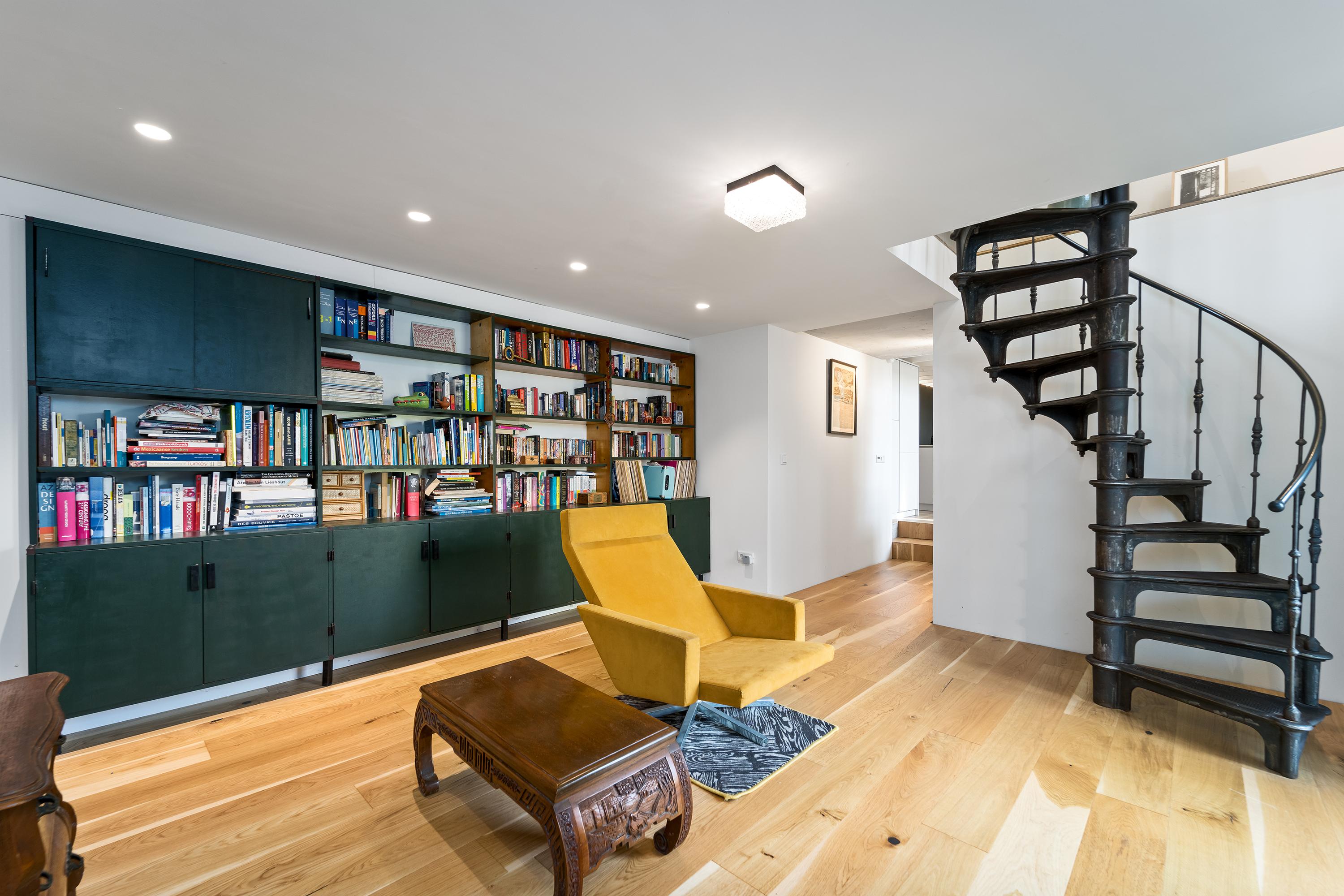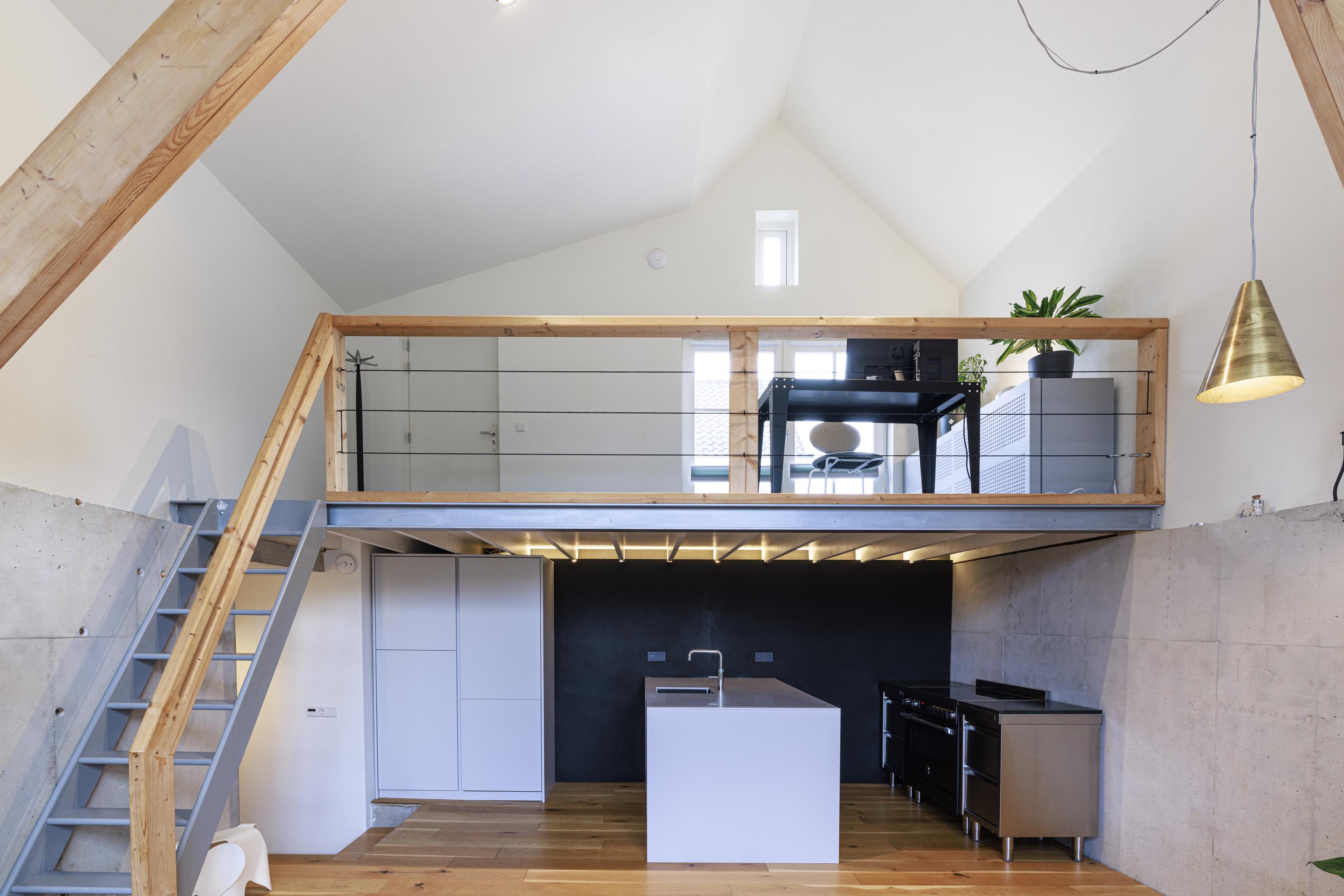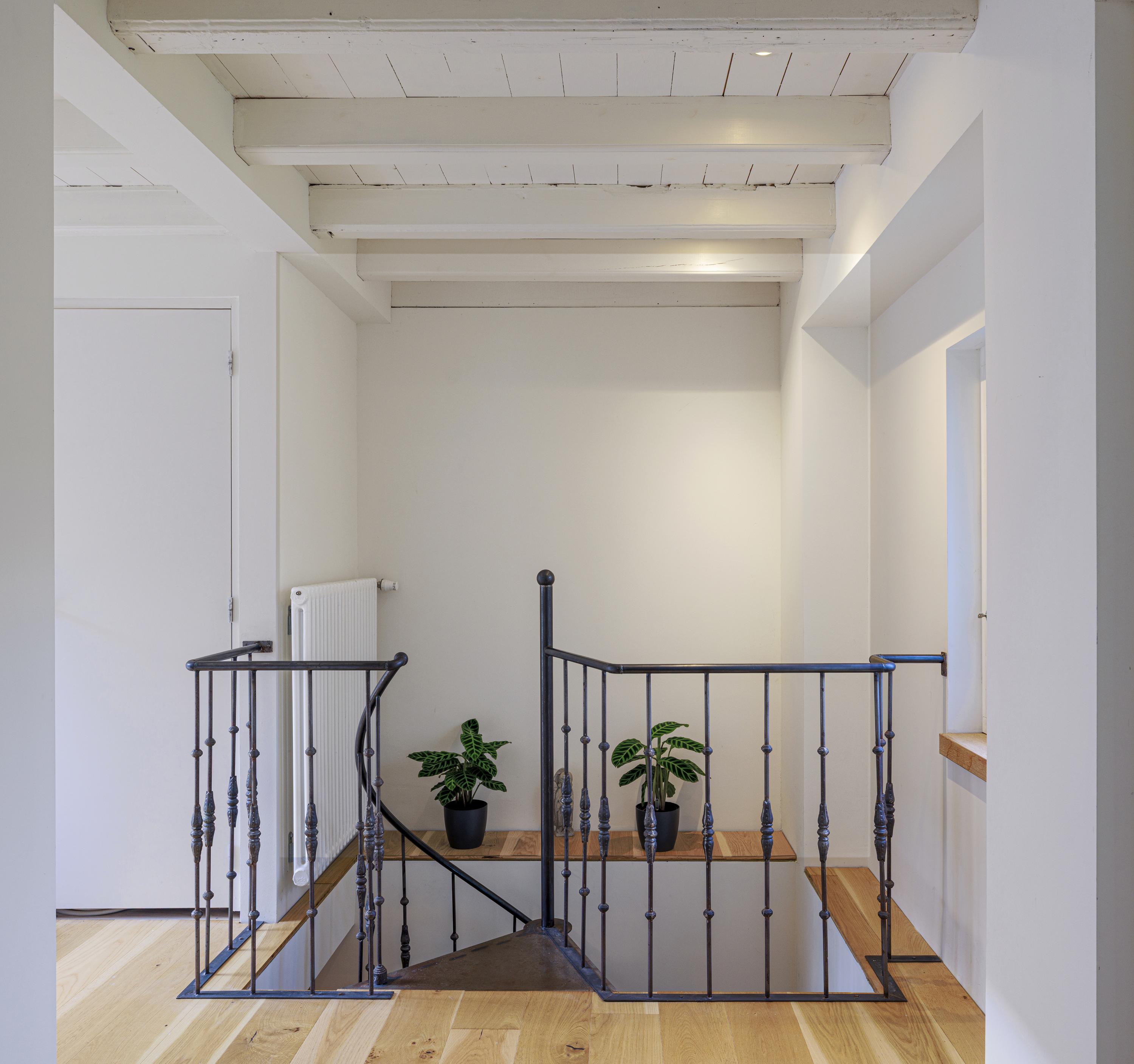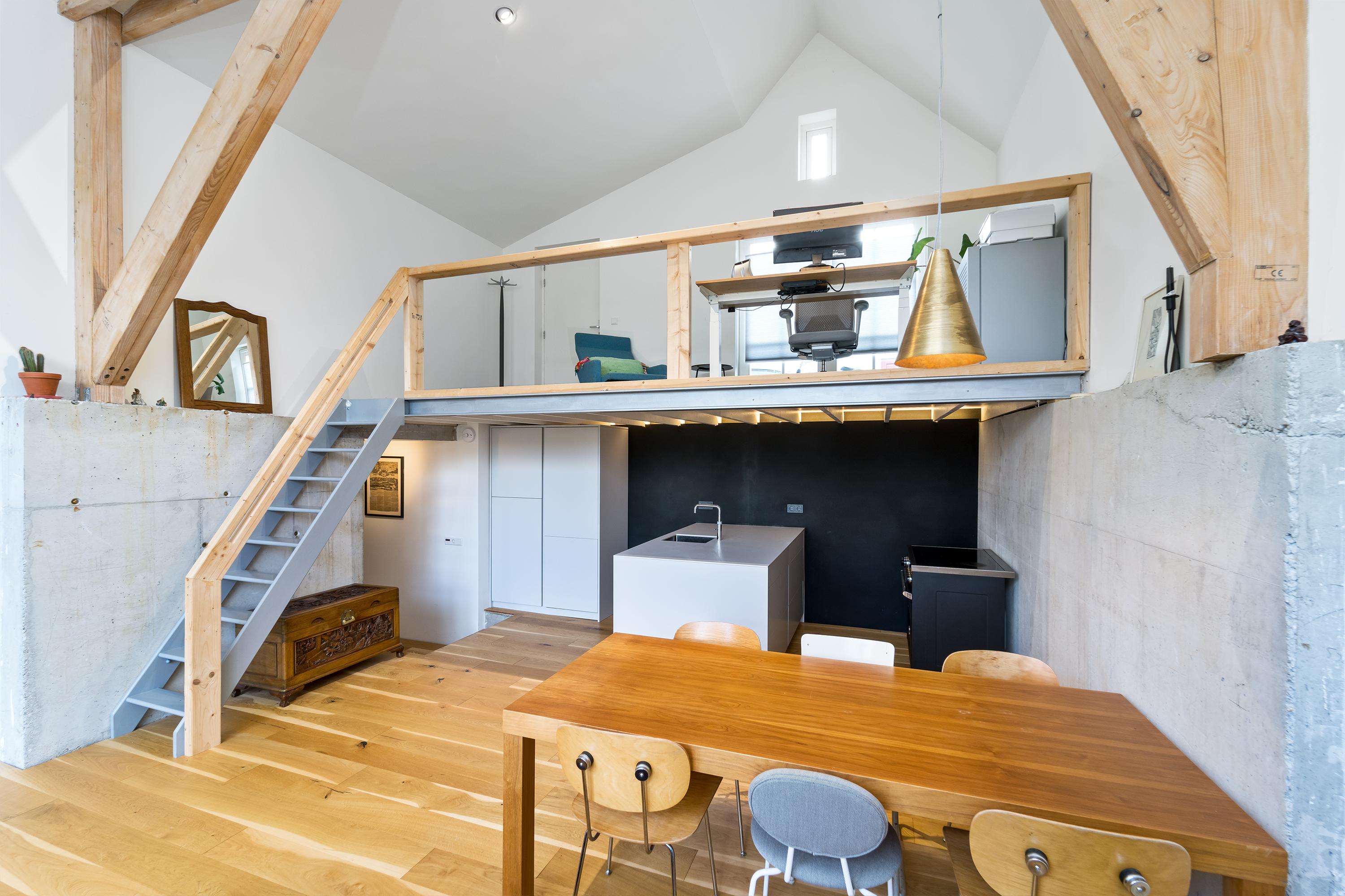 Inside, the home is just as cool. Old and modern materials were used in the new construction/renovation. Tough wooden construction beams, raw concrete, oak floorboards, classic member radiators and the steel spiral staircase are some examples.