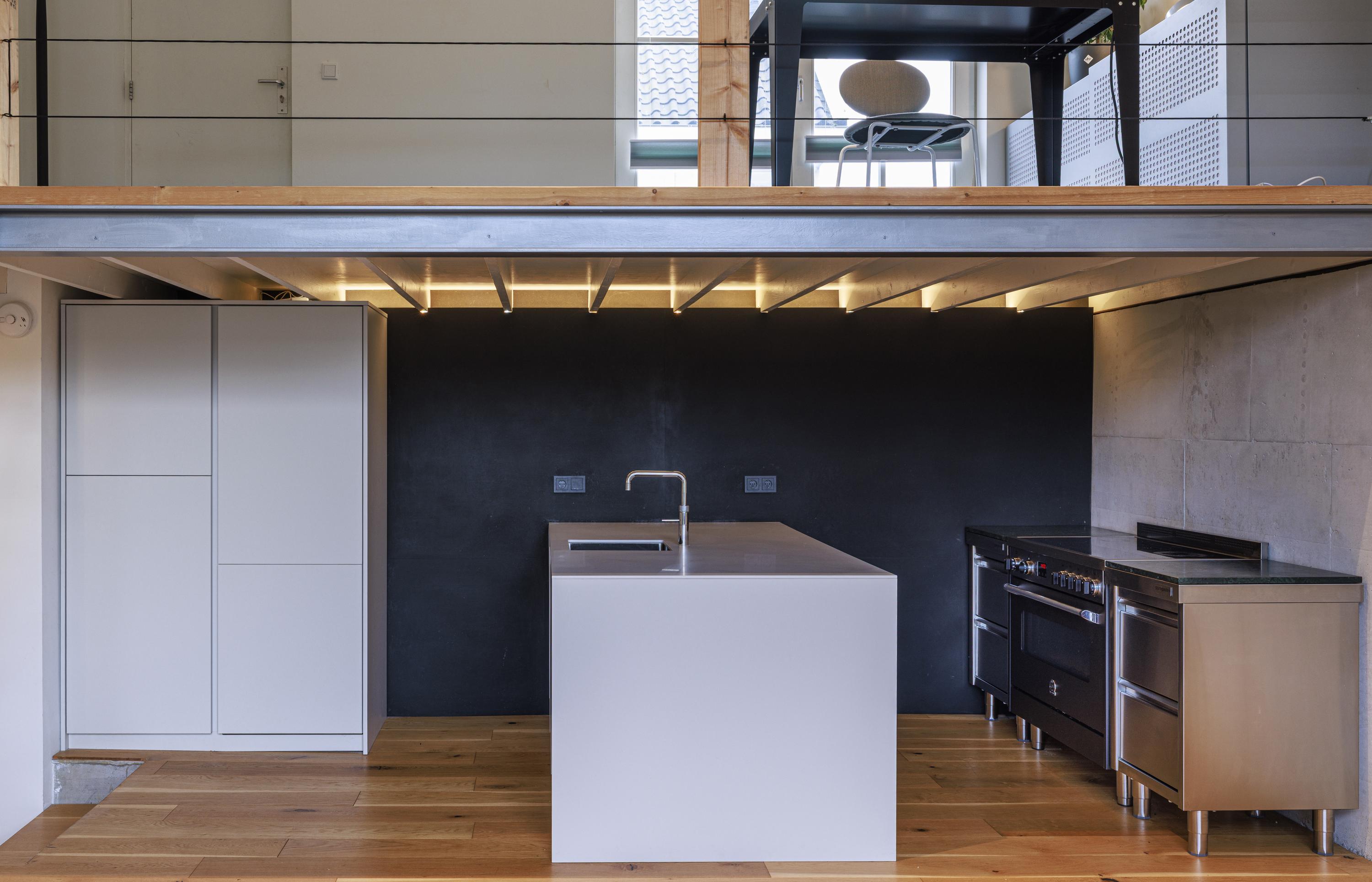 The perception of space in the home also stands out. This has been well thought out. In the super high living room with sits a loft / open office, with a one-off designed kitchen underneath. Giving a view of the garden everywhere through the gigantic glass facade.