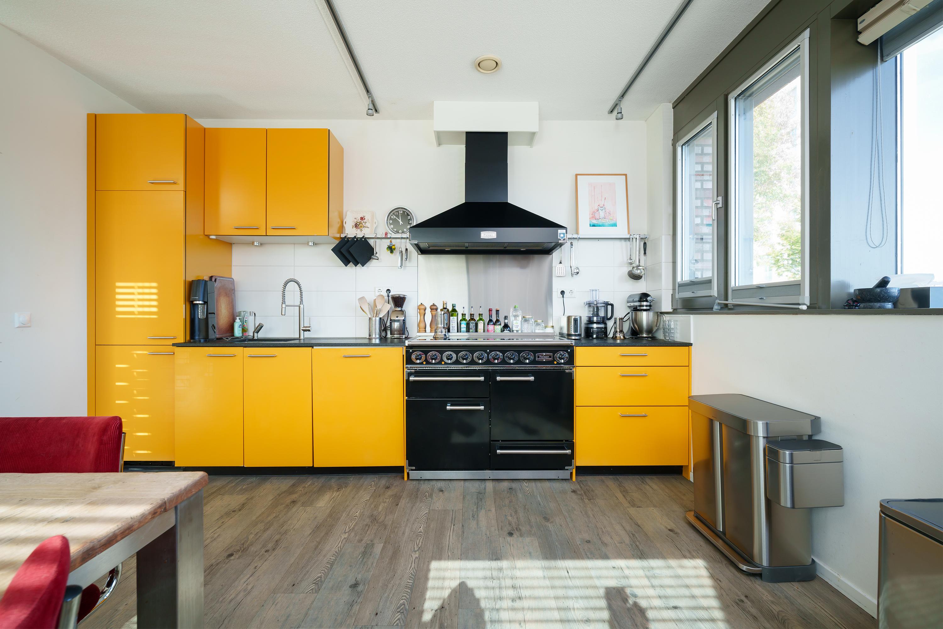 The dining room/kitchen (18 m²) forms the heart of the home. It features a modern design with striking yellow fronts, a 5-burner Falcon induction cooker (with two ovens and a separate grill), Miele dishwasher, Miele refrigerator and a Quooker boiling-water tap. There is ample space for a large dining table, perfect for dinner parties or family evenings.