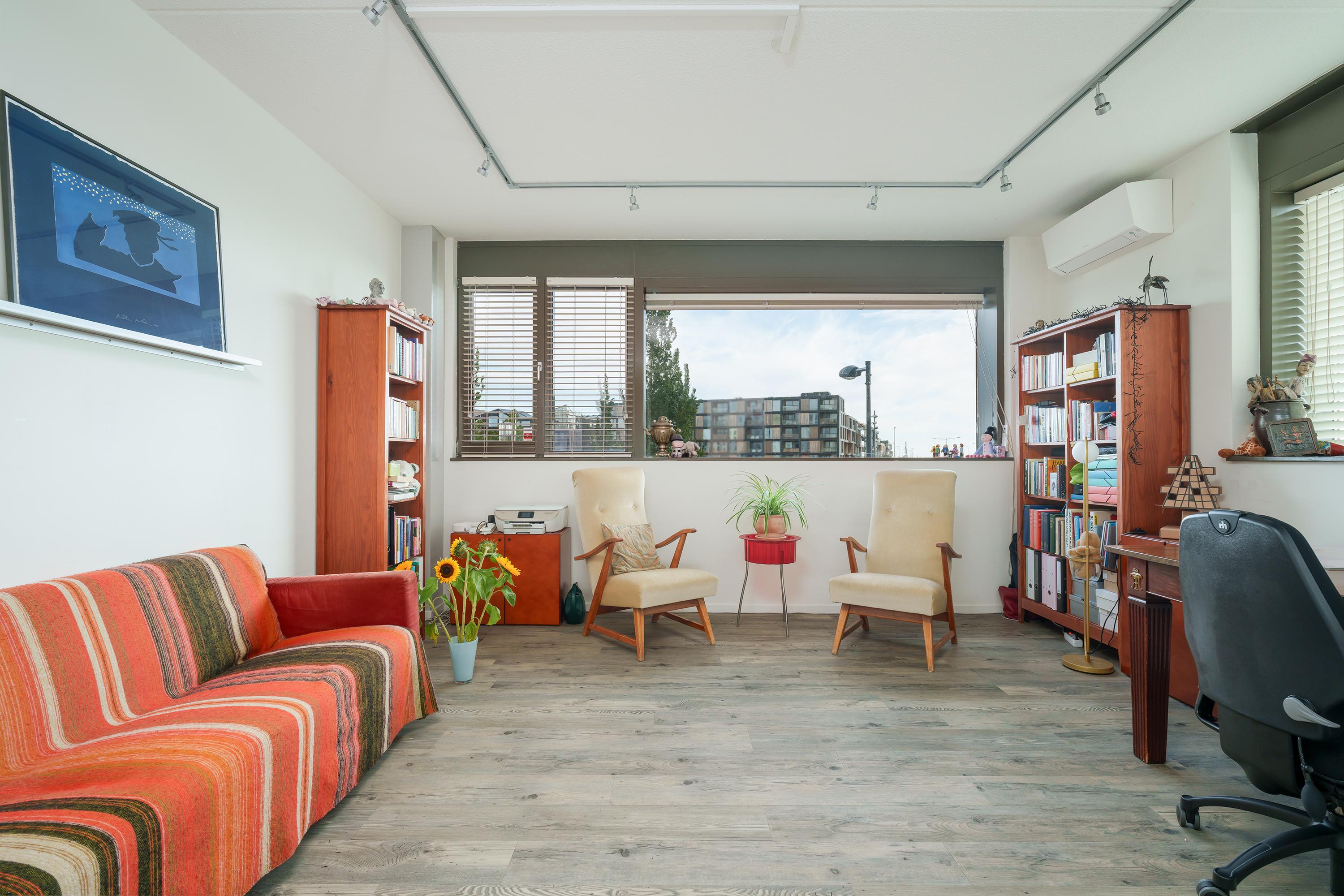 Here you will find the master bedroom of nearly 23 m² (including built-in wardrobes), with large windows overlooking the lake. The second bedroom/office (18 m²) on this floor enjoys magnificent views over the water, the surroundings and the Diemer Vijfhoek.
