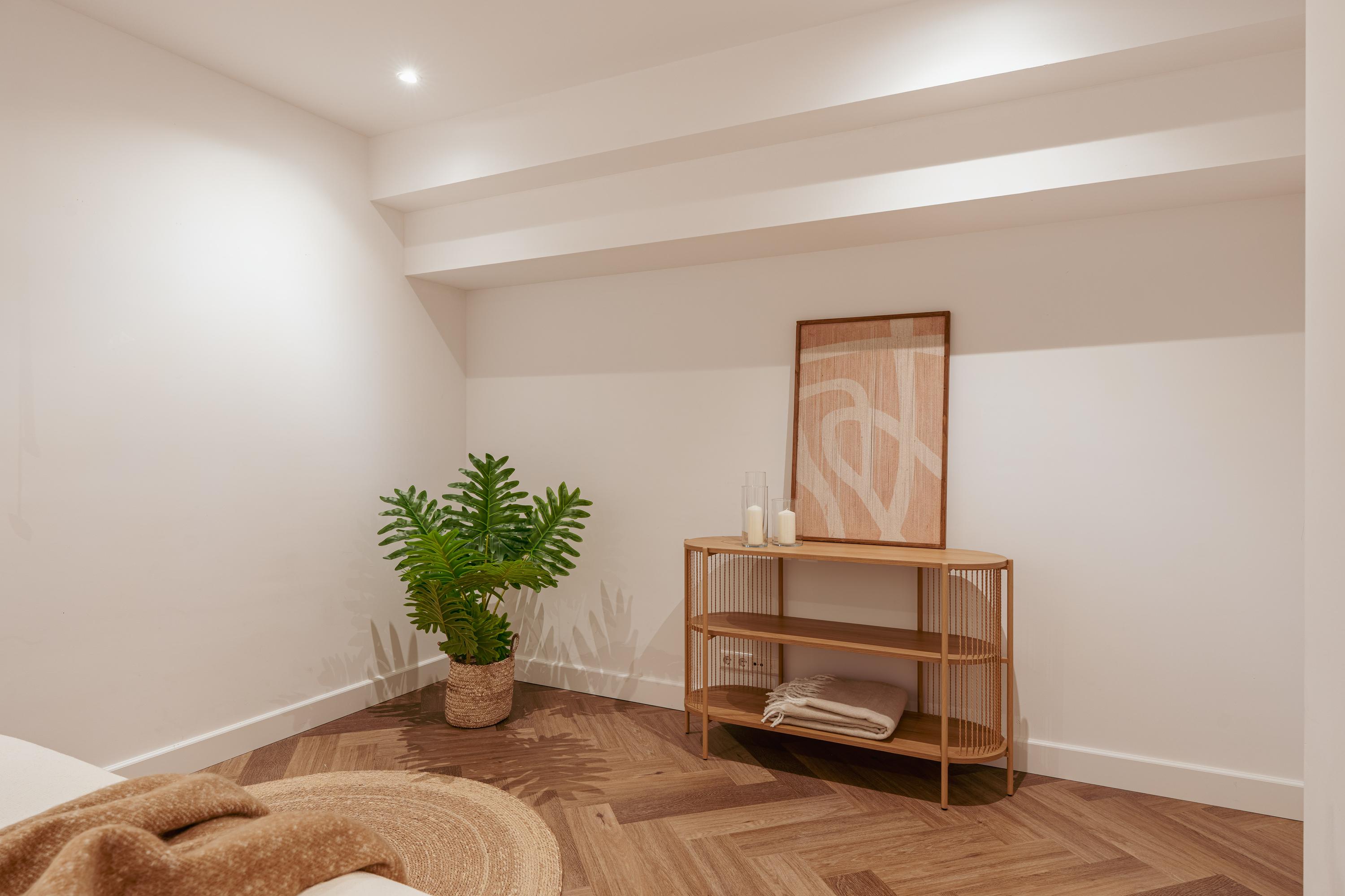 A fixed staircase leads down to the basement level, where three well-proportioned bedrooms are located. The master bedroom is positioned at the front of the property, directly next to a modern bathroom fitted with a walk-in shower and a vanity unit with washbasin. In the centre of the floor, you will find a second bathroom with a bathtub and vanity unit, as well as a separate toilet and a practical storage cupboard. Two additional bedrooms are located at the rear, making them ideal as guest rooms, children’s bedrooms, or a home office. A further spacious storage cupboard is accessible from the central hallway and is located beneath the staircase.
