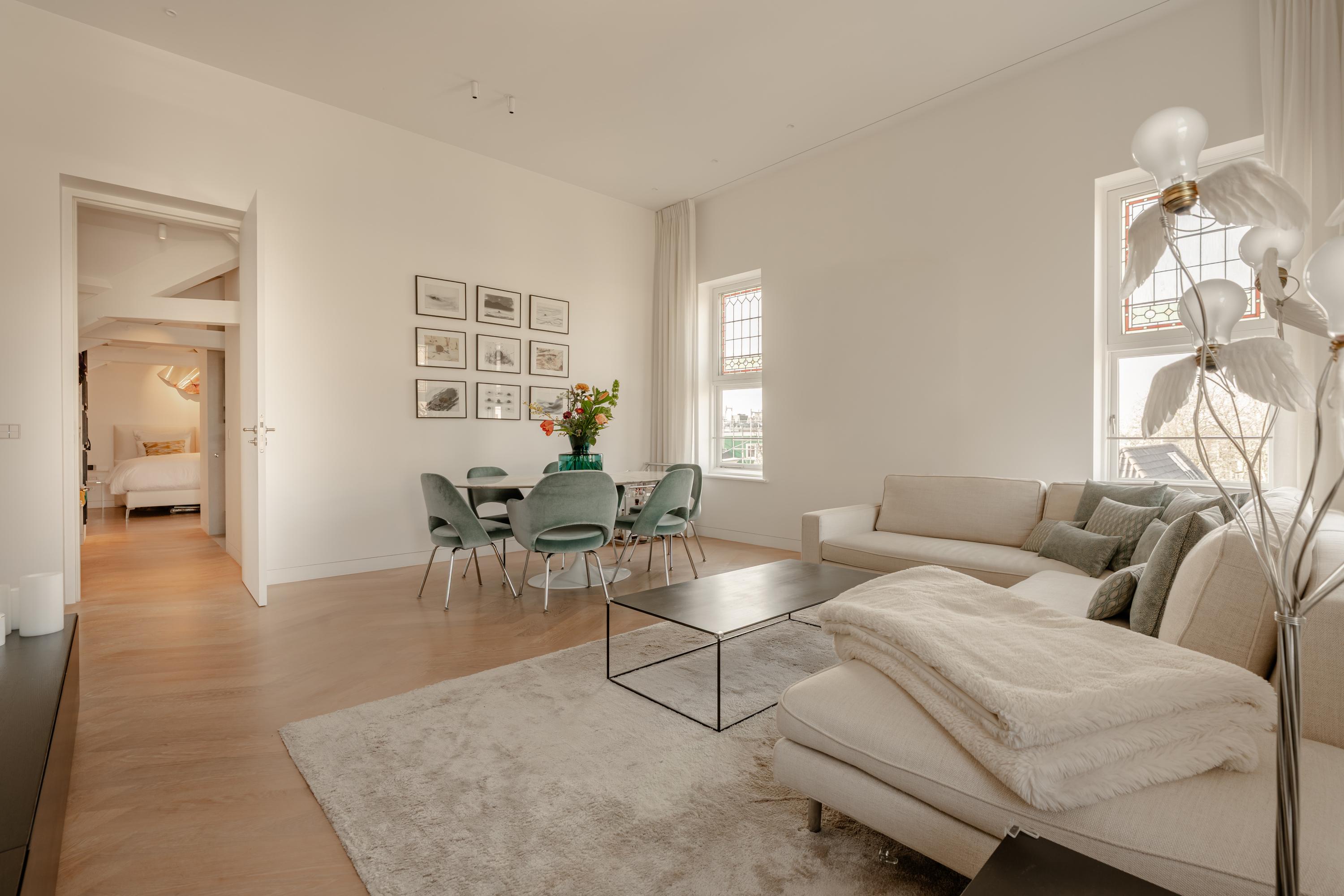 Thanks to the large windows, the space is filled with natural light and offers beautiful views over the characteristic rooftops of Oud-West, creating an open and serene living experience. The kitchen is equipped with high-end Siemens built-in appliances, an induction hob, Quooker tap, and a wine climate cabinet. Integrated air conditioning completes the comfort.