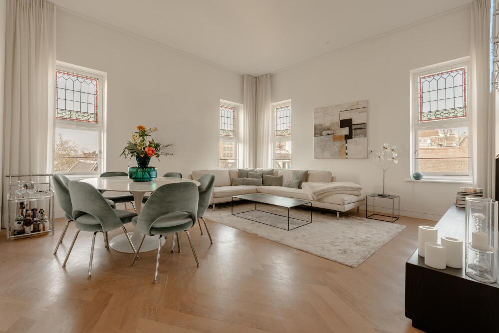 Located in the highly sought-after Vondelpark neighbourhood, this luxurious penthouse of approximately 115 m² is situated in a characteristic listed (monumental) building with elevator. The apartment combines authentic details with modern living comfort and is distinguished by its high-quality finishes and bespoke cabinetry throughout. Large windows provide an abundance of natural light and offer beautiful views over the city. In addition, the property is situated on freehold land, making it even more attractive.