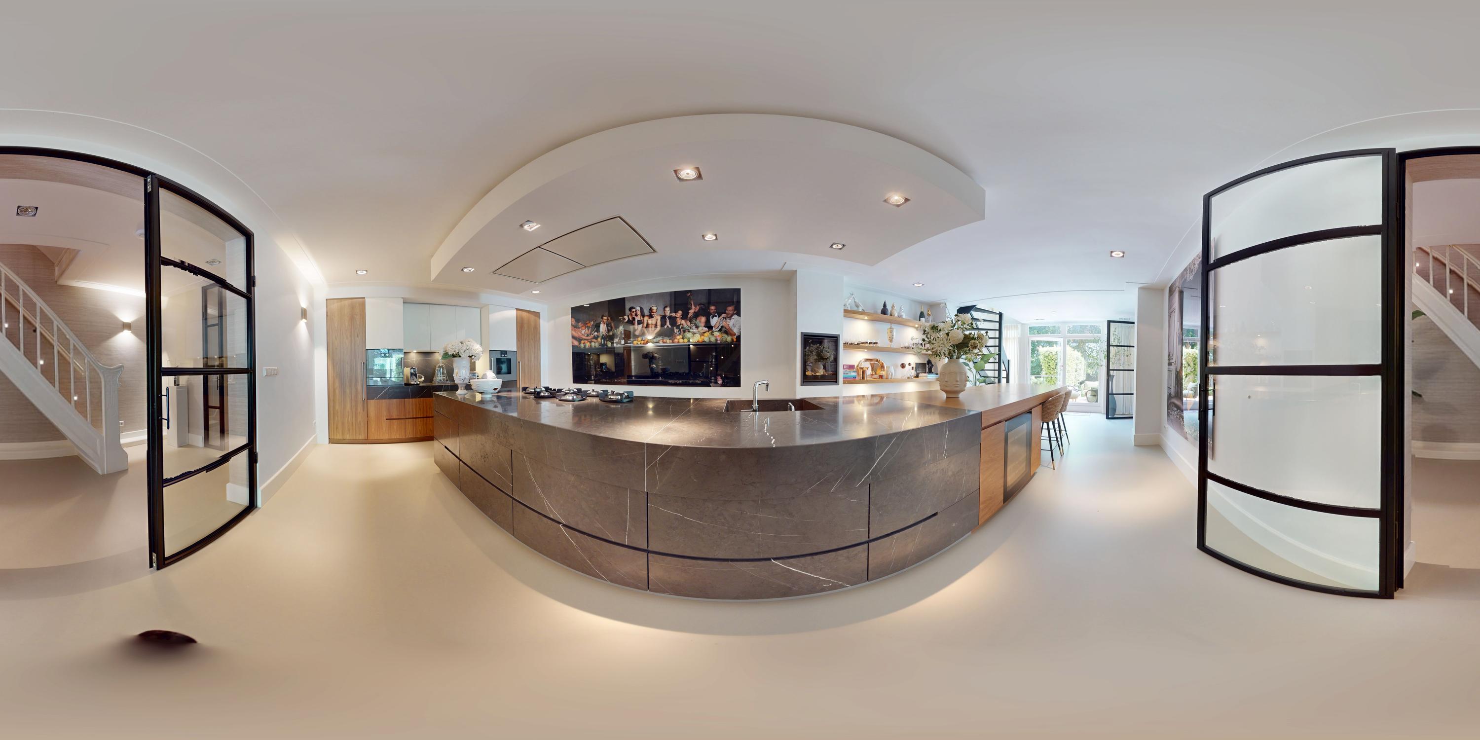 To the front is a bedroom with an en-suite bathroom featuring a washbasin and walk-in shower—currently used as a home gym, but easily repurposed. At the rear is the stunning open-plan kitchen, the centerpiece of this level. Outfitted with Gaggenau appliances, including a fridge, freezer, Quooker, five-burner gas stove integrated into the counter, oven, steam oven, dishwasher, and wine fridge, the kitchen combines luxury and functionality. A solid natural stone countertop with a wooden breakfast bar provides a warm, refined look.