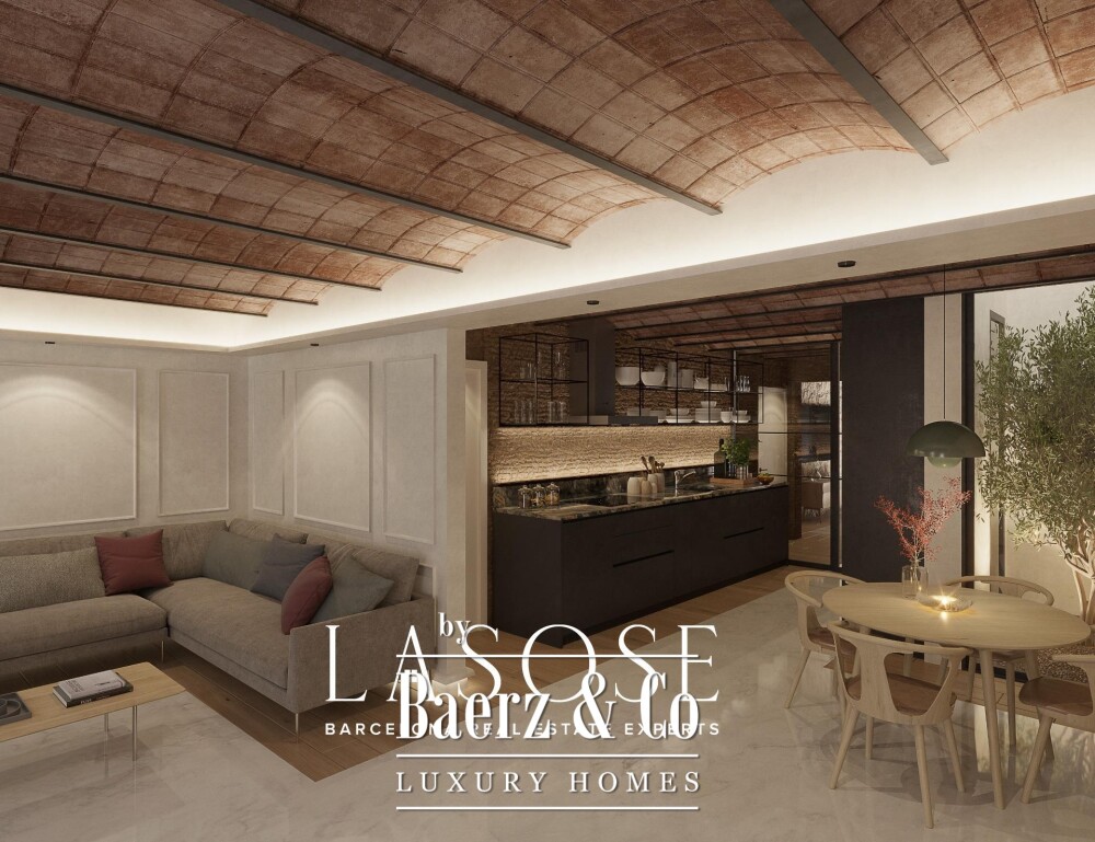 Apartment Barcelona with terrace is at the heart of Eixample Derecho, steps from the iconic Sagrada Familia. Spanning 175 m² across three thoughtfully designed levels, this residence offers a balance of architectural character and contemporary living. The open living area is illuminated by double-height ceilings, immediately creating a sense of calm and spatial clarity. Natural wood parquet underfoot invites warmth, while a designer kitchen with high-end appliances and clean lines elevates daily rituals.