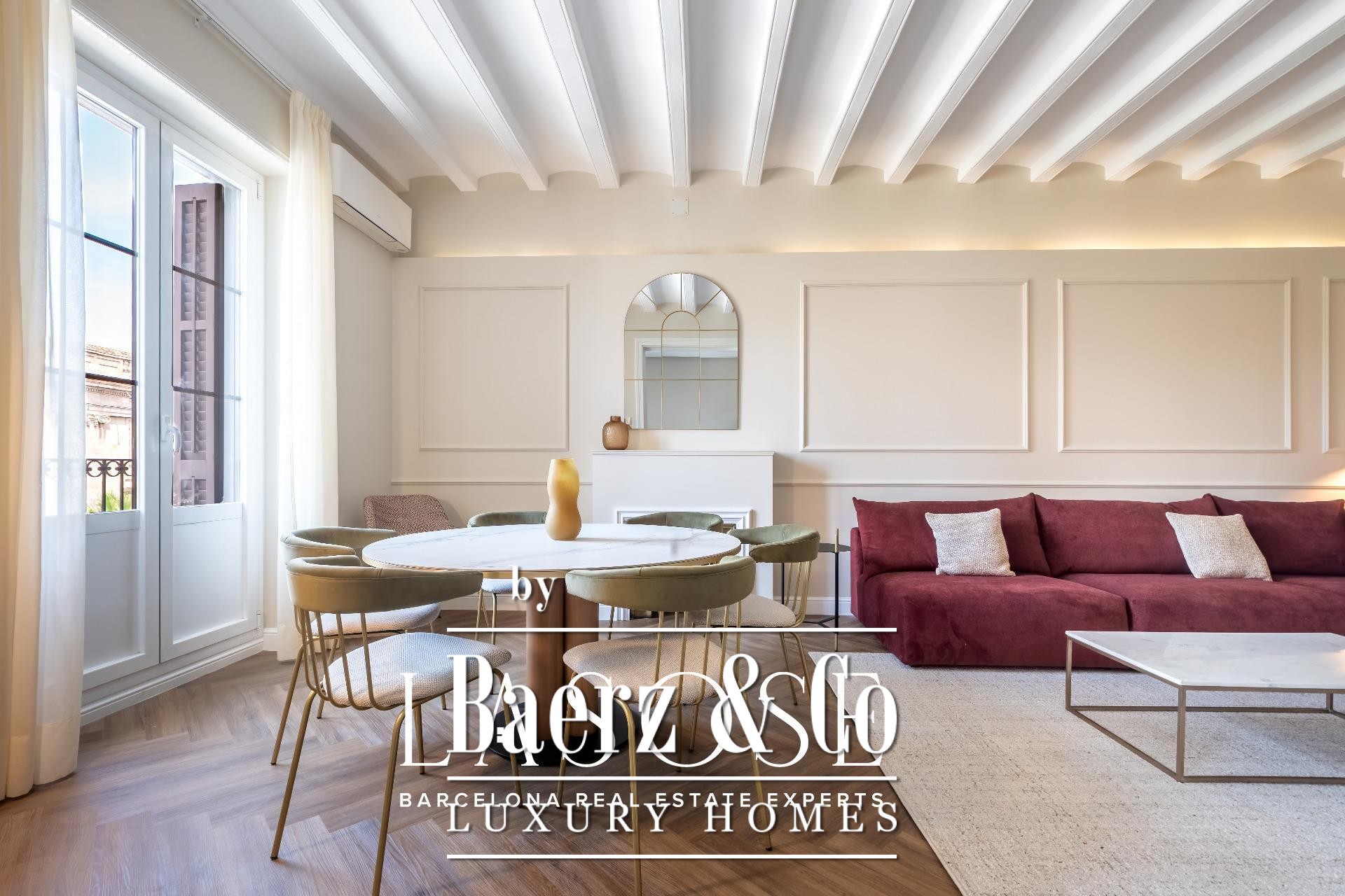 Lasose presents this bright 138 m² apartment, located on the third floor of a listed historic building, which represents a unique opportunity to live in a privileged enclave in the center of Barcelona, where history and modern comfort meet.. . The building, located on Calle Isabel II, is part of the 19th-century urban development of Portal de Mar and Pla de Palau. This building is not only notable for its architectural value, but also for its cultural significance: it was Picasso's first home in Barcelona.. . Layout and main features:. . 3 double bedrooms and 2 full bathrooms. . Spacious living-dining room with *wooden beamed ceilings*, 3 meters high, which enhance the feeling of spaciousness and light. . 5.60 m² balcony overlooking one of the most emblematic areas of the city. . Separate kitchen, fully equipped with high-end