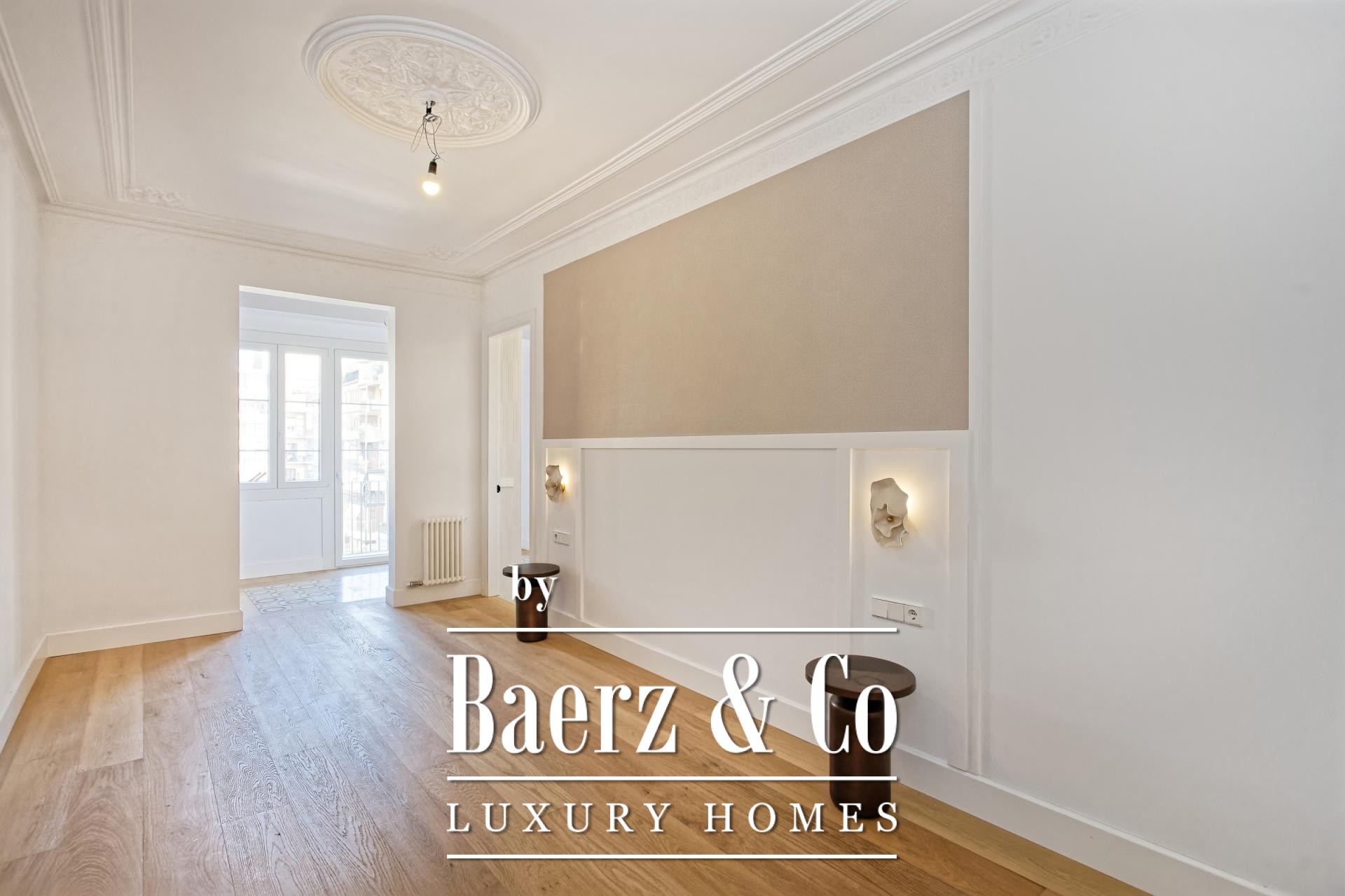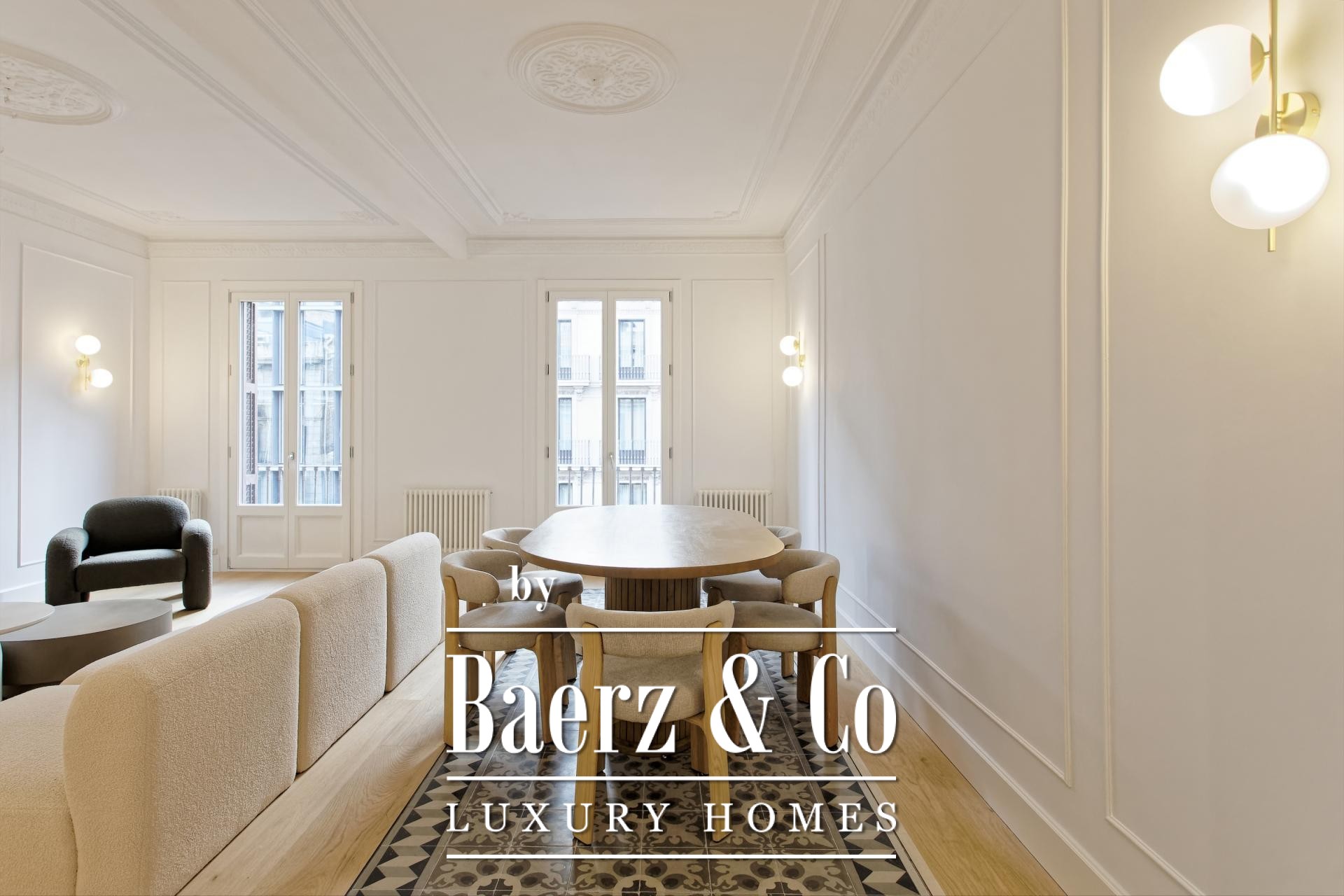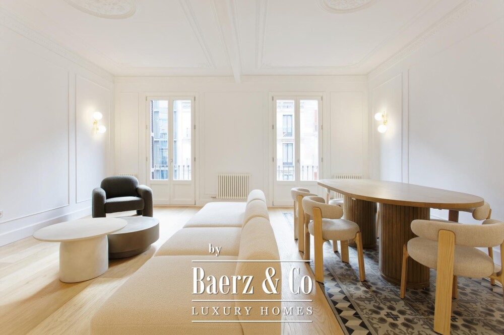 Apartment Barcelona in the celebrated Eixample Dreta quarter presents a refined encounter between heritage and renewal. Set on the authentic fourth floor of a grand 1900 Finca Regia, this 218 m² residence traces the lines of original architecture with balanced modern craftsmanship. The through-apartment takes full advantage of its north-west orientation, gathering light through two exterior balconies and a sequence of generous spaces.