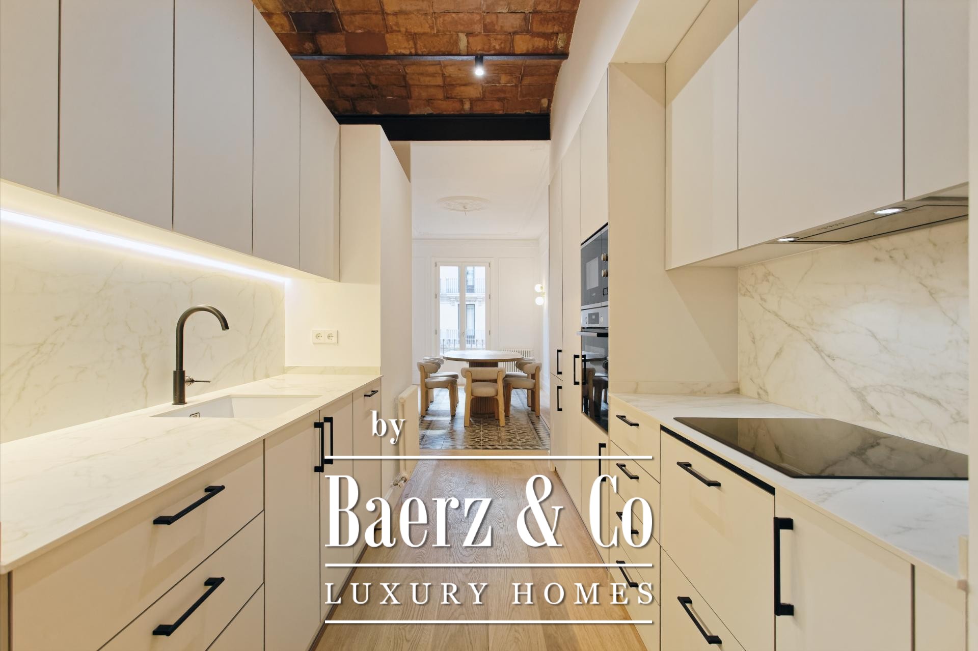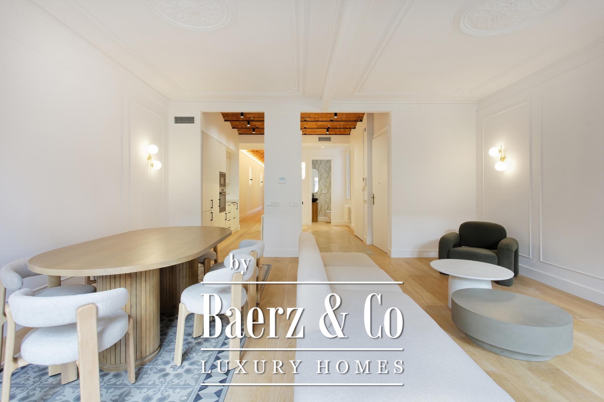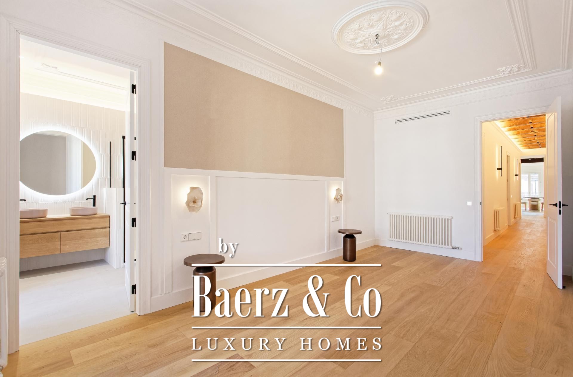 Apartment Barcelona in the celebrated Eixample Dreta quarter presents a refined encounter between heritage and renewal. Set on the authentic fourth floor of a grand 1900 Finca Regia, this 218 m² residence traces the lines of original architecture with balanced modern craftsmanship. The through-apartment takes full advantage of its north-west orientation, gathering light through two exterior balconies and a sequence of generous spaces.