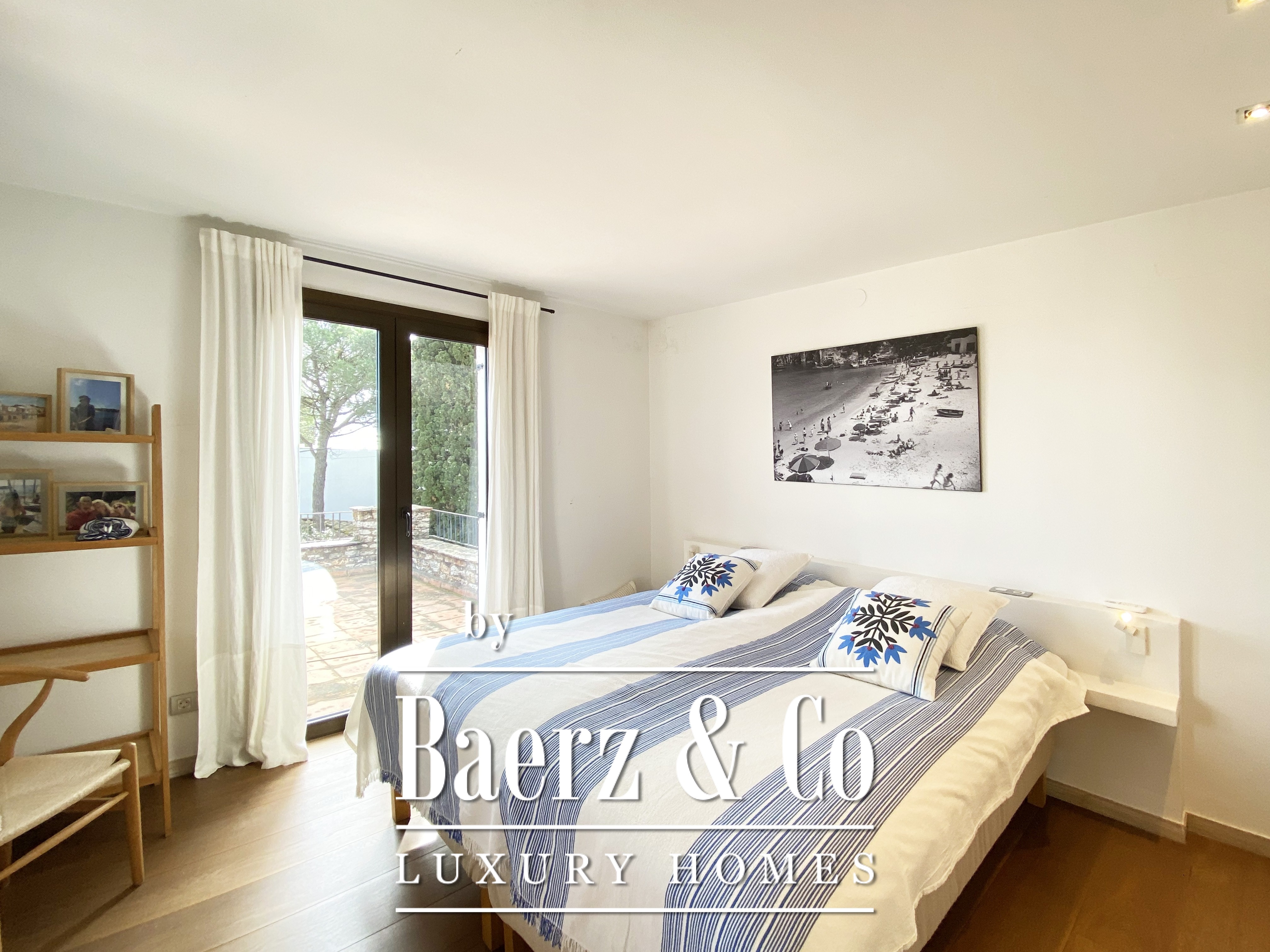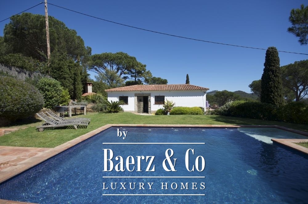 Outside, the meticulously maintained sunny garden frames a spacious swimming pool, ideal for quiet moments or gatherings. Features such as air conditioning, solar heating, and built-in wardrobes complement the serene setting. This contemporary villa in Begur offers subtle luxury and privacy against a backdrop of nature.