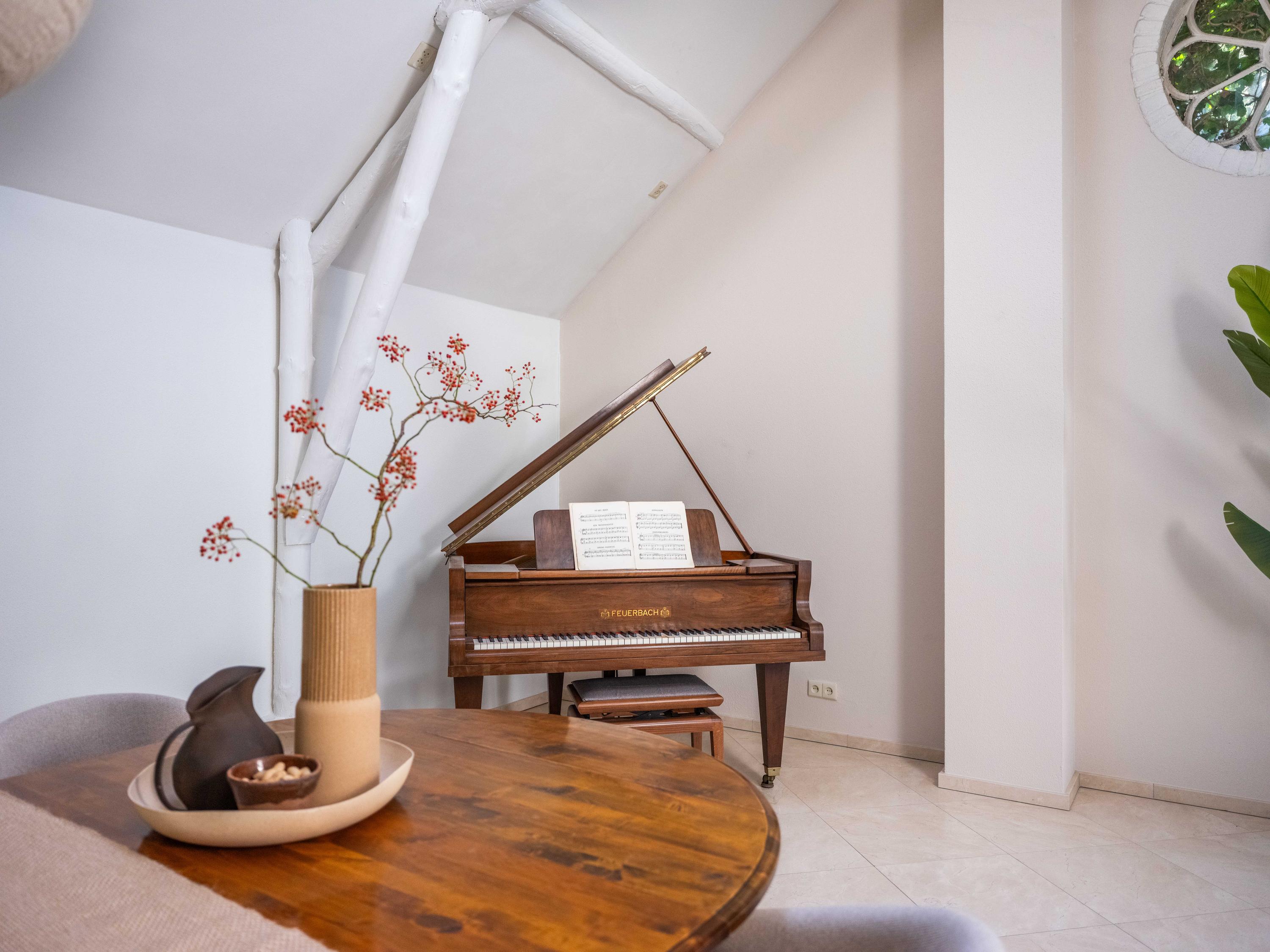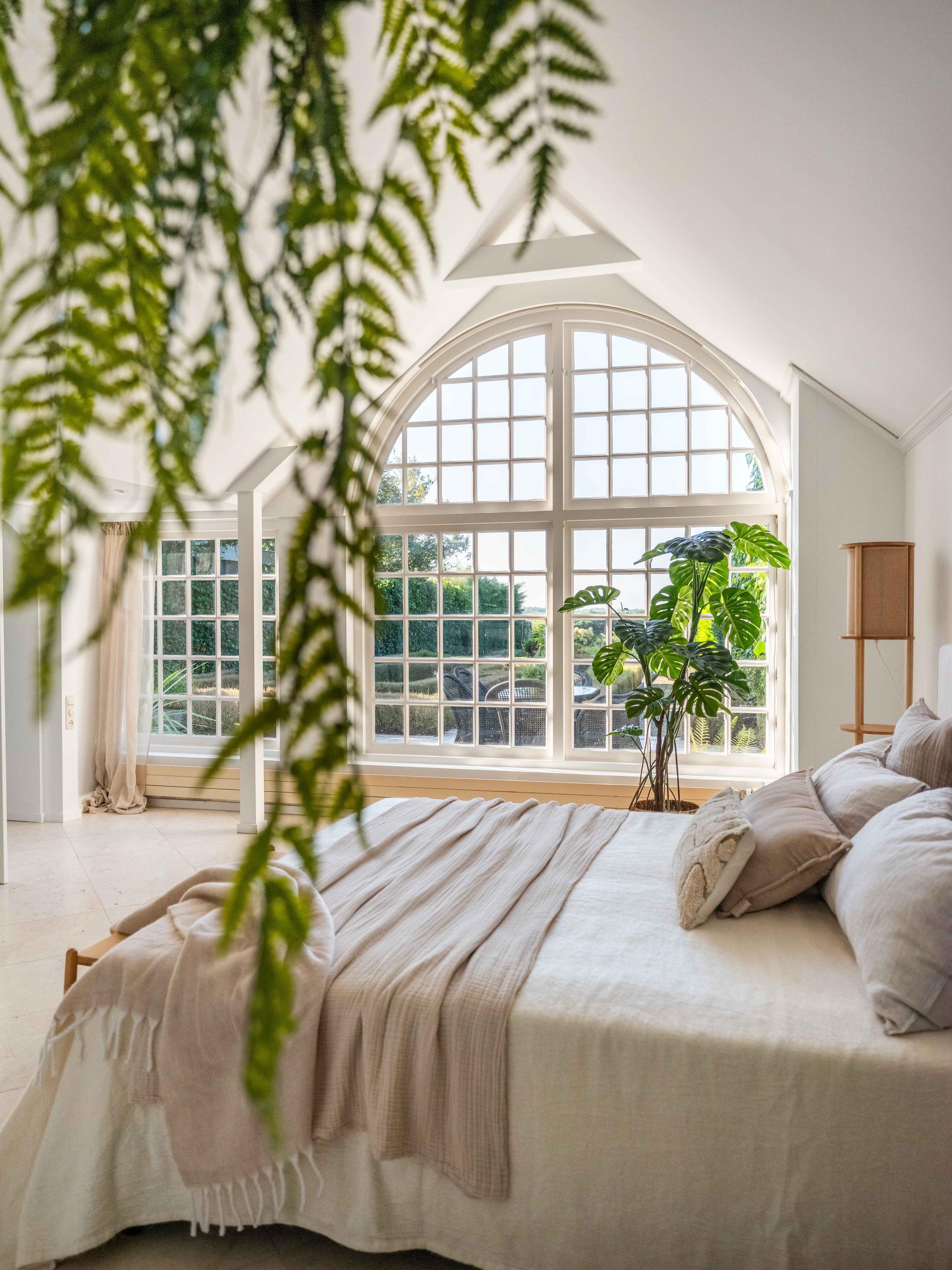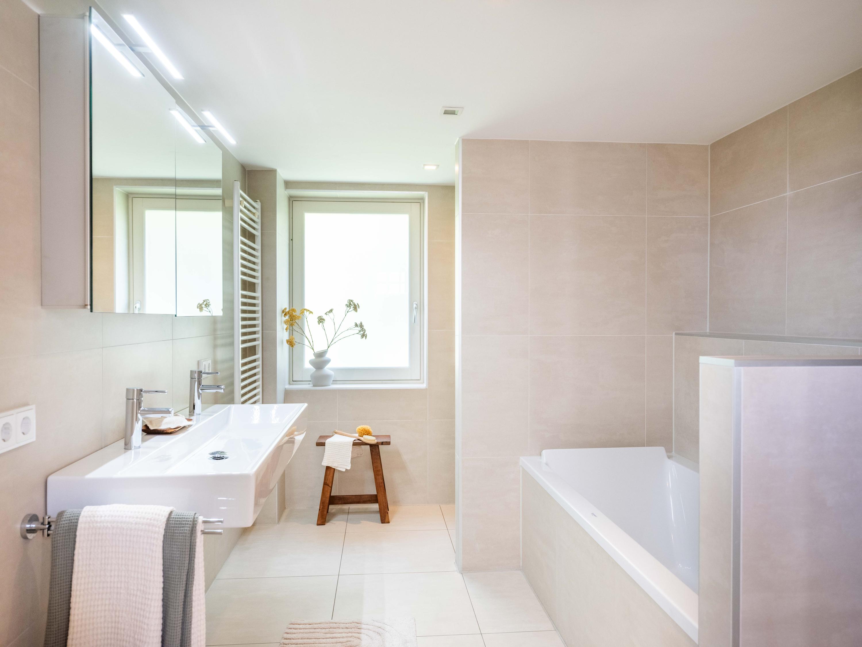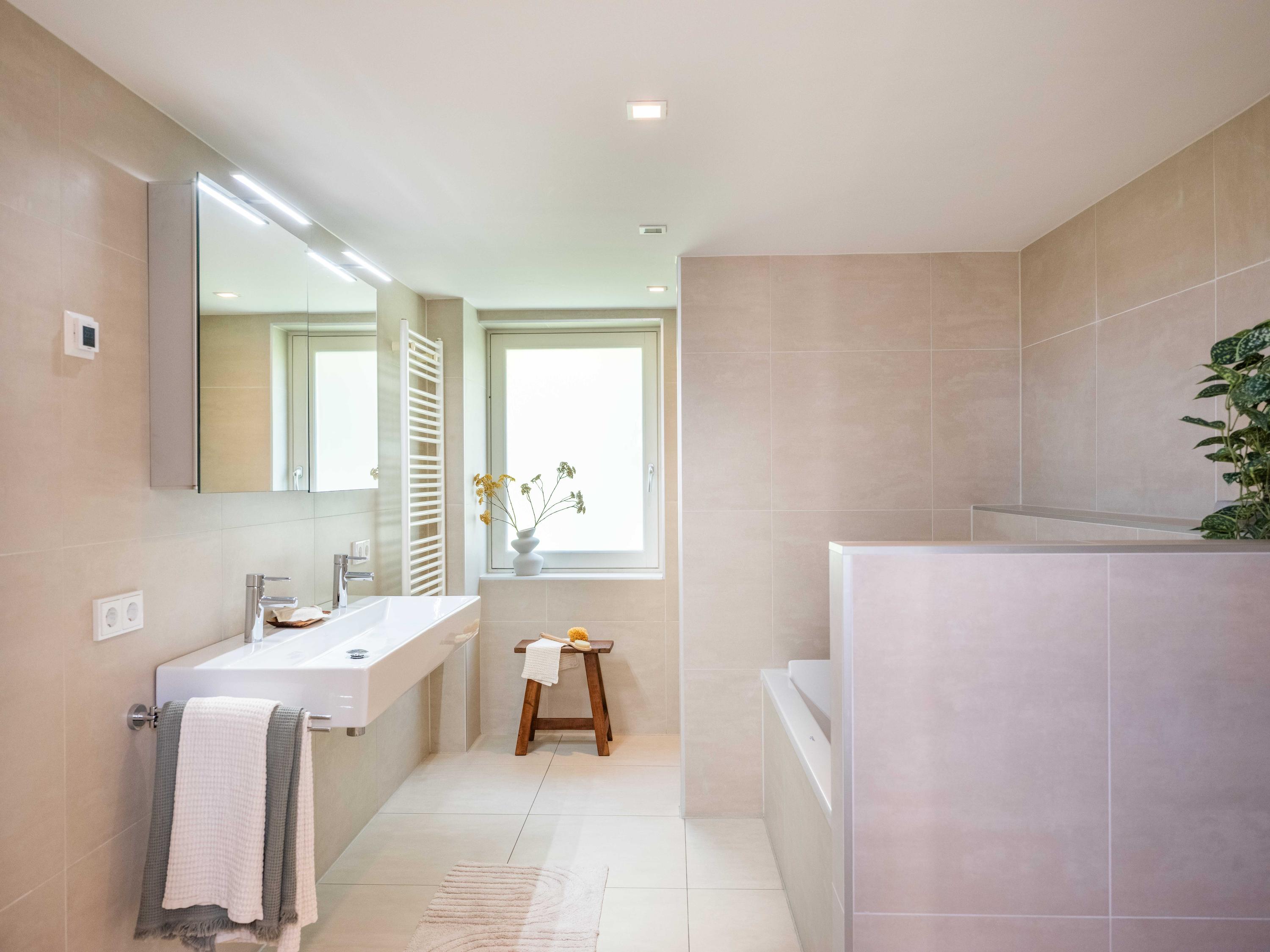On the second floor, we walk across the loft to the bedroom. This room has closets and provides access to a spacious roof terrace. From the terrace again a great view. The bathroom on this floor is surprisingly spacious and modern (2018). This bathroom has a bathtub, walk-in shower, double sink and toilet.