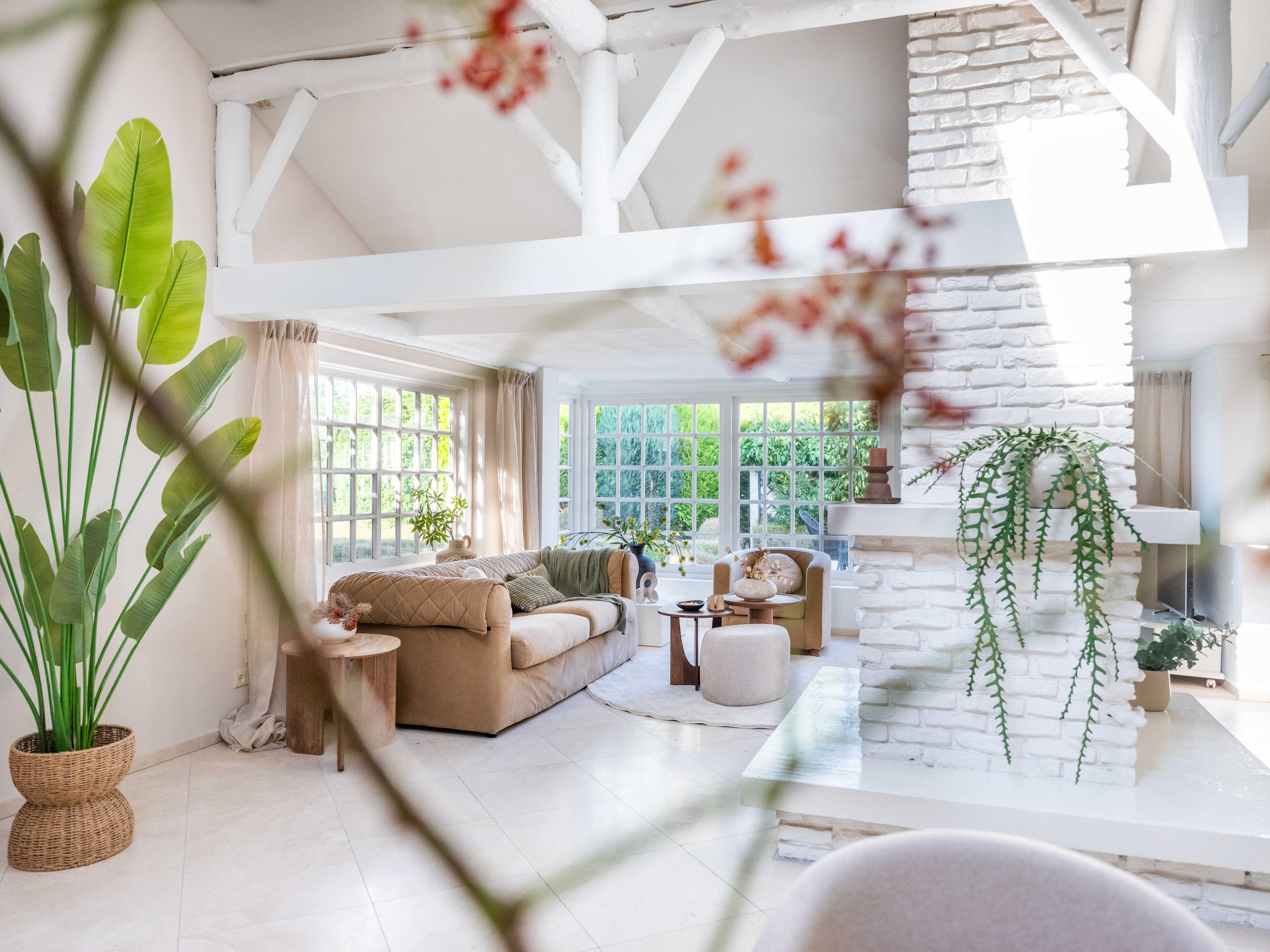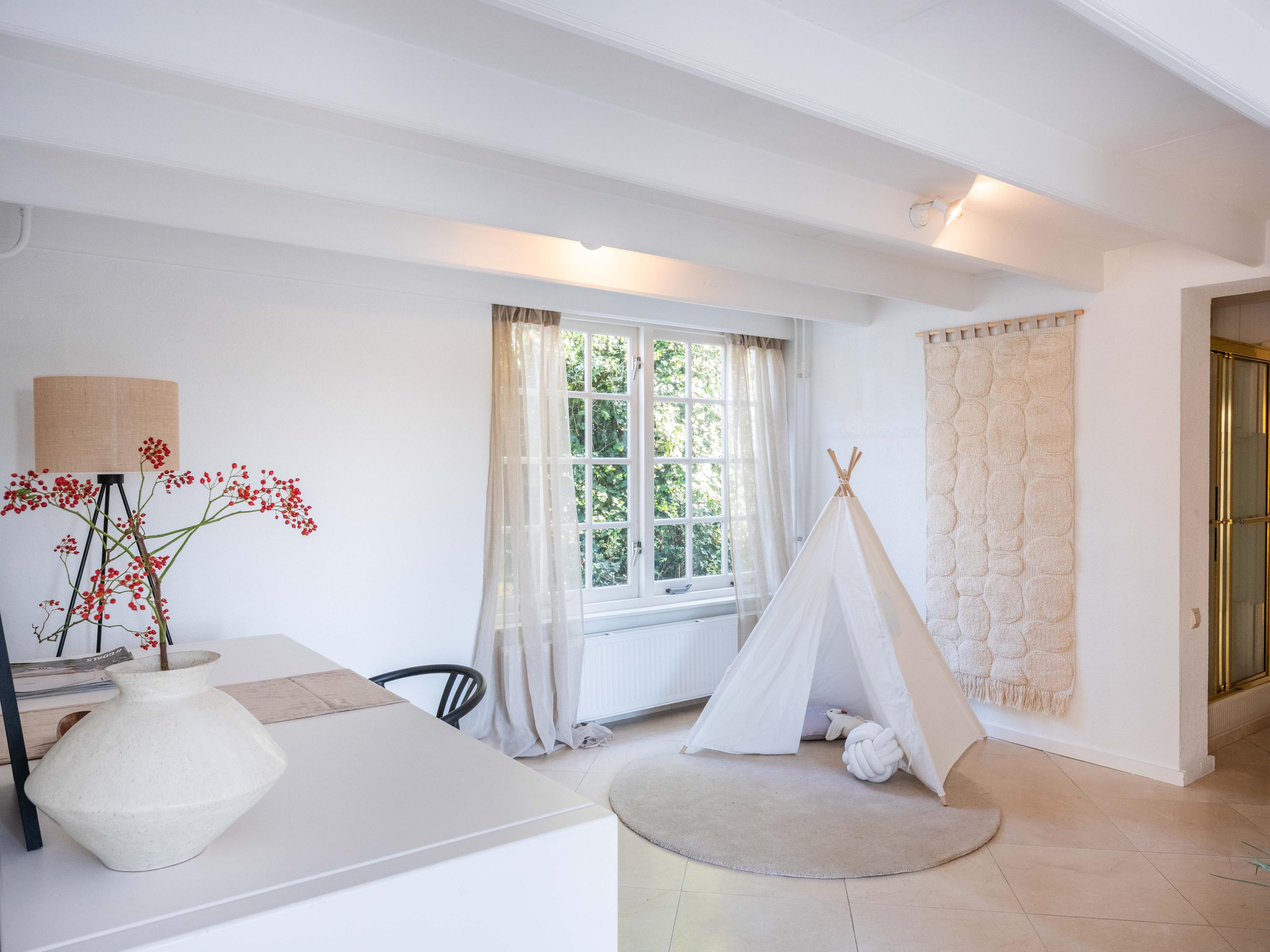 The spacious living room has a cozy gas fireplace (formerly fireplace) in the center of the room. The room is cozy with many authentic details. Think of the wooden beams in sight, a high ceiling up to the ridge and round stained-glass windows. At the back left we find the open kitchen with built-in appliances. From the kitchen we enter the utility room with the connection for the washer and dryer, the central heating system and a door to the outside.