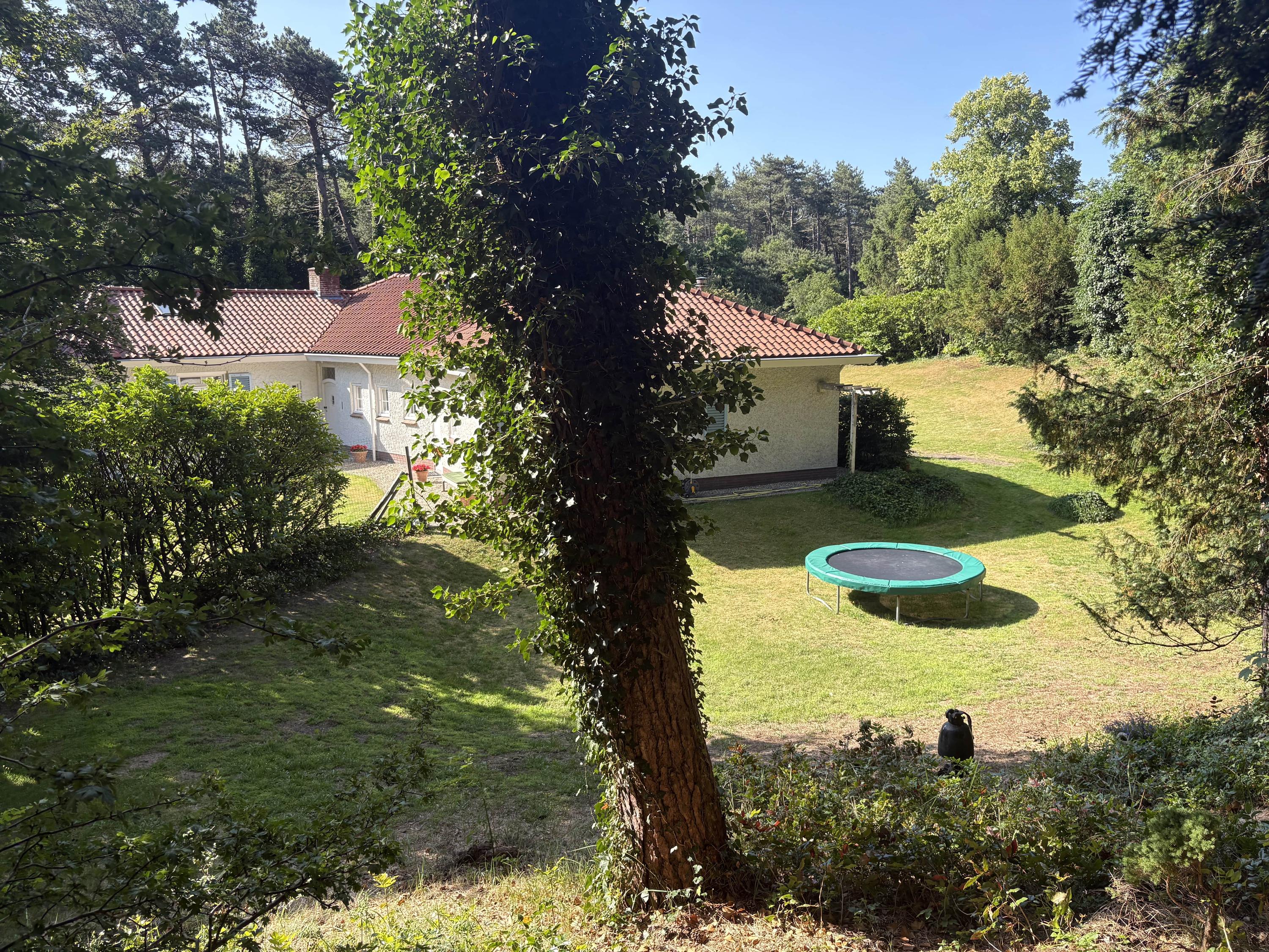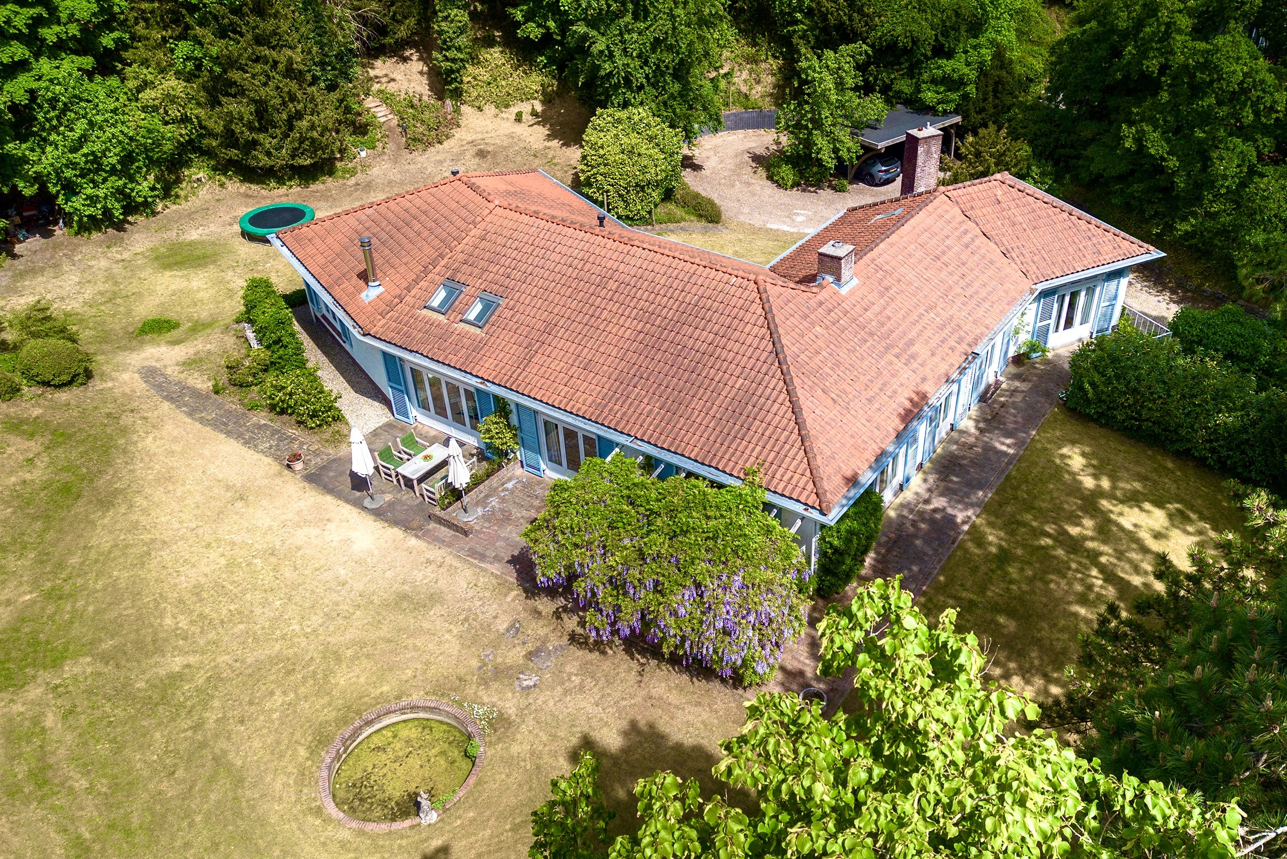 A sweeping driveway leads to a double carport with round point and ample parking, complemented by an indoor garage. The living area of 221 m² is arranged in both the original 1953 house and a 2001 extension, maintaining architectural continuity throughout. Interiors are composed for comfort: airy rooms are connected by French doors to the unusually varied and sunlit garden. The main living spaces blend parquet and terrazzo flooring, open fireplaces, and bespoke built-ins, shaping an atmosphere of understated warmth.