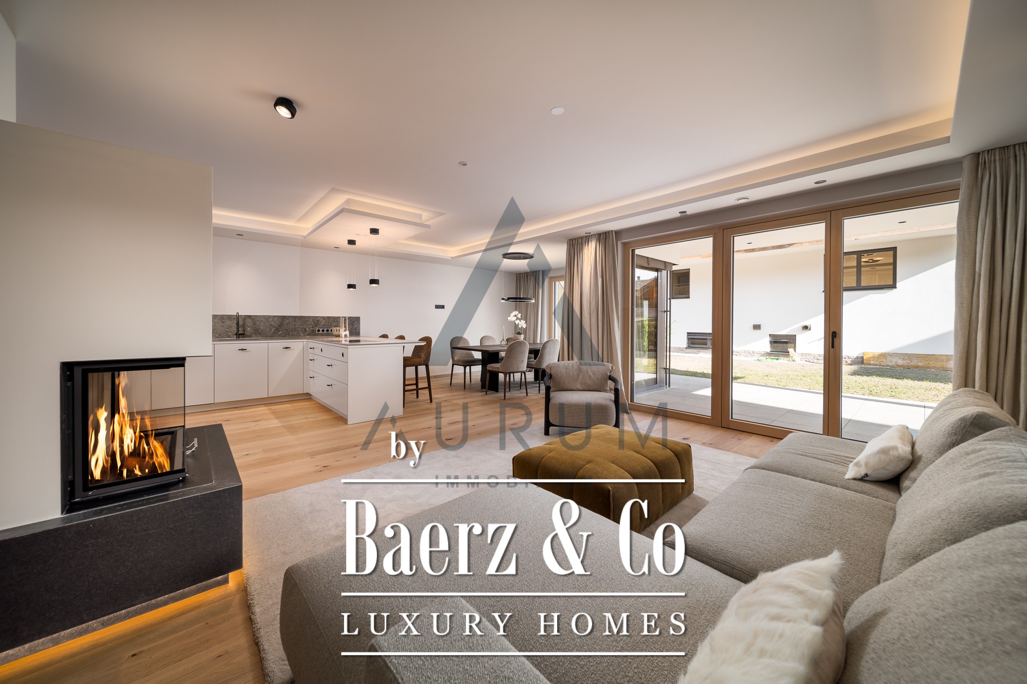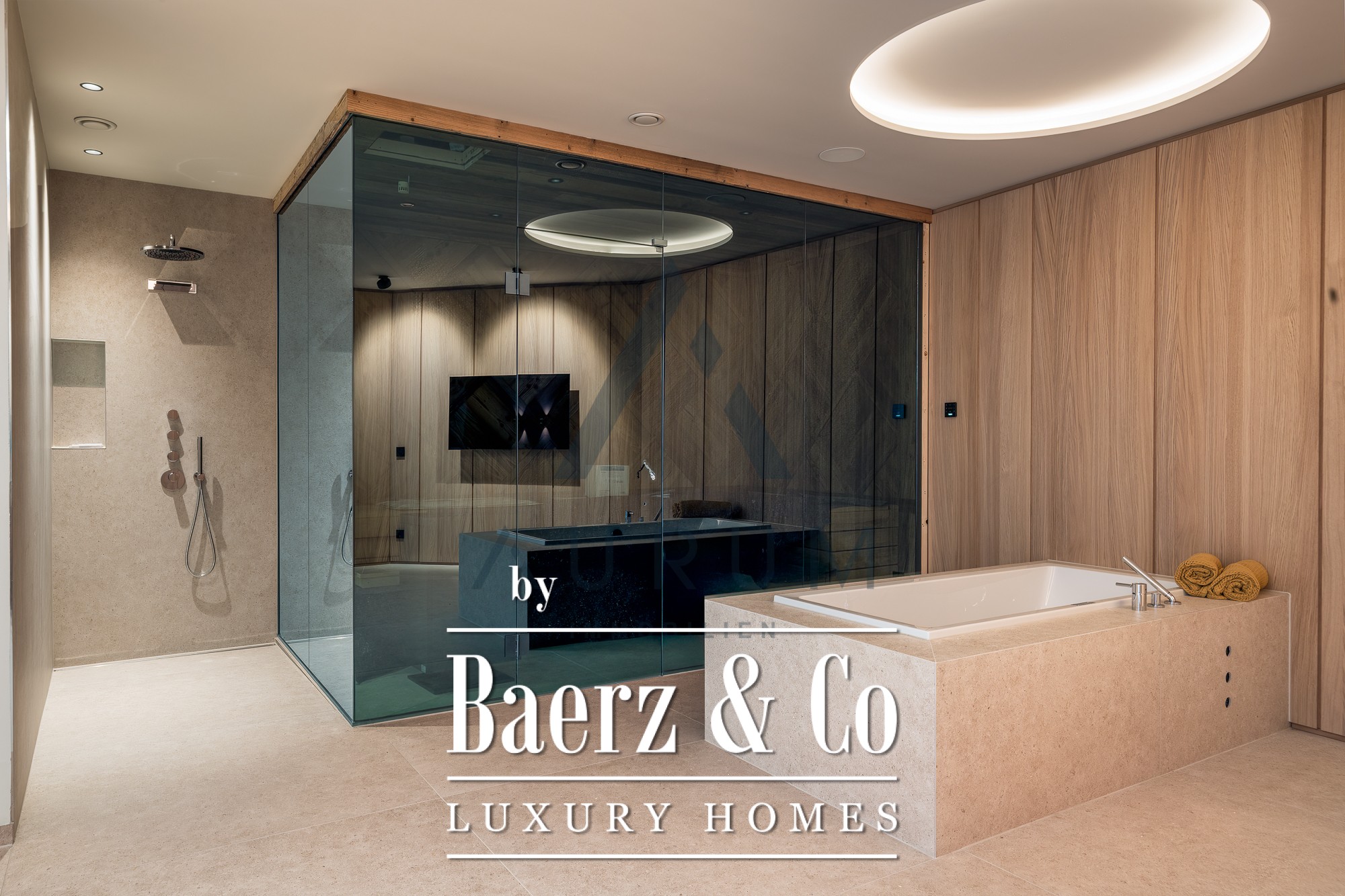 Within its 123 m² of living space, two bedrooms and two bathrooms integrate harmoniously with expansive living areas and a sauna, creating a sense of openness anchored by elemental materials and careful spatial planning. Floor heating ensures year-round comfort, while the Loxone BUS system and motorized blinds add contemporary efficiency. A guest WC, elegant lift access, and basement storage support daily living with seamless flow.