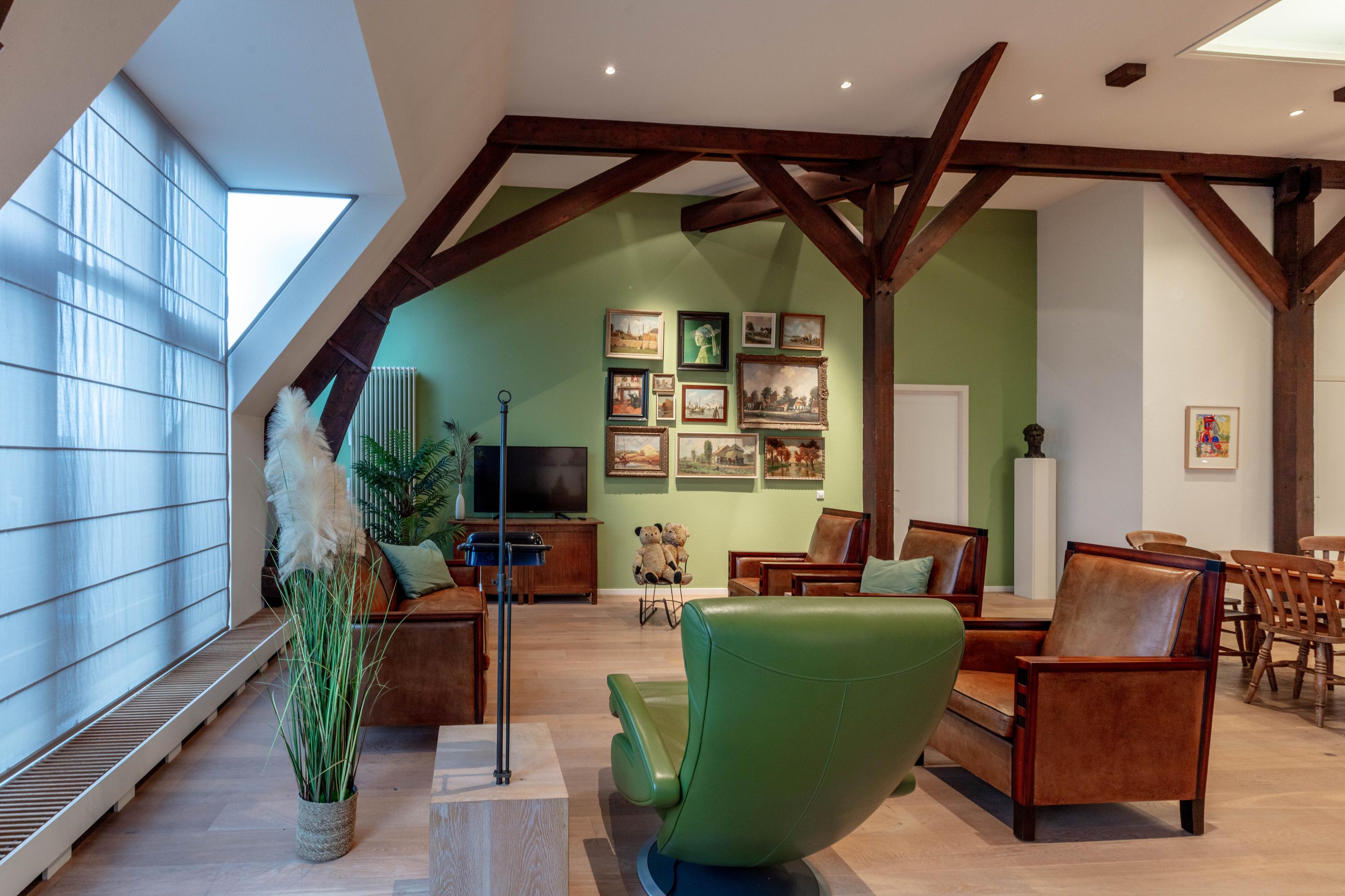 De bijzonder sfeervolle woonkamer is indrukwekkend door de unieke hoogte en fraaie zichtbare kapconstructie. De open keuken bevindt zich aan de achterzijde en beschikt over een kookeiland, volop kastruimte en diverse inbouwapparatuur. Vanuit de keuken is er prettig zicht op de woonkamer met een gezellig zitgedeelte en een apart eetgedeelte.
