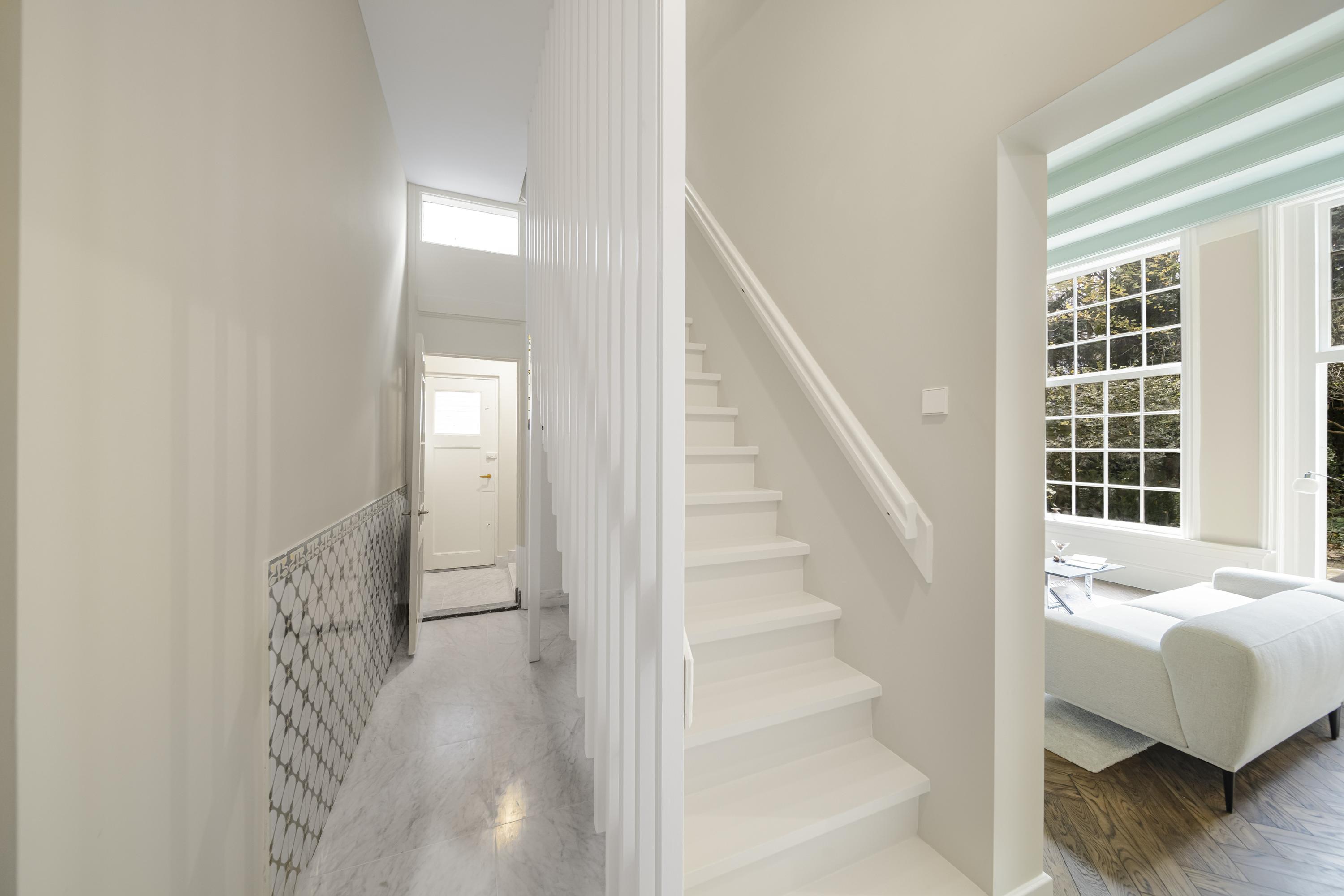 Entrance, long hallway, and impressive main hall featuring a classic black-and-white marble floor and monumental oak staircase. At the front are two rooms with original fireplaces—ideal as offices or consulting rooms. Adjacent is a spacious intermediate room that flows into the sunny, garden-facing living room with monumental fireplace.