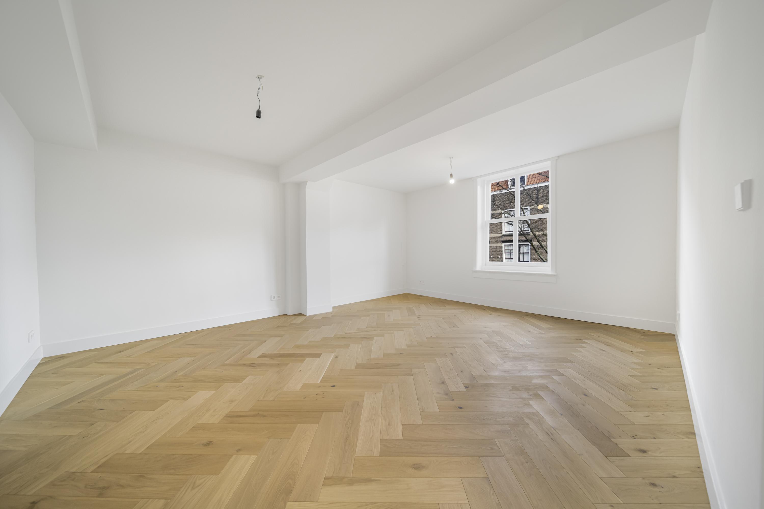 Newly installed herringbone parquet flooring on the ground and upper floors