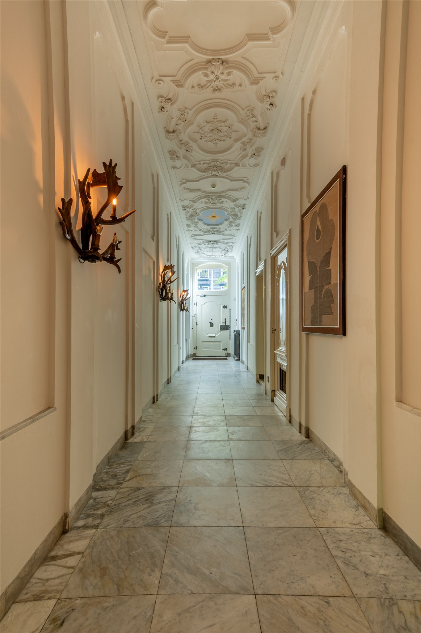 At the front: the grand living room with soaring four-metre ceilings, oak flooring, and a splendid view over the canal and the historic Armamentarium.