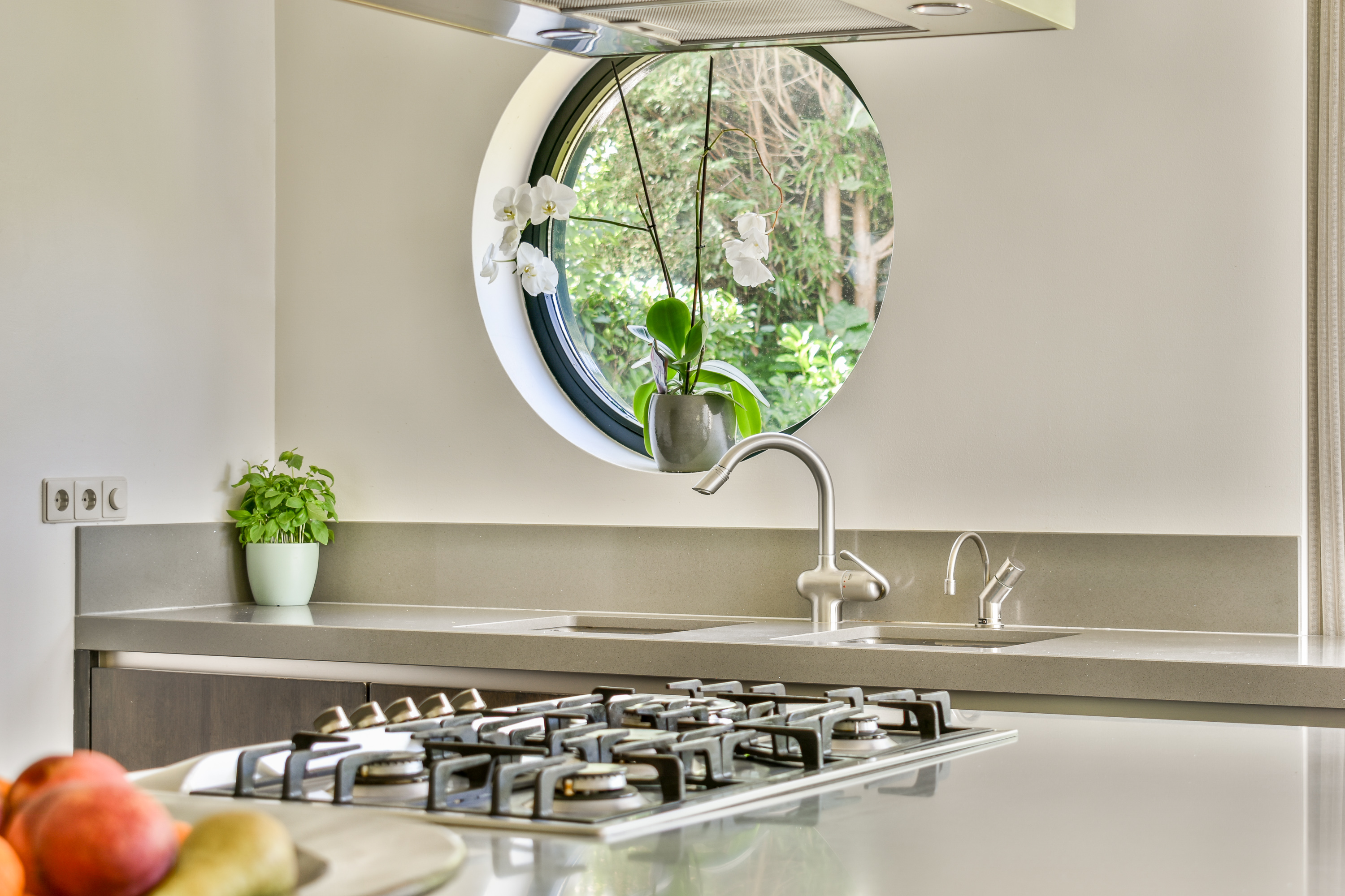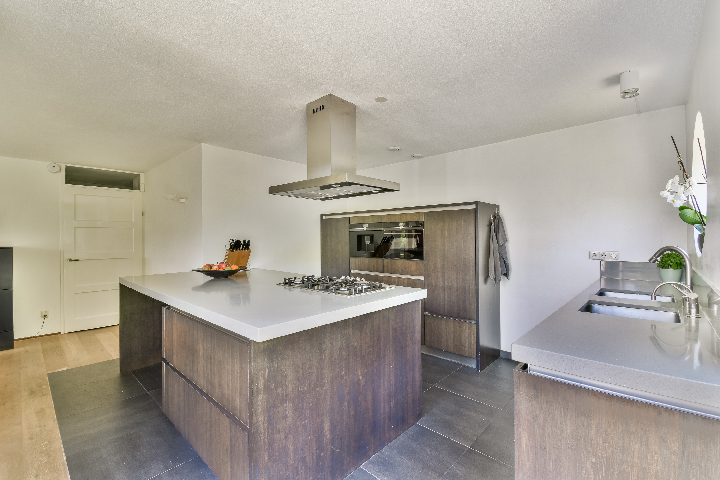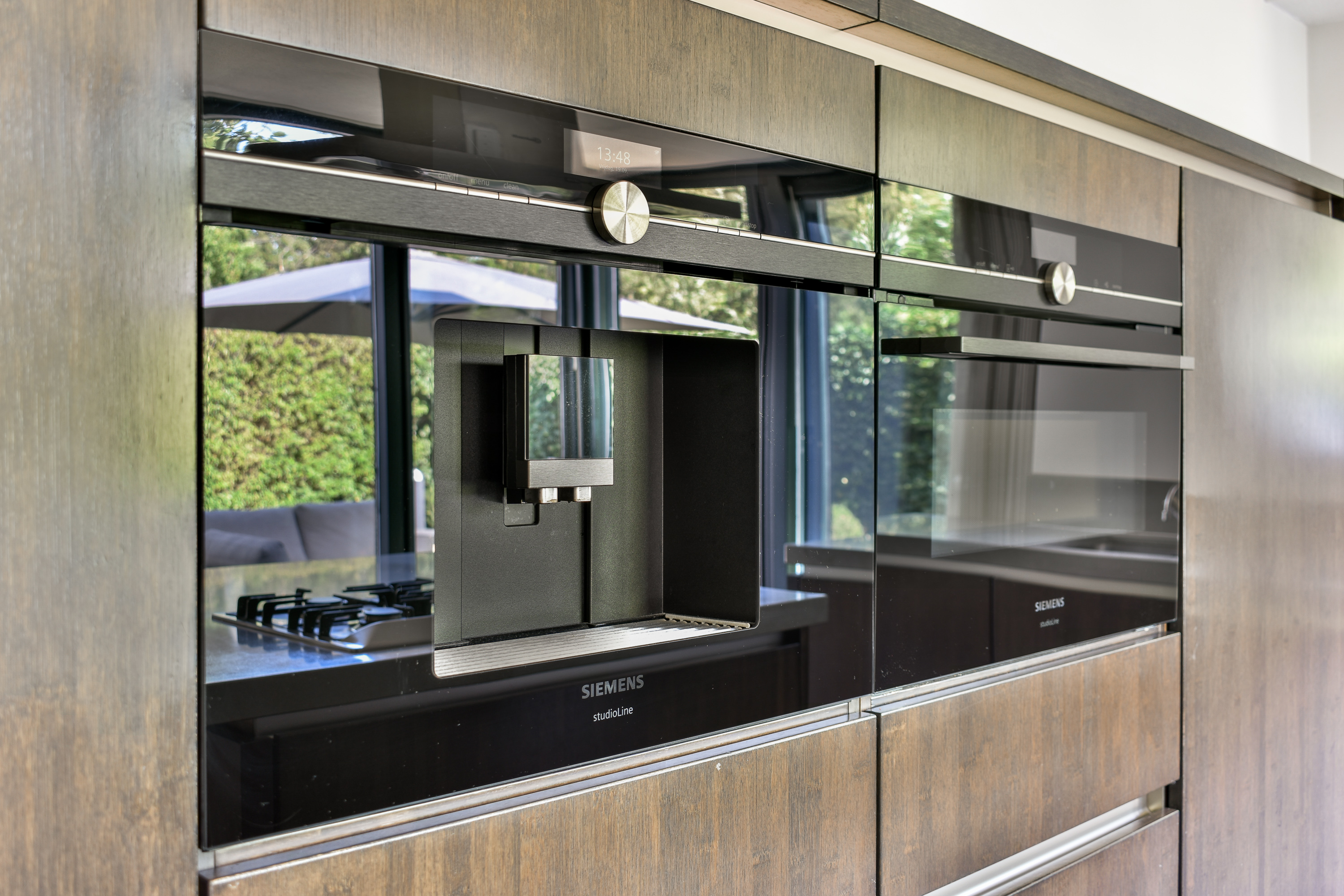 A luxury open kitchen featuring a large worktop with integrated breakfast bar, double sink, and extensive built-in appliances, including: a Quooker boiling-water tap, 5-burner gas cooktop, extractor hood, combination oven, built-in coffee machine, dishwasher, freezer, and refrigerator. The kitchen also grants direct access to the terrace and garden.