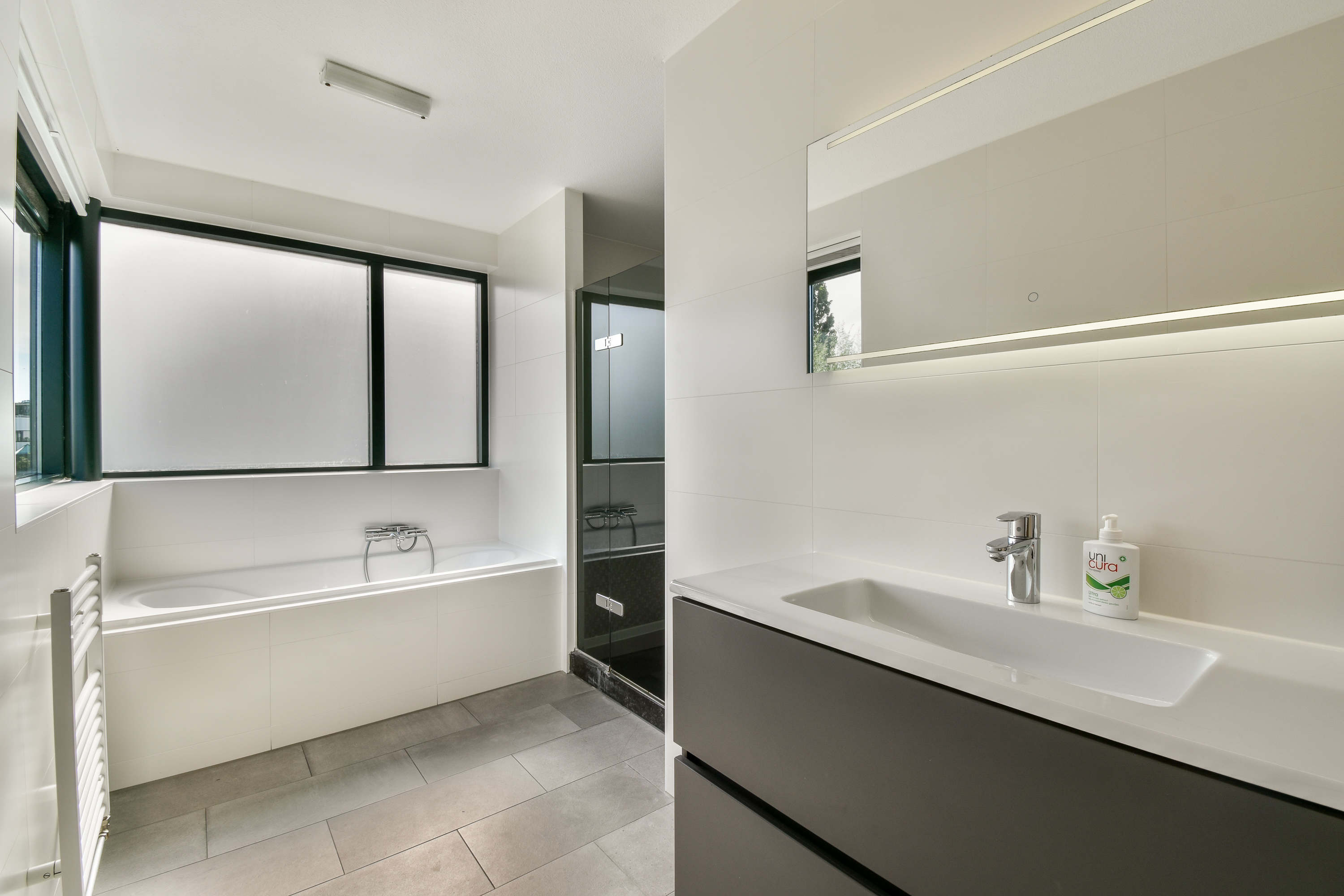 En-suite bathroom, accessible from the primary bedroom, featuring a bathtub, washbasin unit, and separate shower.