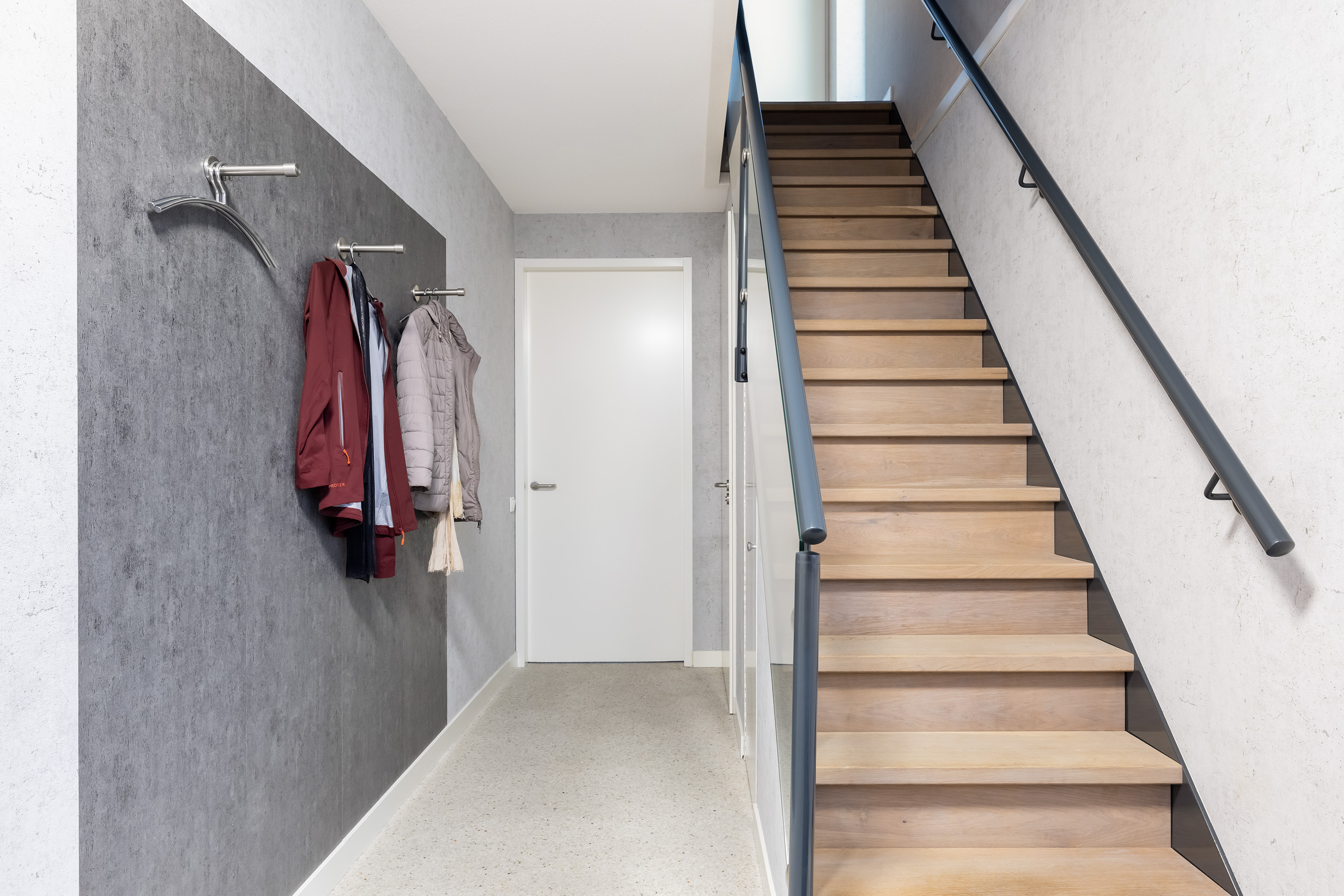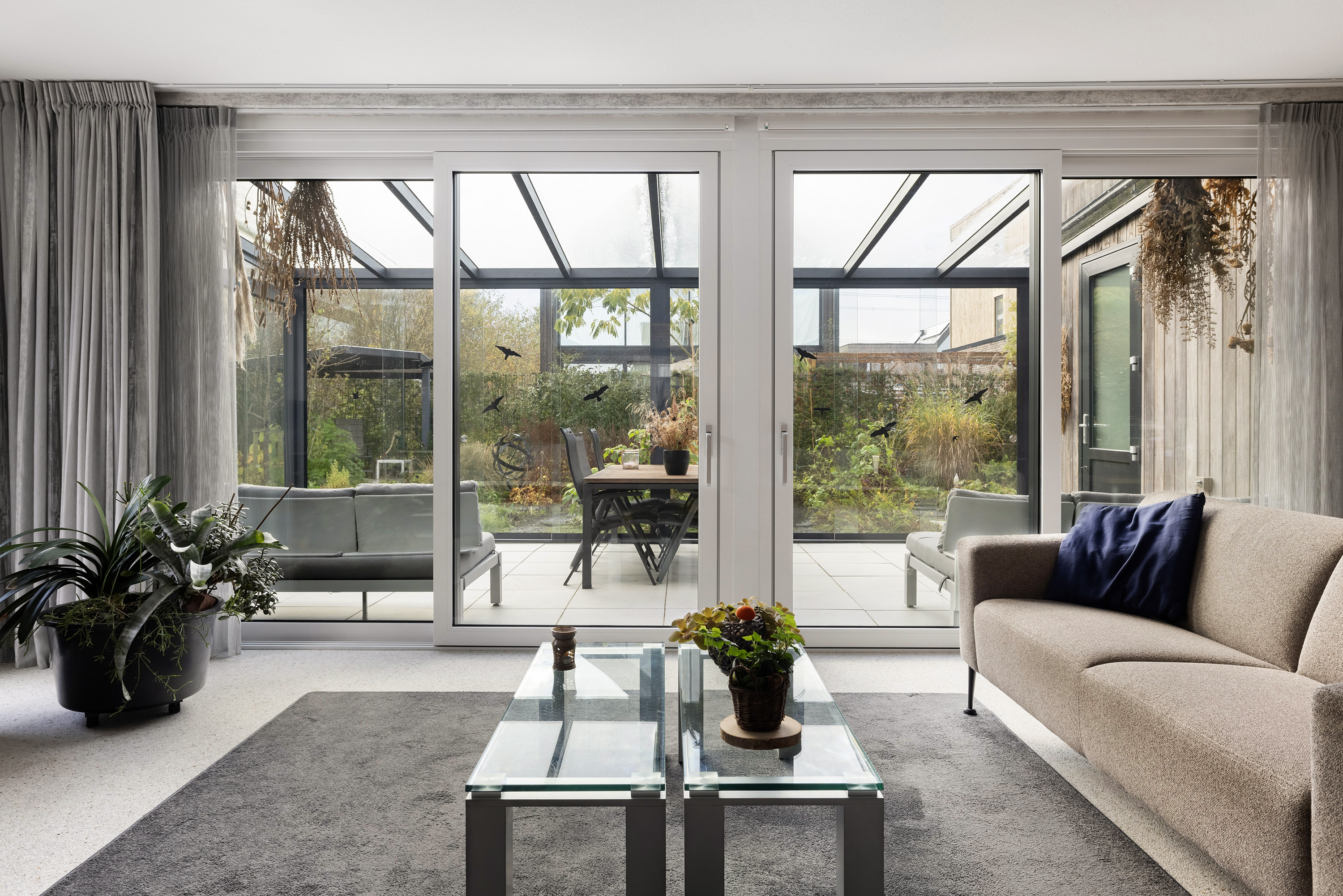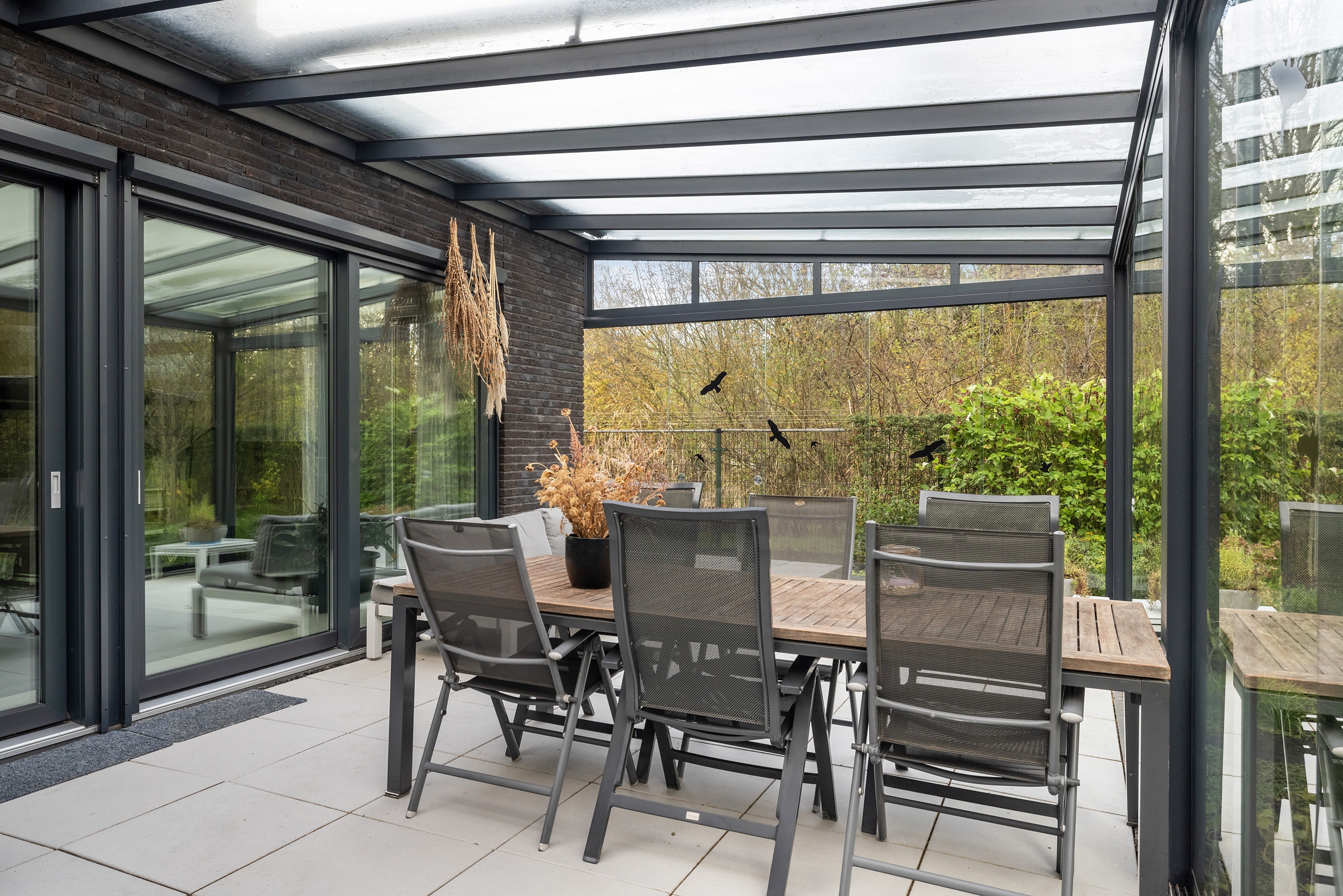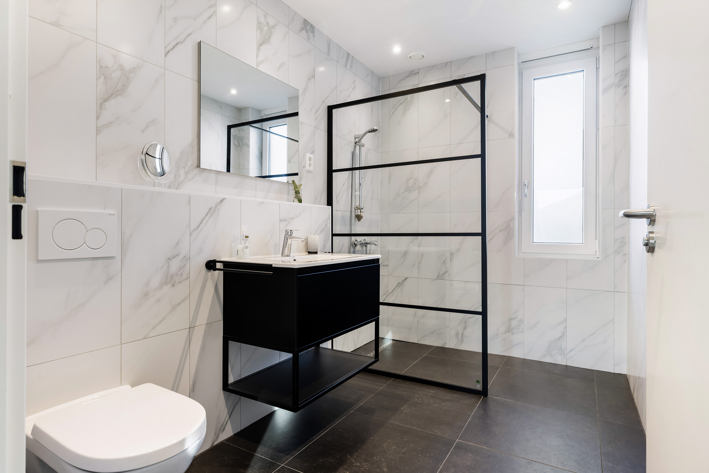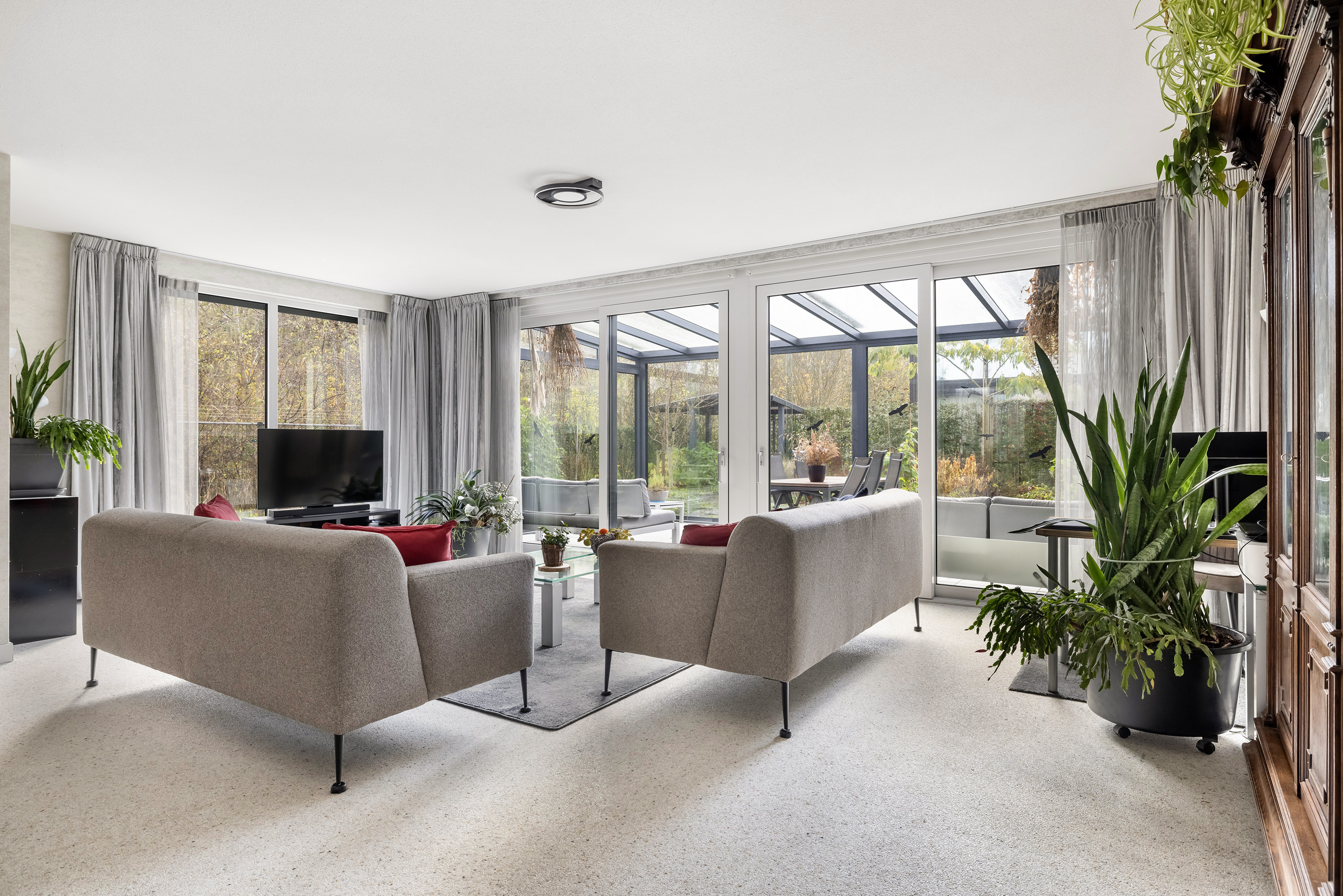The ground floor is anchored by a spacious living room of 45 m², its large windows welcoming natural light and garden views. The open kitchen is fitted with high-end appliances and a central island, while adjacent spaces include a utility room and a guest bedroom with direct garden access. A Carrara Italian marble-gravel floor adds subtle texture to the main living area, seamlessly leading out to a fully enclosed conservatory—a year-round connection to the outdoors.