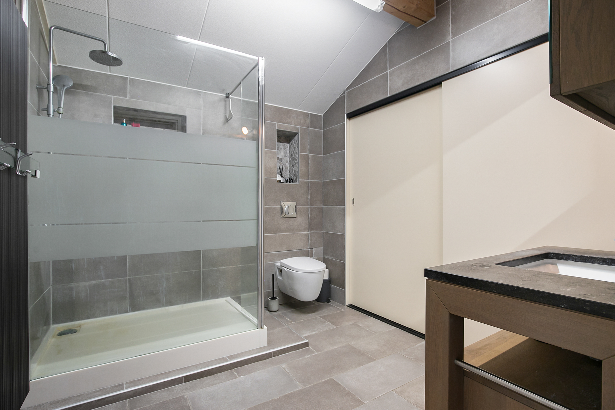 From the living room, you can access the guest bedroom. This bedroom has a natural stone floor, stucco walls and a stucco ceiling with recessed lighting. From this room, there is access to the bathroom. This bathroom is finished with the same natural stone floor as in the rest of the rooms. The walls and ceiling have stucco. The bathroom is further equipped with a spacious walk-in shower with sun shower, two washbasins with cabinet, a floating toilet and a design radiator. A window provides natural light. From the bathroom, you walk further to the master bedroom.