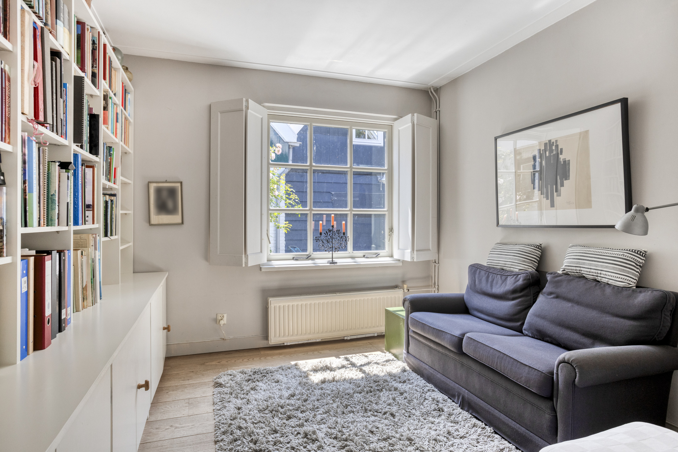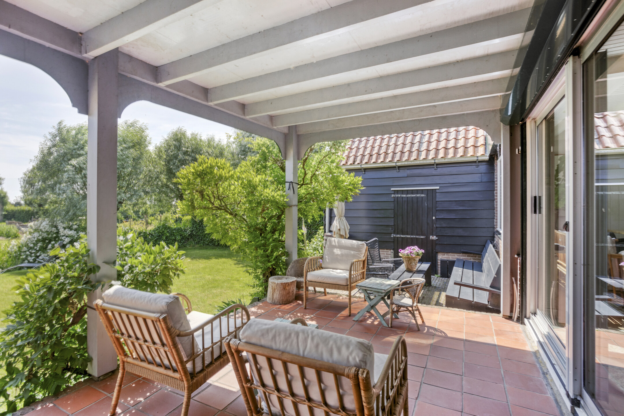 In the rear extension, you’ll find an impressive garden-facing living room with a charming gas fireplace and a large sliding door that opens onto a covered terrace. The sliding door is fitted with a shutter, providing extra comfort and privacy. The living area feels spacious and open, with wonderful views of the garden. Adjacent is a utility room, ideal for laundry, storage, or supplies. The intermediate hallway by the staircase is also perfectly suited as an office or workspace.