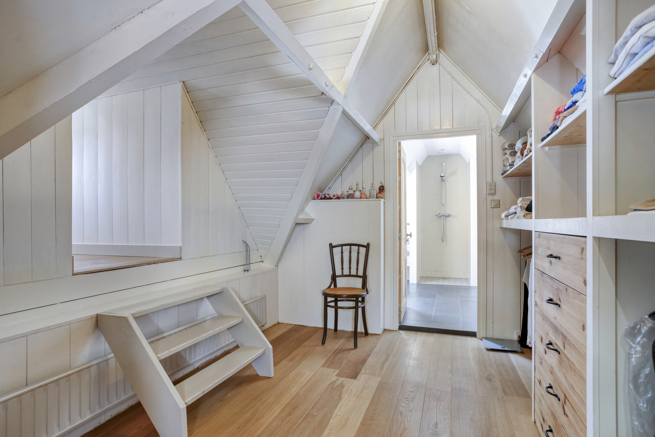 A special element is the hidden doorway in the wardrobe, which leads to a spacious walk-in closet. To the right of this space is an additional room—ideal as an office, hobby room, or guest bedroom. On the left is the bathroom, fitted with a bathtub, walk-in shower, washbasin, vanity unit, and a second toilet.