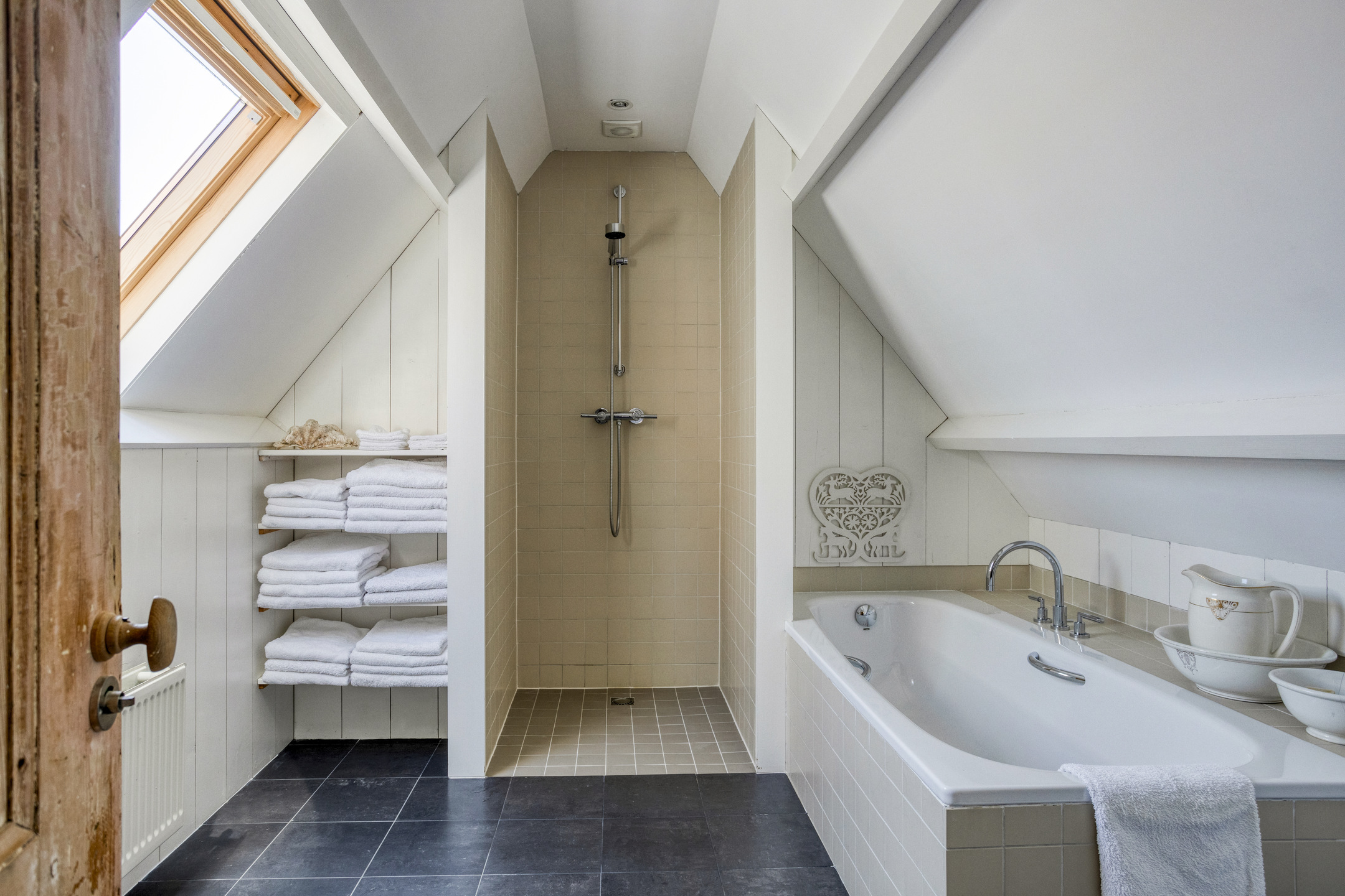 The transition to the rear house is formed by a spacious hallway, which not only functions as a practical connecting space but also features a shower and a toilet with washbasin.
