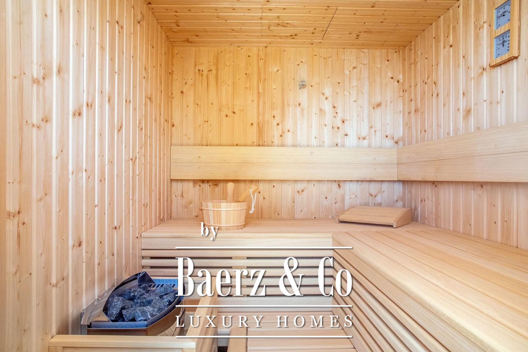 Outdoors, a 32 m² pool with a 40 m² sunbathing deck anchors an area dedicated to leisure and entertaining, including a summer kitchen with fireplace, sauna, covered terrace, and landscaped gardens with automatic irrigation. Additional amenities such as a two-car garage, recreation room, technical spaces, and solar water heating system reinforce both comfort and sustainability.