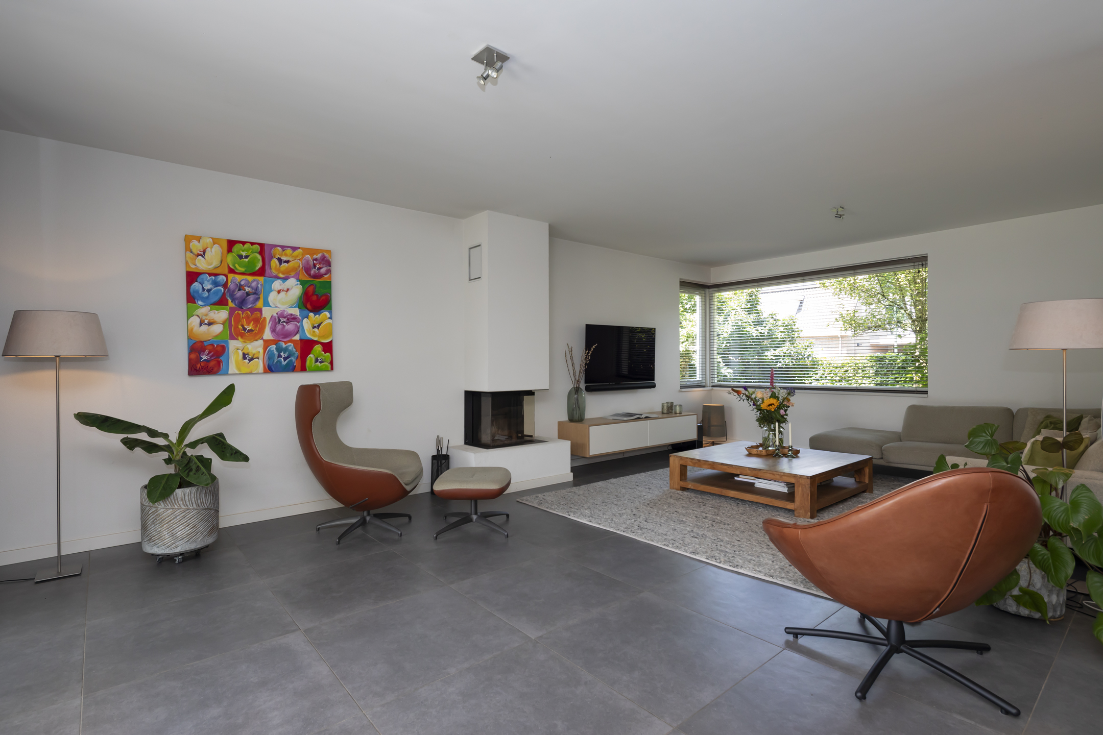 The inviting fireplace is centrally located in the living room. The living room is sunny thanks to the large windows at the front and sliding doors at the rear, which open onto the lovely covered terrace.