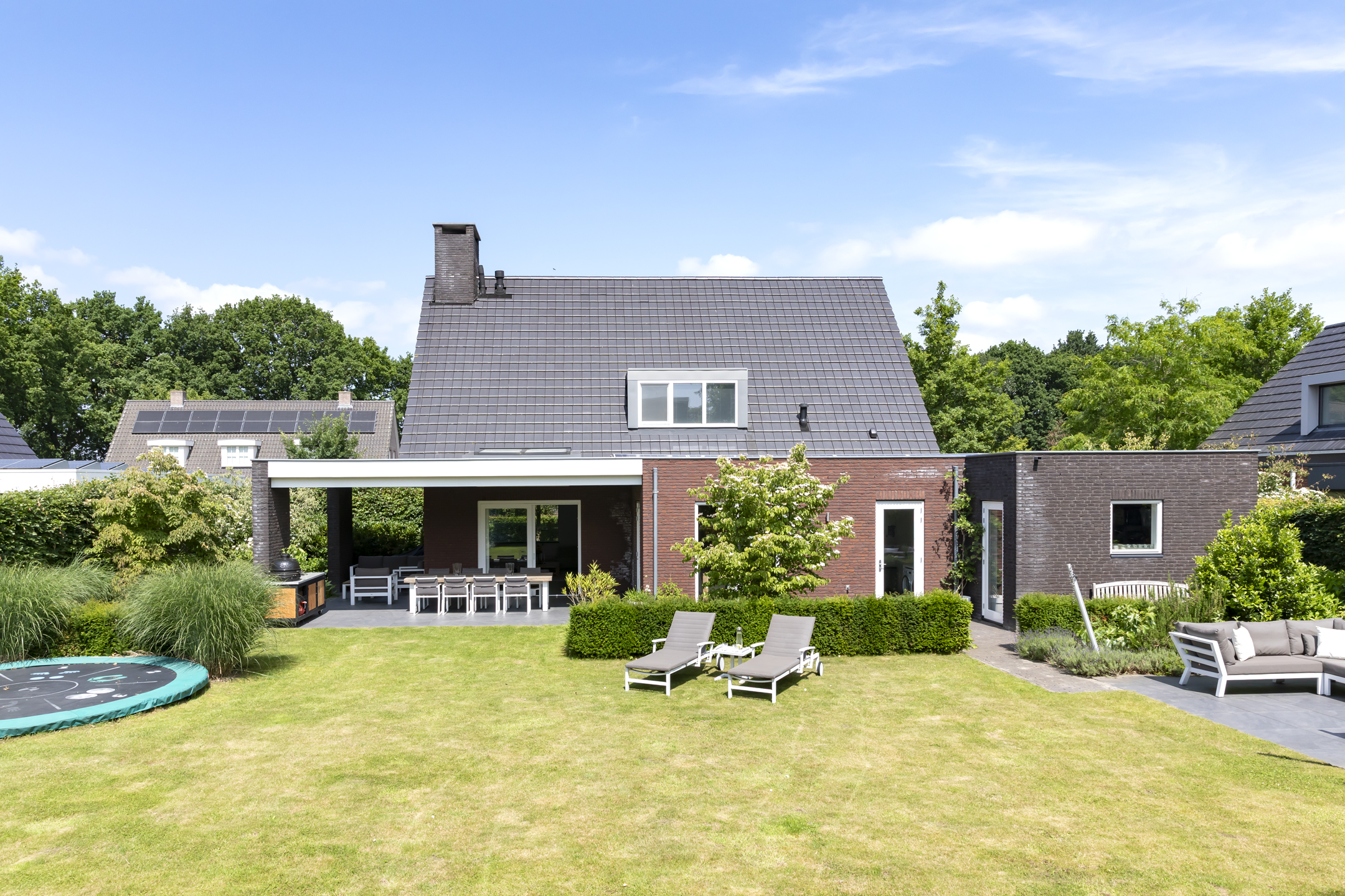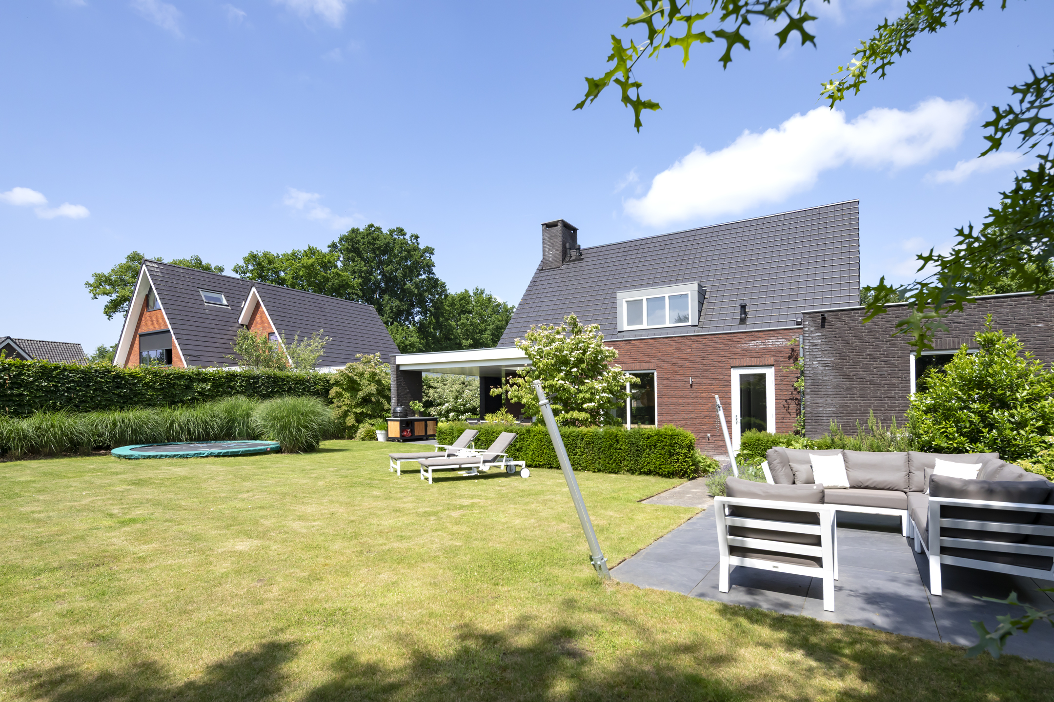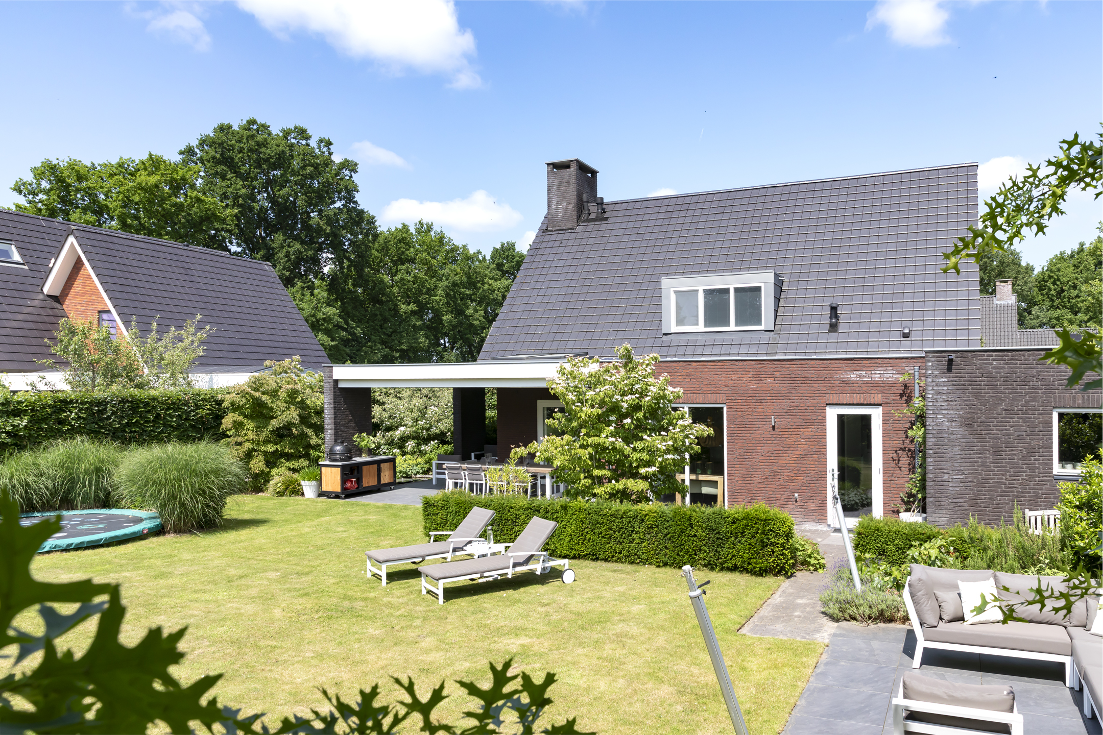 The garden is fantastic, offering wonderful privacy. The beautiful garden is bordered by green hedges, ensuring minimal views. A lovely lawn with a spacious sun terrace provides ample space for playing. In addition to the sun terrace, there is also a beautiful, spacious covered terrace adjacent to the rear of the house. The covered area has a large skylight, ensuring optimal daylight penetration into the living room. And then there's the unique sauna in the garden, where you can relax after a hard day's work. The front garden is also neatly landscaped and has a spacious driveway with space for 4 to 6 cars.