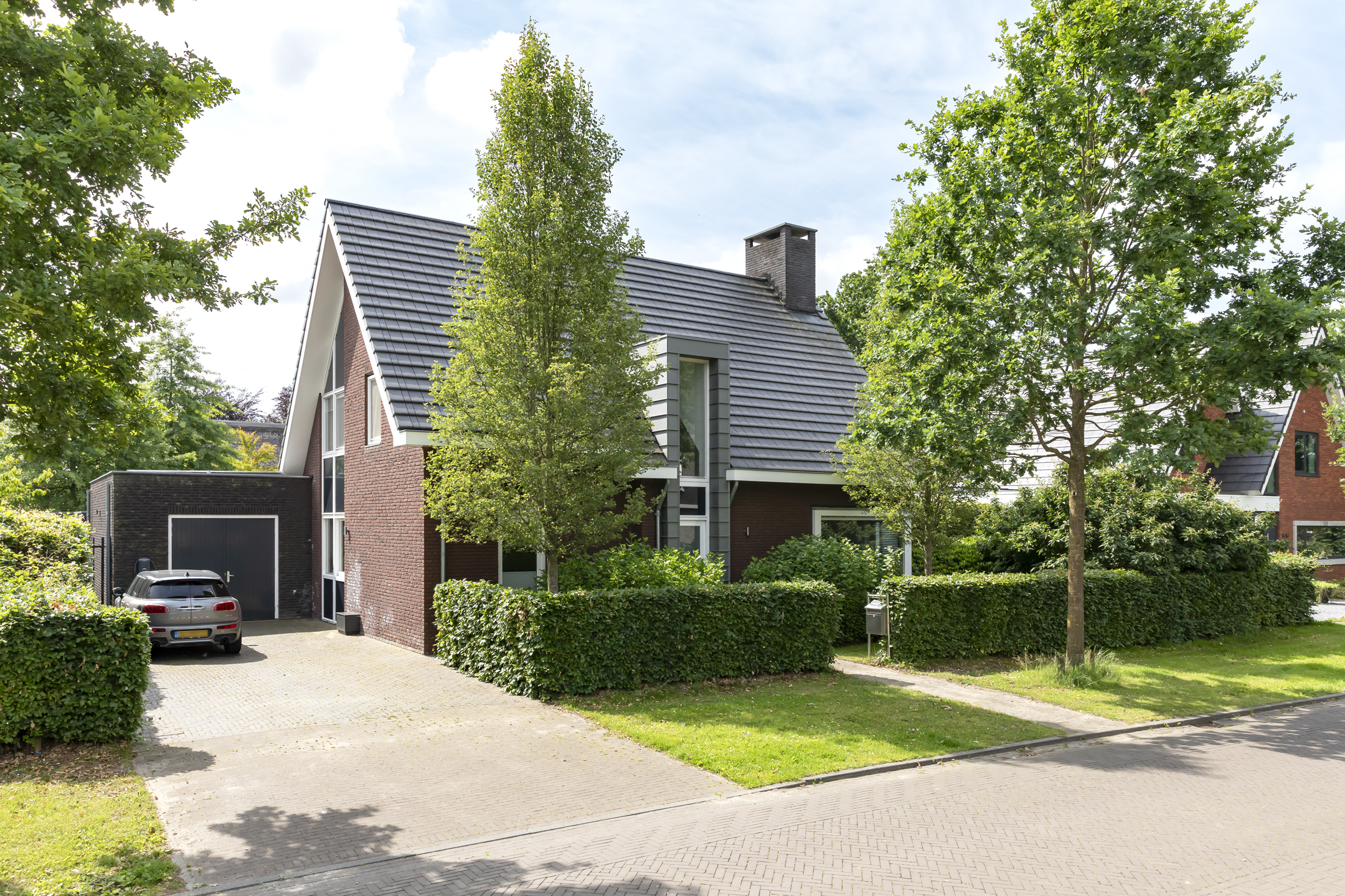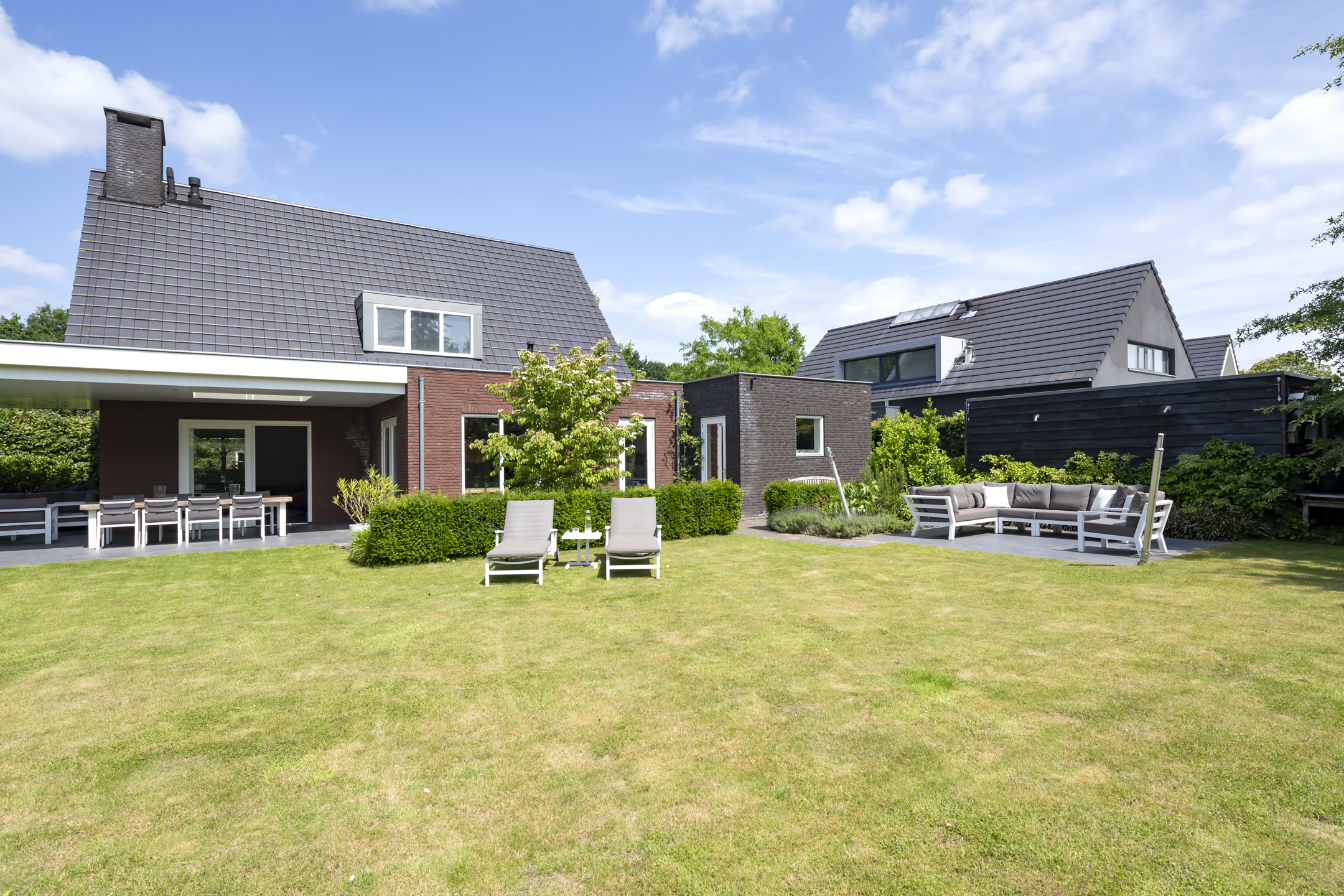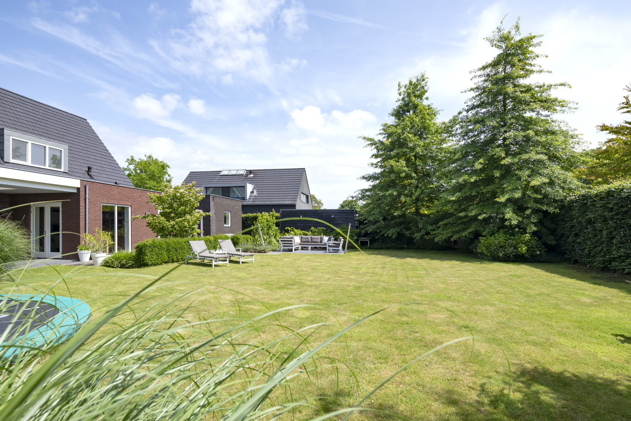 The garden is fantastic, offering wonderful privacy. The beautiful garden is bordered by green hedges, ensuring minimal views. A lovely lawn with a spacious sun terrace provides ample space for playing. In addition to the sun terrace, there is also a beautiful, spacious covered terrace adjacent to the rear of the house. The covered area has a large skylight, ensuring optimal daylight penetration into the living room. And then there's the unique sauna in the garden, where you can relax after a hard day's work. The front garden is also neatly landscaped and has a spacious driveway with space for 4 to 6 cars.