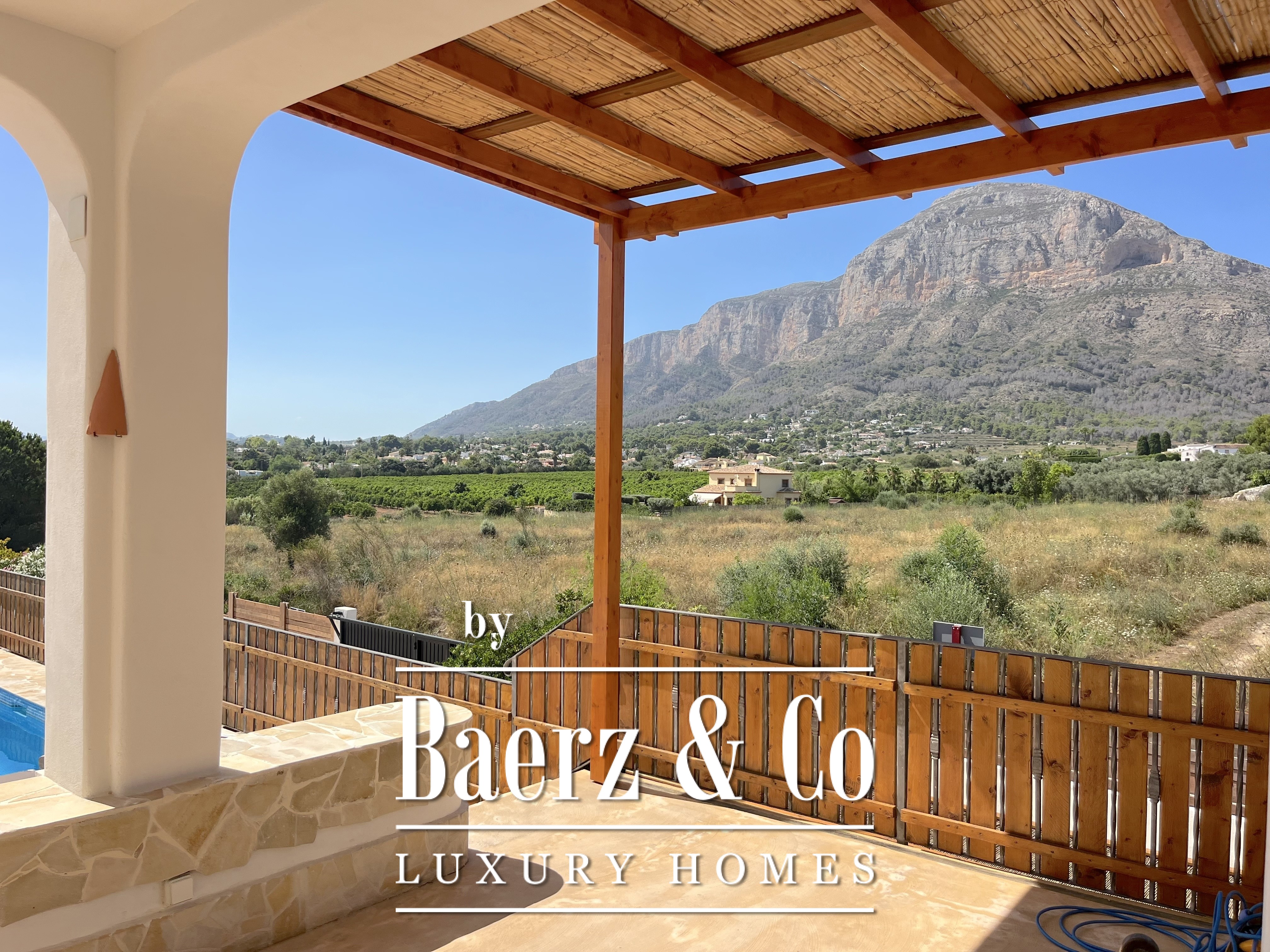 Set on a former olive grove of 1,700 m², the finca enjoys uninterrupted views of the lush green valley and the majestic Montgó Mountain.