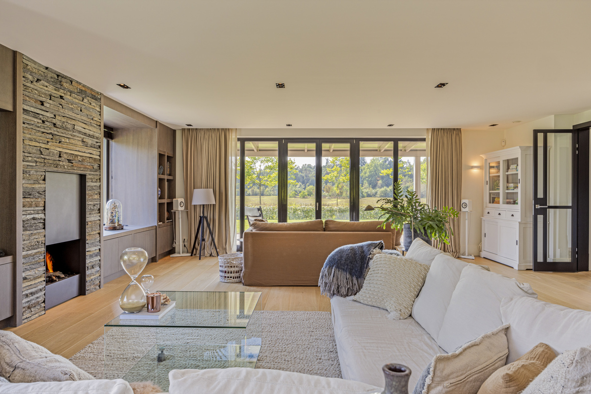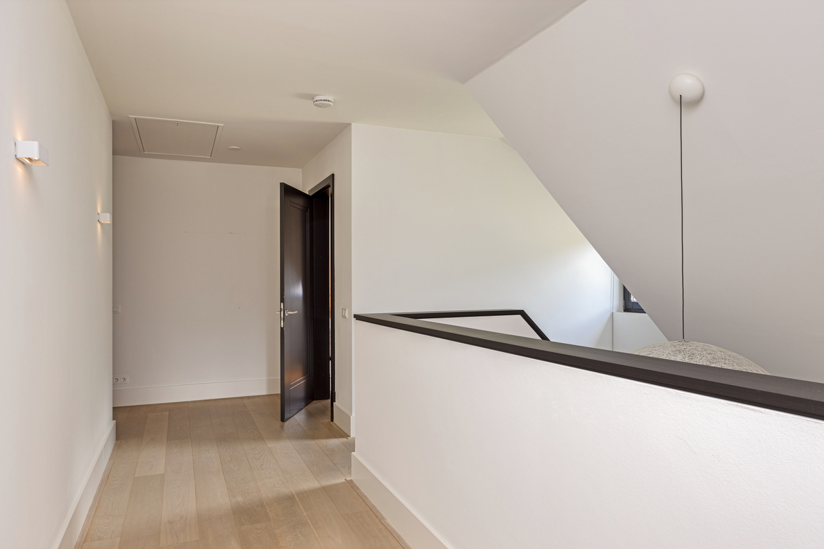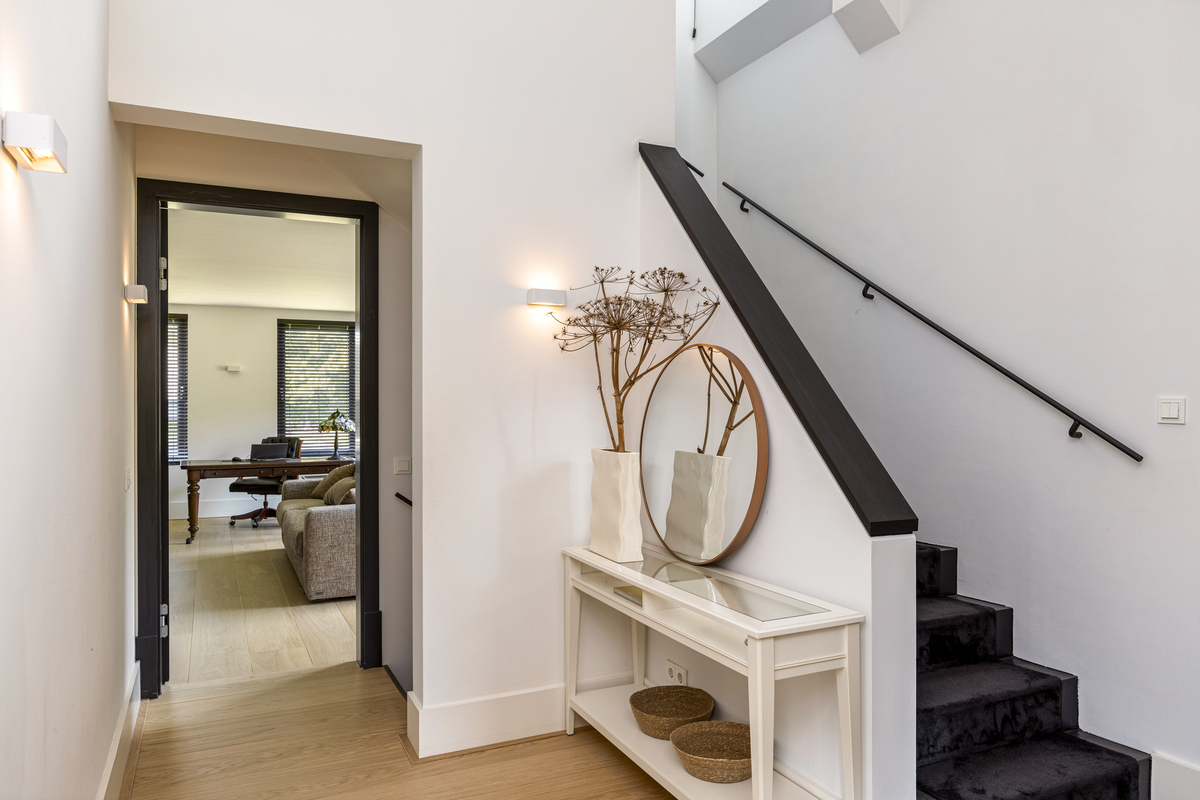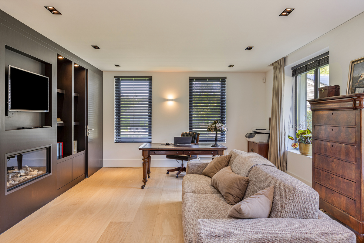 Entrance at the front of the house, in the central hall. Immediately on the right is the staircase to the upper floor. Right access to the study or extra bedroom, with magnificent bathroom, complete with walk-in shower, WC, bidet and sink. Straight through the lock to the kitchen diner, with WC with separate sink and large mirrors. To the left of the lock is a magnificent built-in cupboard with paneled doors. The woodwork is painted black, giving the house a classic-modern character. Left access to the truly fantastic living room; with on the back wall a stunning custom cabinetry with deep floral windows and a beautiful fireplace. On the garden side a glass wall with French doors to the sun terrace.