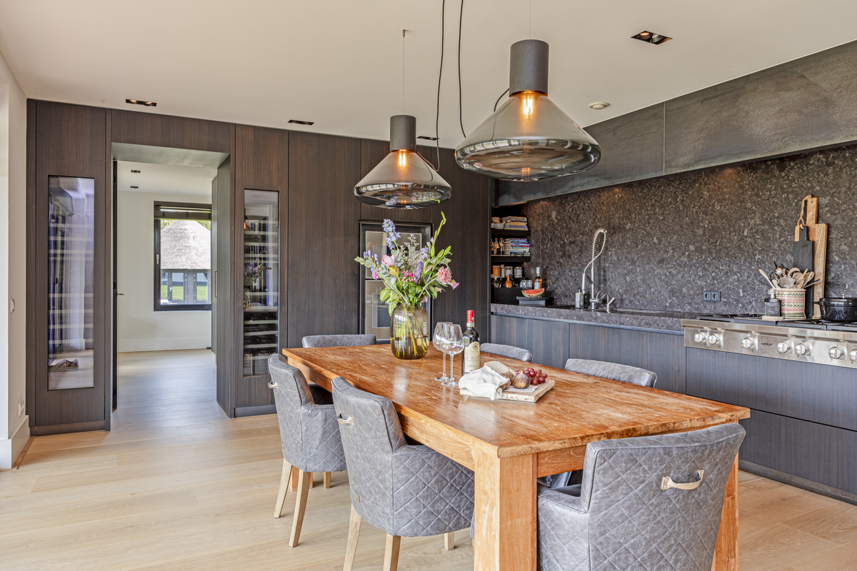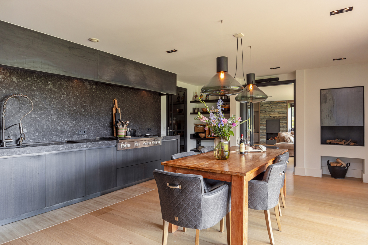 The eat-in kitchen is a great place; not only for cooking enthusiasts, but also to sit and peruse the newspaper, do homework or end the day with a drink. The fireplace gives extra atmosphere to the beautifully executed kitchen, which with the contrast of light and dark wood, combined with the fresh white stucco, forms a wonderful "clean" whole.
