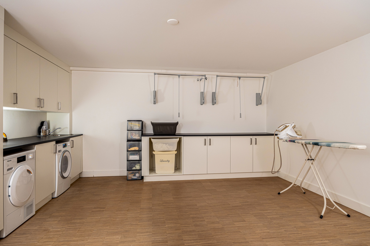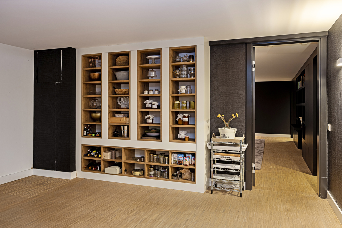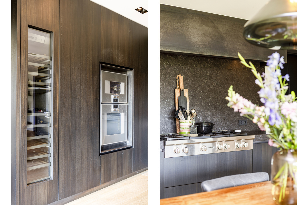 Of course, this kitchen is equipped with every conceivable convenience; a natural stone worktop, six-burner gas stove with plancha (Wolf), a sink with Quooker and sink faucet, refrigerator, convection oven and microwave, a double wine refrigerators (all Gaggenau).
