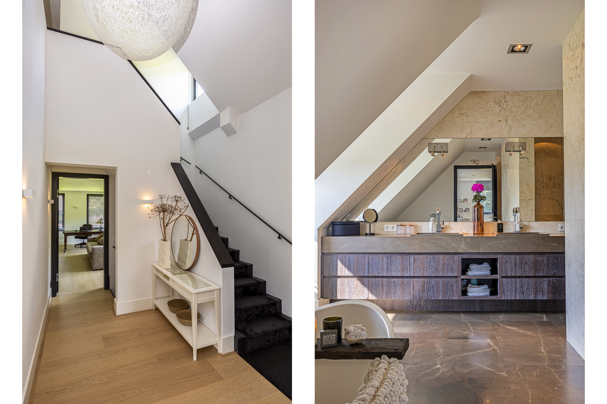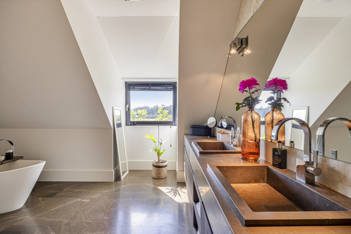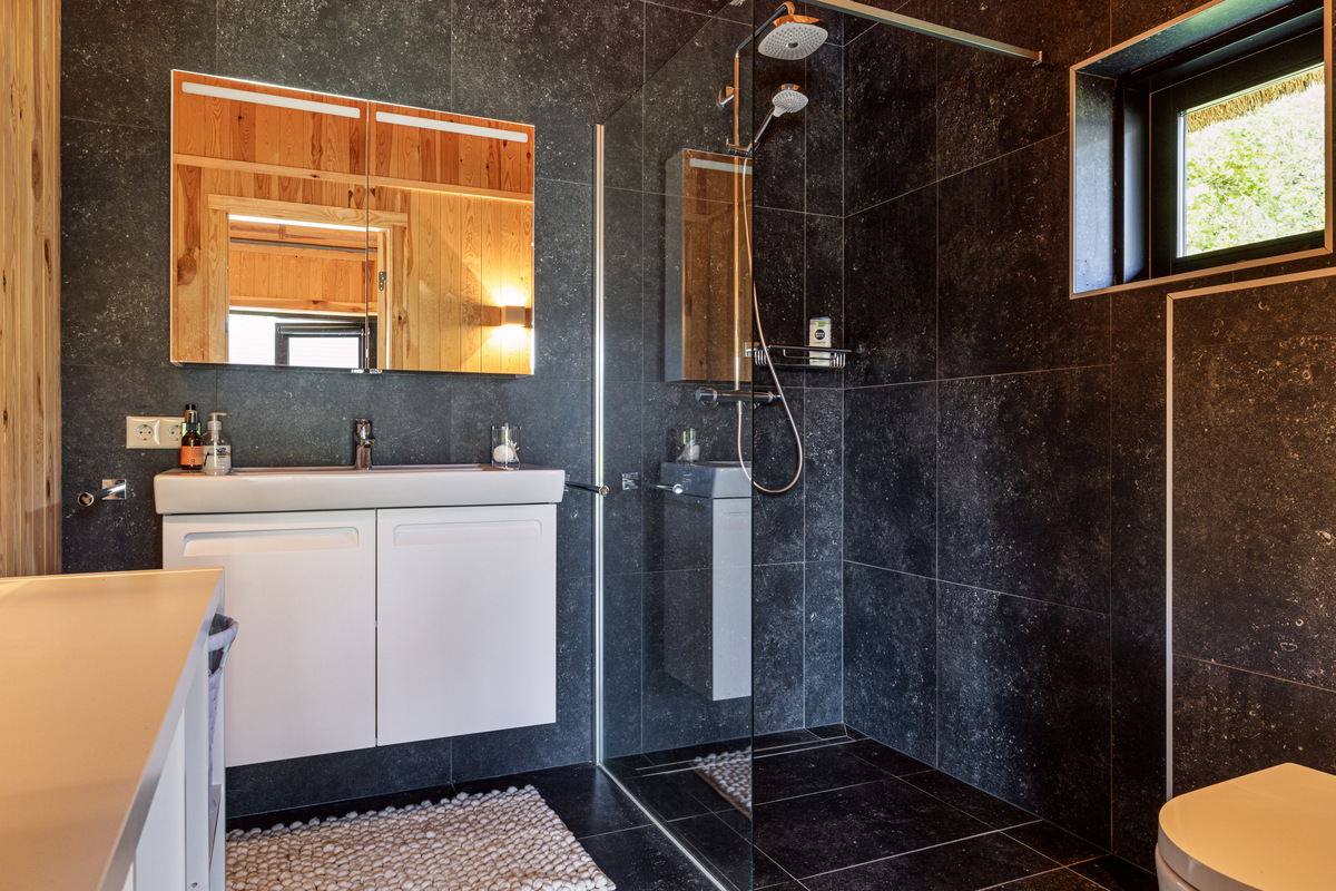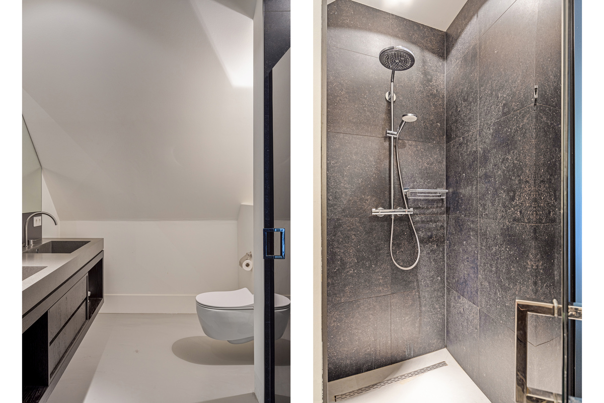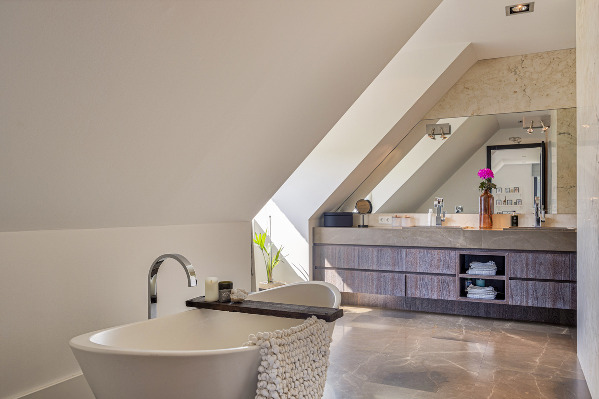 From the sleeping area, as well as from the mezzanine, access to the bathroom. As if you were stepping into your own spa, that is how this beautiful bathroom feels. A wonderful freestanding bath, a spacious walk-in shower, WC, a beautiful double sink with storage space and the dormer window, which provides lots of light.