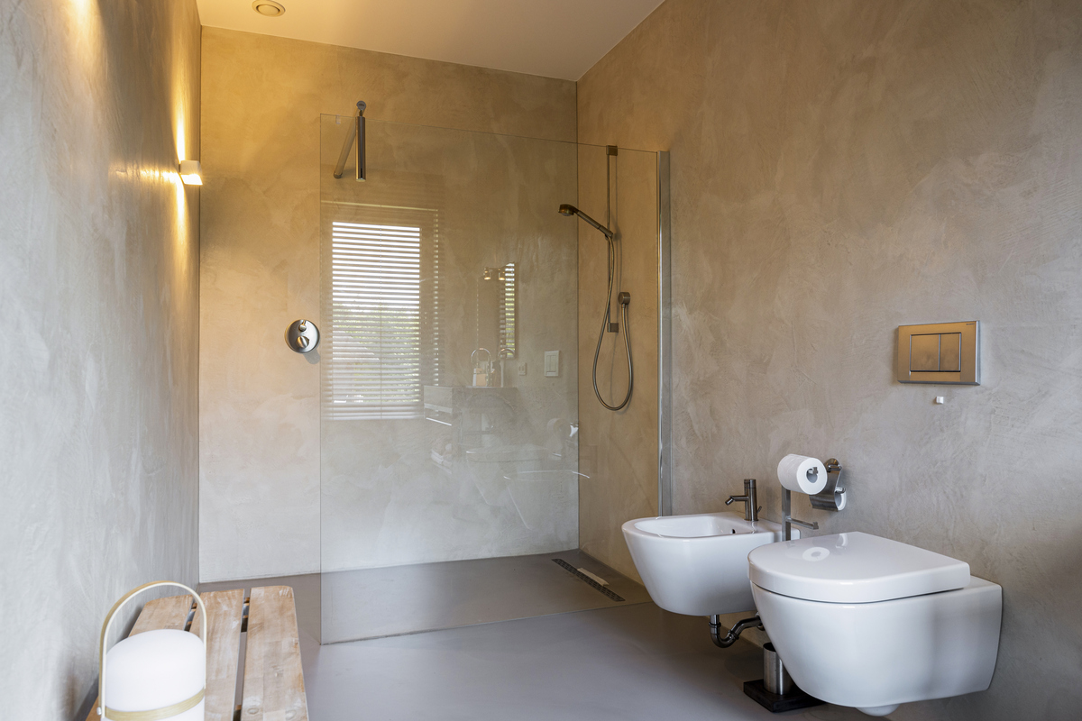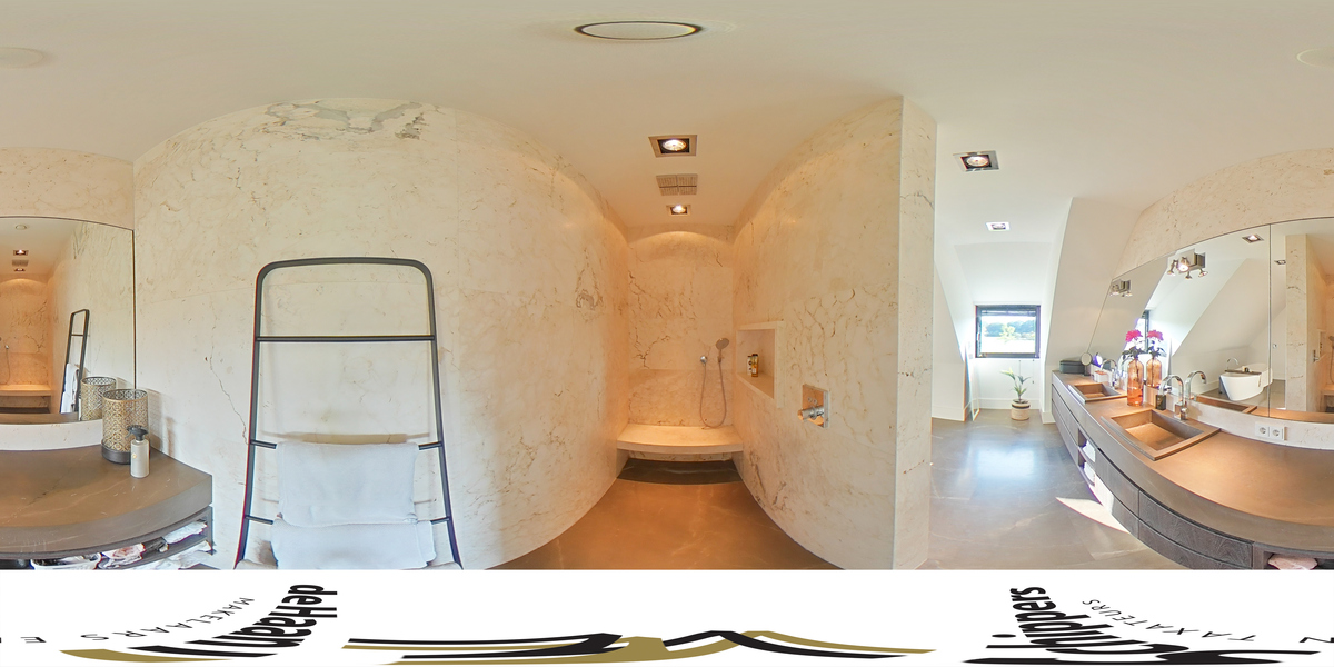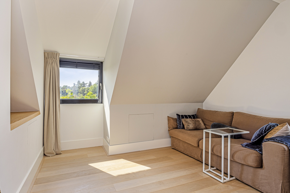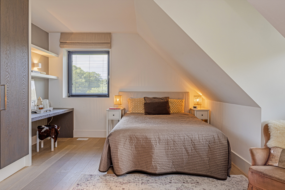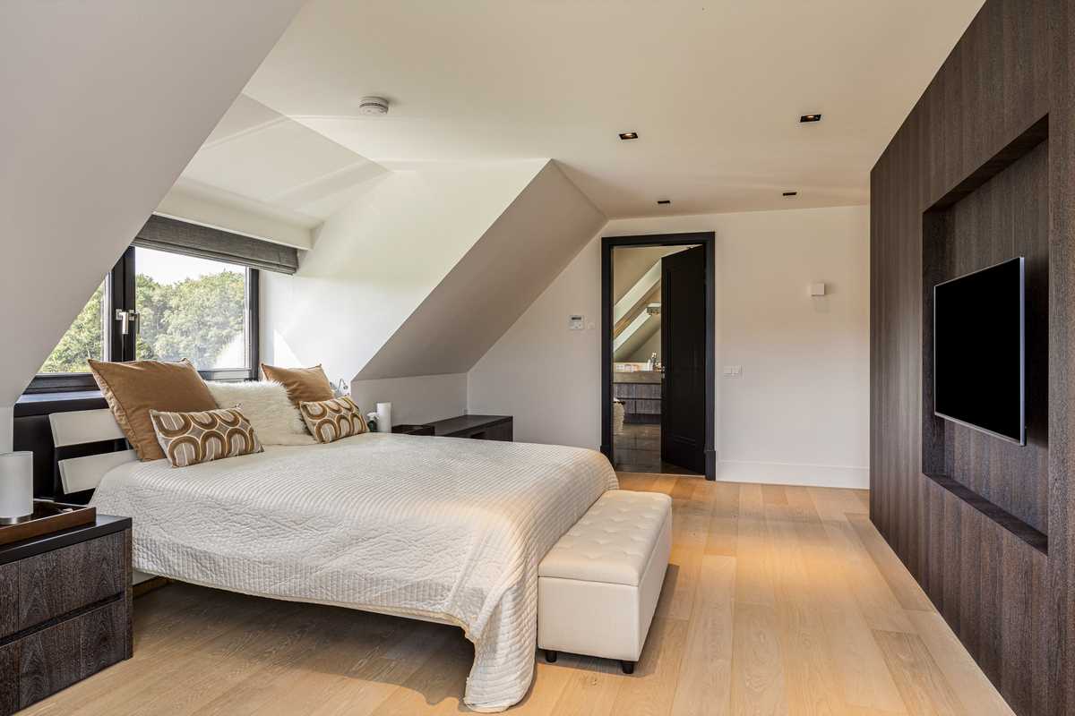 From the sleeping area, as well as from the mezzanine, access to the bathroom. As if you were stepping into your own spa, that is how this beautiful bathroom feels. A wonderful freestanding bath, a spacious walk-in shower, WC, a beautiful double sink with storage space and the dormer window, which provides lots of light.
