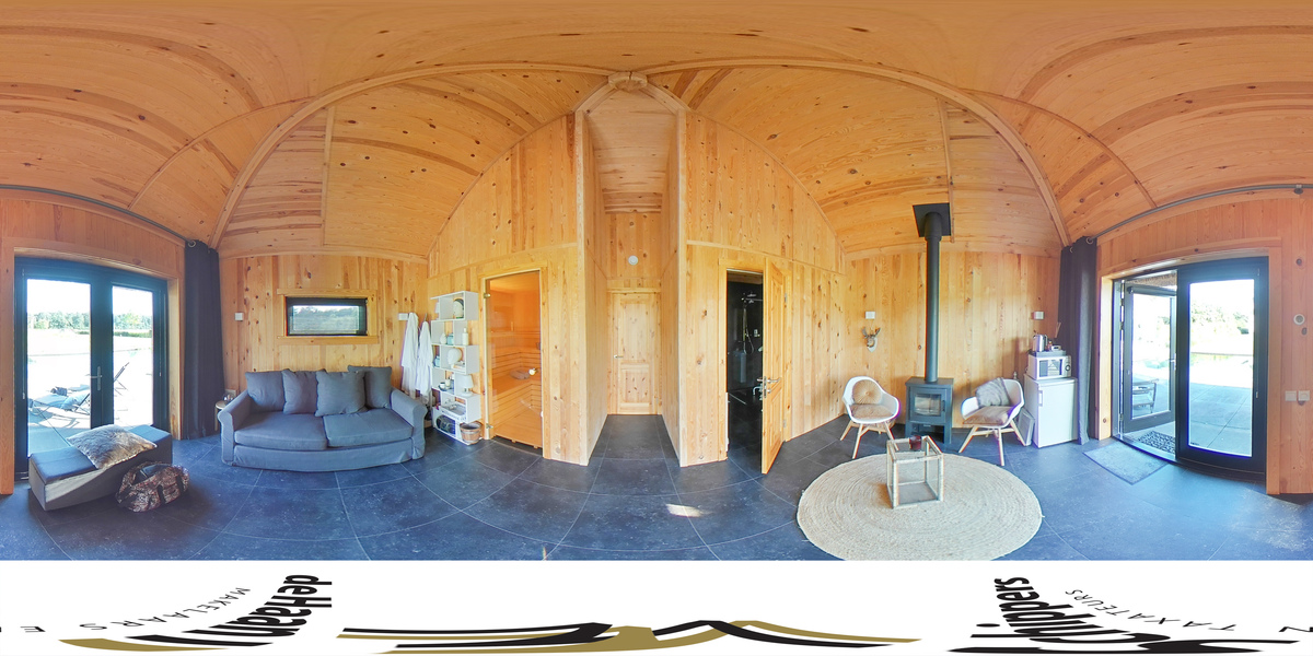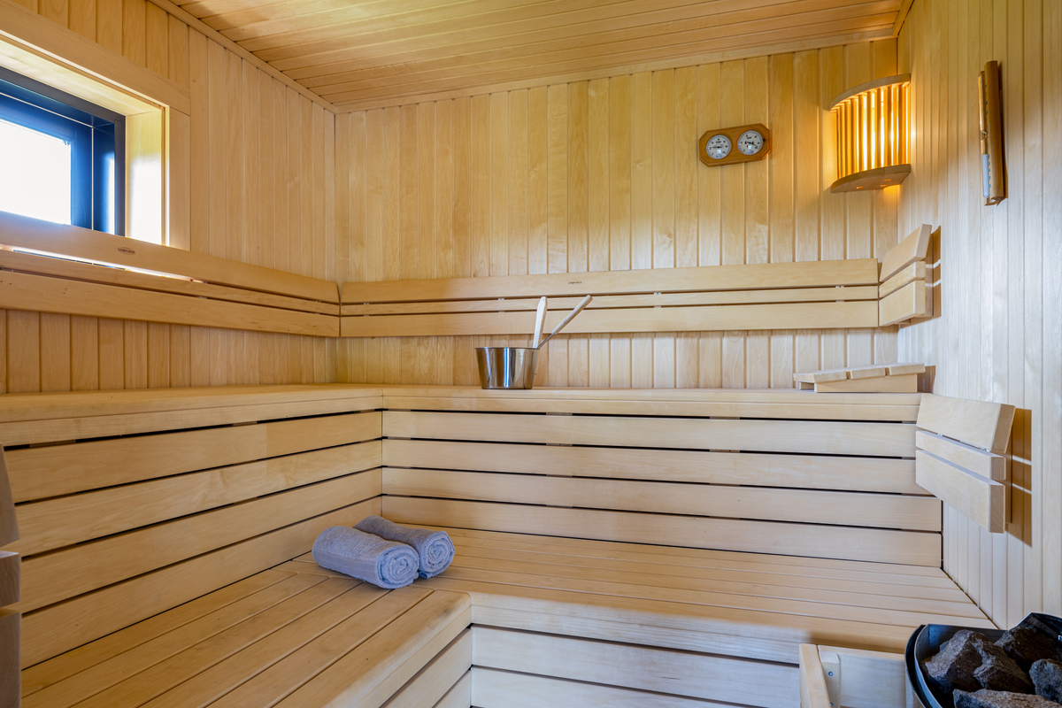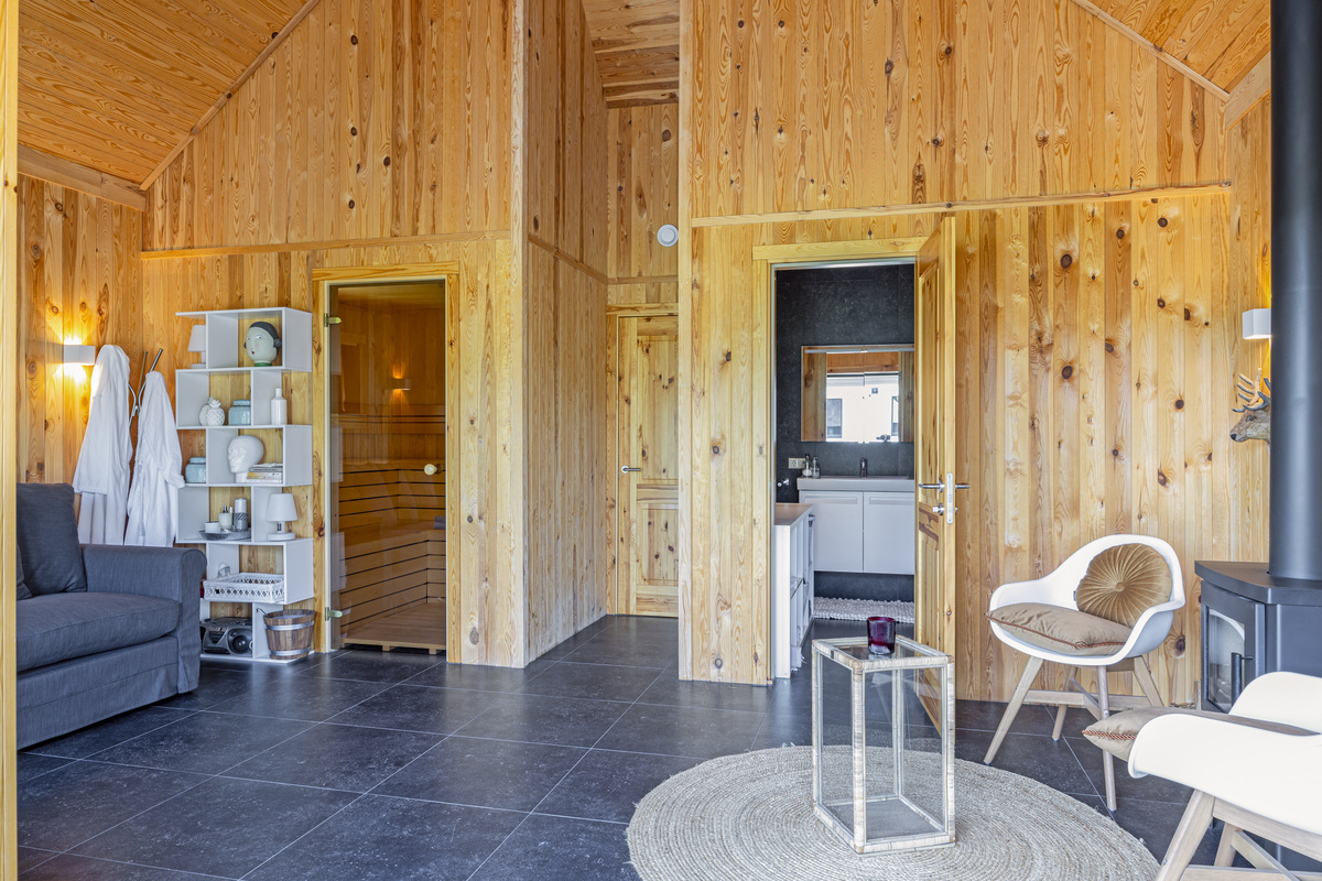 Next to the pool you will find the wellness cabin. This is made of pine wood, making it incredibly cozy and inviting looking. The floor is laid with dark natural stone tiles. The wood-burning stove also makes this a popular spot in the fall. In the wellness cabin you will find a sauna and a bathroom with WC, sink and shower.